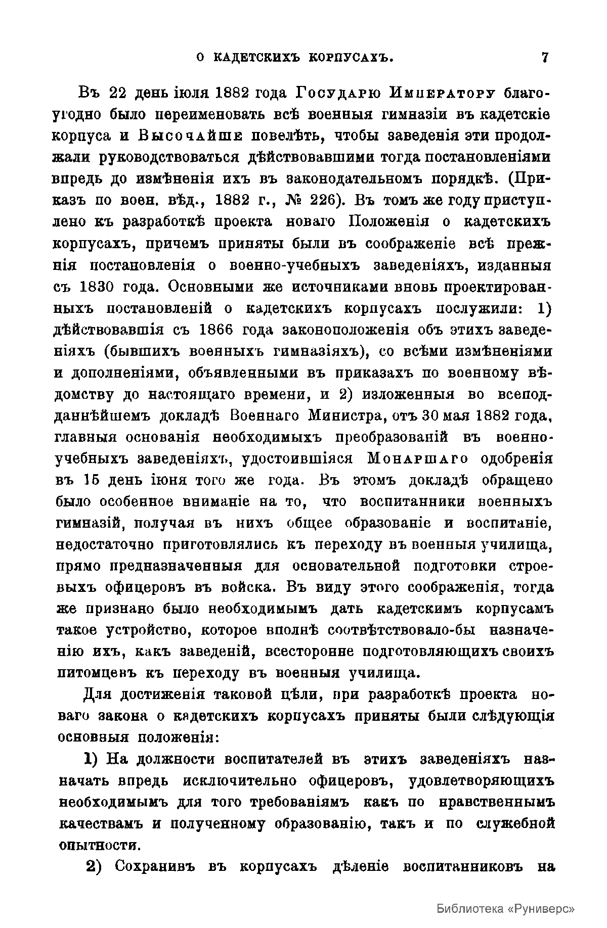 Как указывается в вводной части данного Положения, кадетские корпуса получили свой первый примерный Устав по инициативе Николая I ещё в 1830 году. После их преобразования в военные гимназии, в 1866 году было разработано новое Положение. Однако воспитанники военных гимназий, получая общее образование и воспитание, получали недостаточно серьезные военно-теоретические знания и особенно военно-практические навыки для перехода в военные училища, предназначенные для основательной подготовки строевых офицеров для службы в войсках. В силу этого, было признано необходимым вновь вернуться к созданию кадетских корпусов. В июле 1882 года по решению Александра III была проведена значительная по своим масштабам реформа военно-учебных заведений: существовавшие в период реформ Александра II военные гимназии были вновь переименованы в закрытые военно-учебные заведения начального и средне специального уровня – кадетские корпуса. Устройство кадетских корпусов более полно соответствовало их назначению как военно-учебных заведений, всесторонне готовящих своих питомцев к переходу в военные училища. Для достижения этой цели и было принято Положение о кадетских корпусах. В нем были отражены следующие основополагающие начала. Во-первых, на должности офицеров-воспитателей в этих заведениях назначались офицеры, удовлетворяющие необходимым для этого требованиям как по нравственным качествам и полученному образованию, так и по службе. Во-вторых, в кадетских корпусах сохранялось деление воспитанников по возрастам, с присвоением им наименования рот и назначением в каждой из них ротного командира из числа наиболее опытных наставников, обязанных направлять служебную деятельность отделенных офицеров-воспитателей вверенной ему роты, а также заведовать ее имуществом. В-третьих, подготовка строевого обучения кадет возлагалась непосредственно на отделенных офицеров-воспитателей под руководством ротного командира. В-четвертых, в летний период обучения кадеты двух старших классов в составе строевой роты выводились в летние учебные лагеря, где они занимались в основном прикладными военными упражнениями. В-пятых, признавалось необходимым всестороннего усиления физического воспитания кадет, призванного всячески усилить воинскую дисциплину и боевую выучку, необходимых будущему офицеру. В-шестых, для замещения унтер-офицерских мест в ротном строю и для исполнения обязанностей старших кадет назначались лучшие воспитанники последнего – седьмого класса в должности вице-фельдфебеля и вице-унтер-офицеров строевой роты. Наконец, признавалось целесообразным сохранить в кадетских корпусах тот же общеобразовательный учебный курс, каким он был в военных гимназиях. К концу XIX века в России существовало уже 22 кадетских корпуса.
