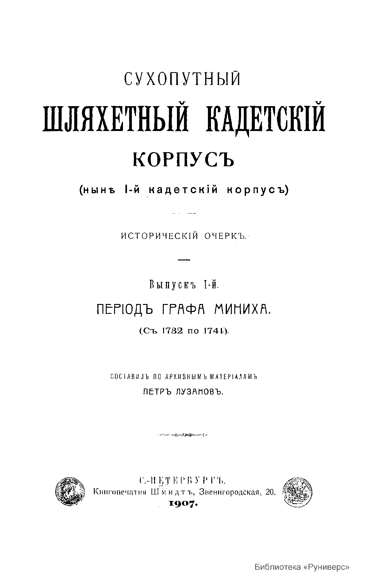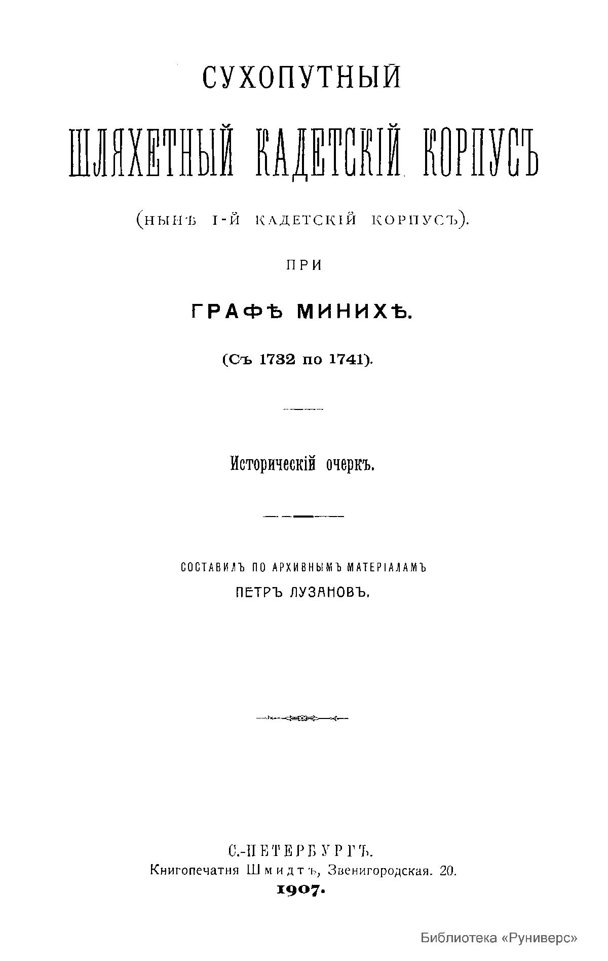 Исторический очерк, написанный в 1907 г. военным юристом, генерал-лейтенантом Петром Фомичем Лузановым и приуроченный к 175-й годовщине со дня основания 1-го Кадетского корпуса (под разными наименованиями – 1732 – 1918 гг.), чьим воспитанником являлся сам автор. В очерке основное место отведено периоду 1732 – 1741 гг., когда данное военно-учебное заведение носило наименование Сухопутного шляхетского кадетского корпуса. В нем изложена история Корпуса. В качестве приложений даны официальные документы, связанные с ним, а также списки выпускников Корпуса в названный период.