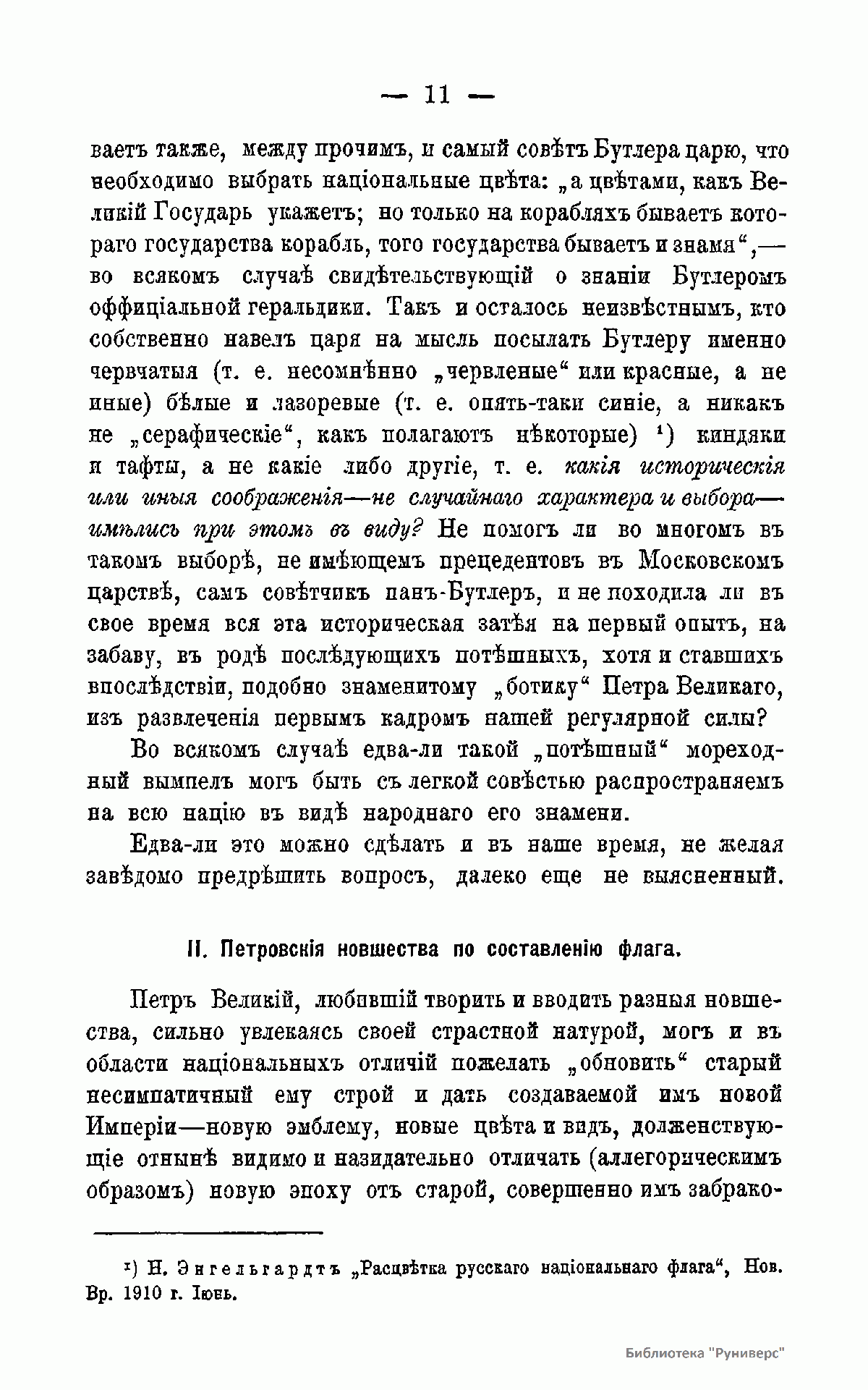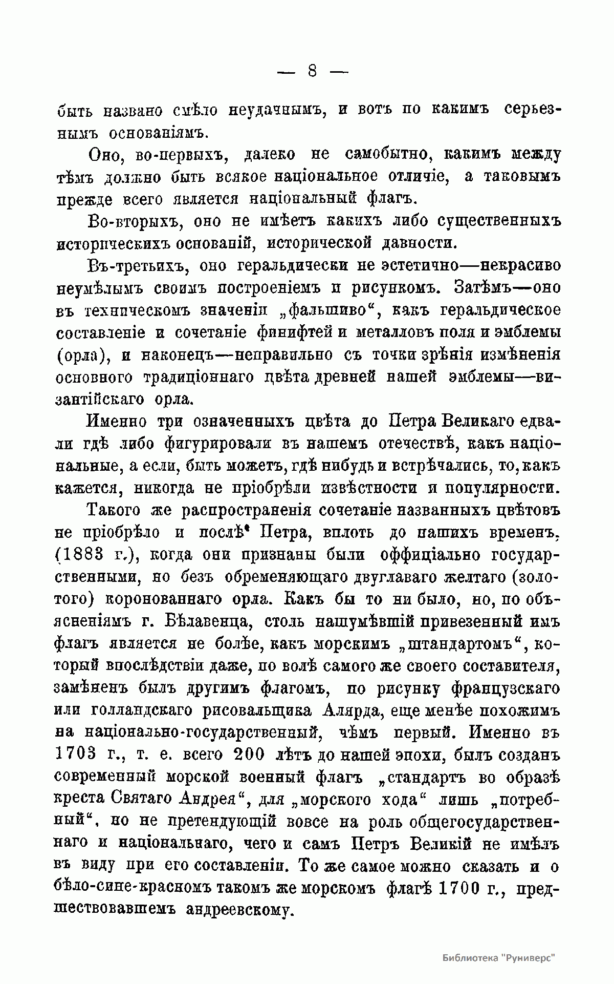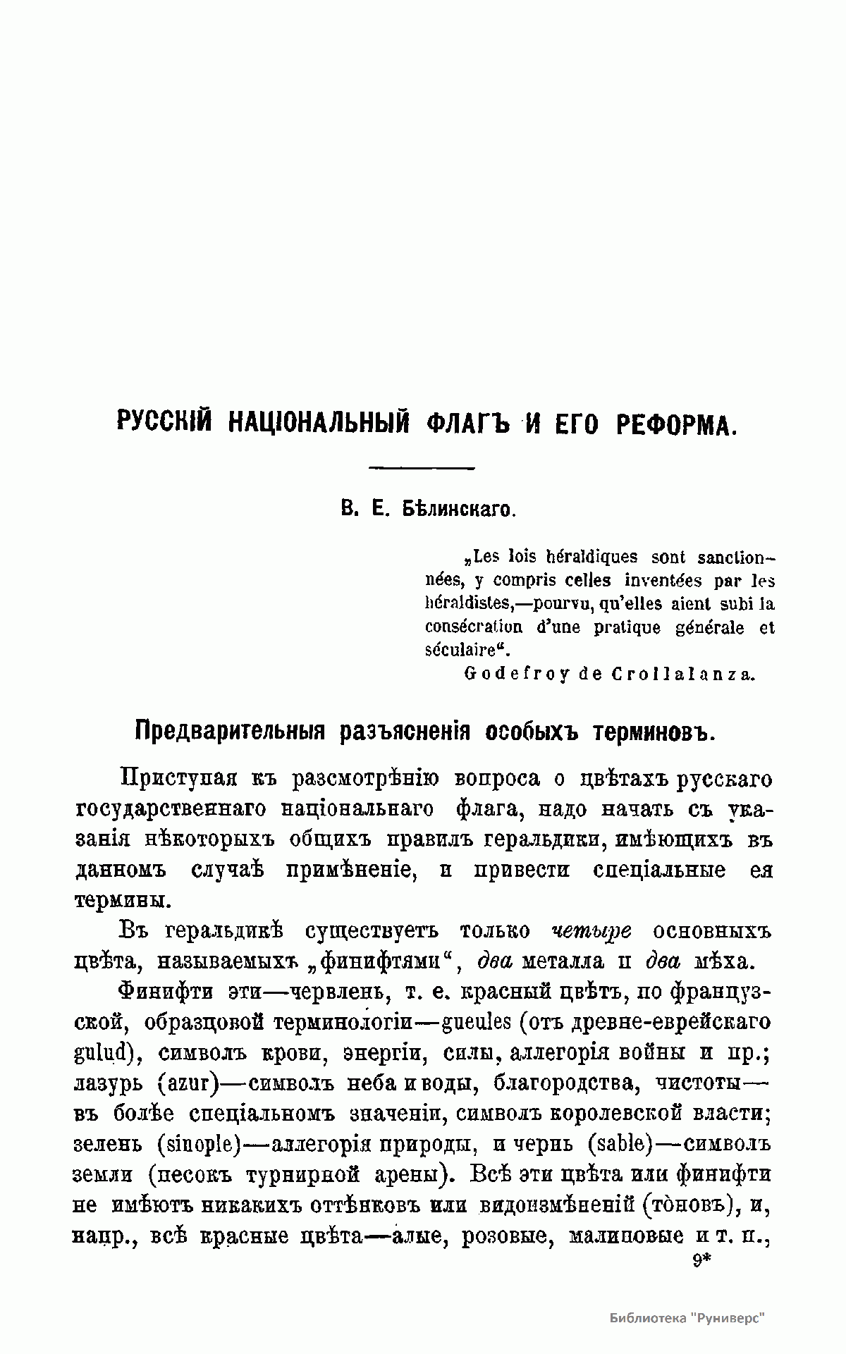 Издание адресовано тем, кто интересуется геральдикой. Автор рассматривает следующие вопросы: 1. Общие правила геральдики, разъяснение особых терминов. 2. Трехцветный флаг. 3. Петровские новшества по составлению флага. 4. Петровский стандарт, привезенный из Архангельска. 5. Другие отрицательные качества Архангельского трехцветного стандарта и ему подобных. 6. Цвета национального флага. 7. Характерность национального флага как важное условие его популярности. 8. Двуглавый российский орел и его применение на флаге. 9. Проекты реформ национального флага. 10. Военный флаг и флаги других ведомств. 11. Неправильности изображение национальных отличий.