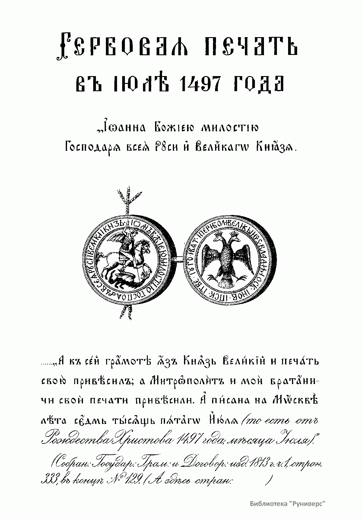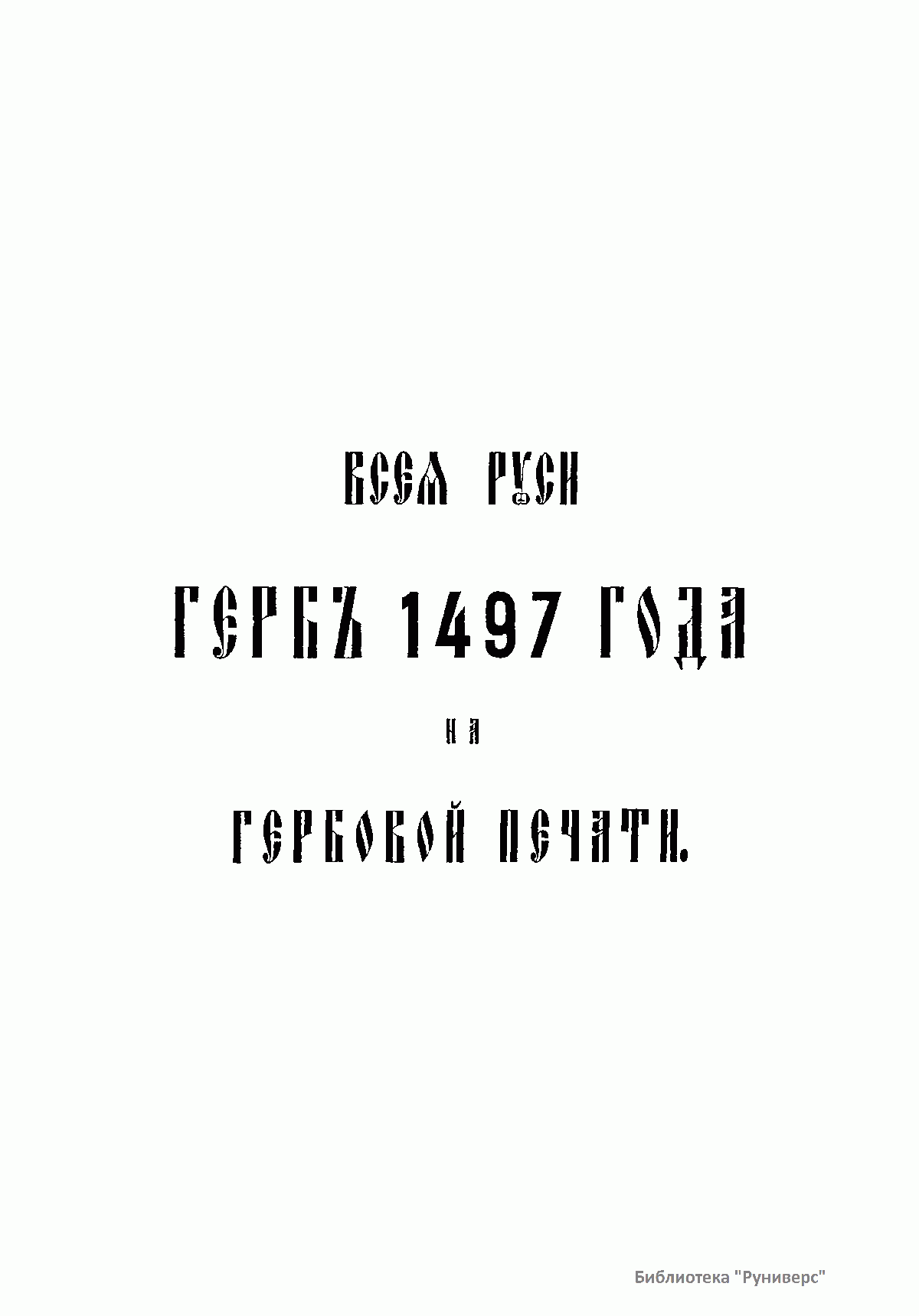 В июле 1897 года исполнилось 400 лет Российскому государственному гербу. Герб – это символ государства, выражающий его отличительную идею и основы. «Каждому русскому гражданину, сознательно относящемуся к основным историческим формам русского государственного строя, естественно почтить вниманием столь продолжительную долговечность отличительно русского символа». Автор настоящего издания считает гербоведение важной отраслью исторической науки и посвящает свой труд истории Российского герба, тесно связанной с историей печатей московских государей, восходящей до отдаленных времен договоров древних руссов с греками.