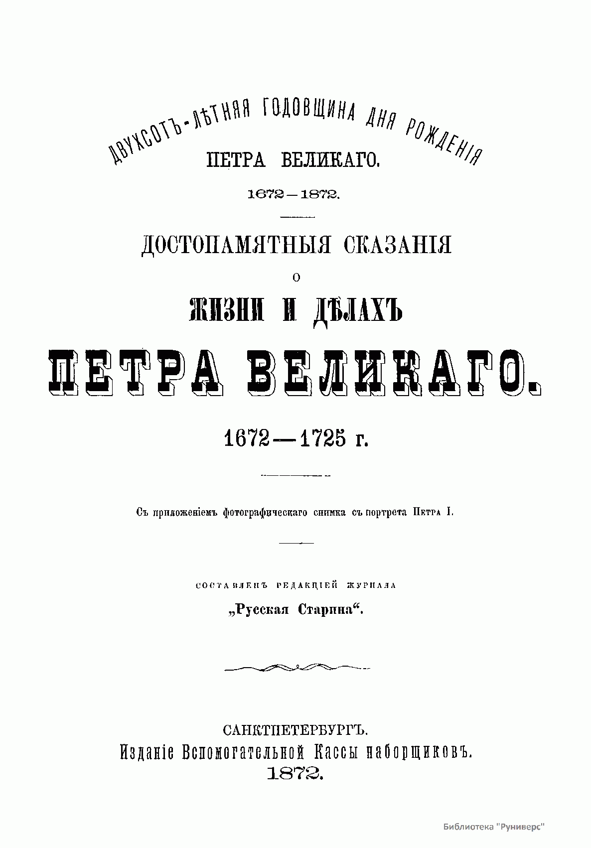 Двухсотъ-лѣтняя годовщина дня рожденiя Петра Великаго. 1672-1872. Достопамятныя сказанiя жизни и дѣлахъ Петра Великаго 1672-1725 г.
