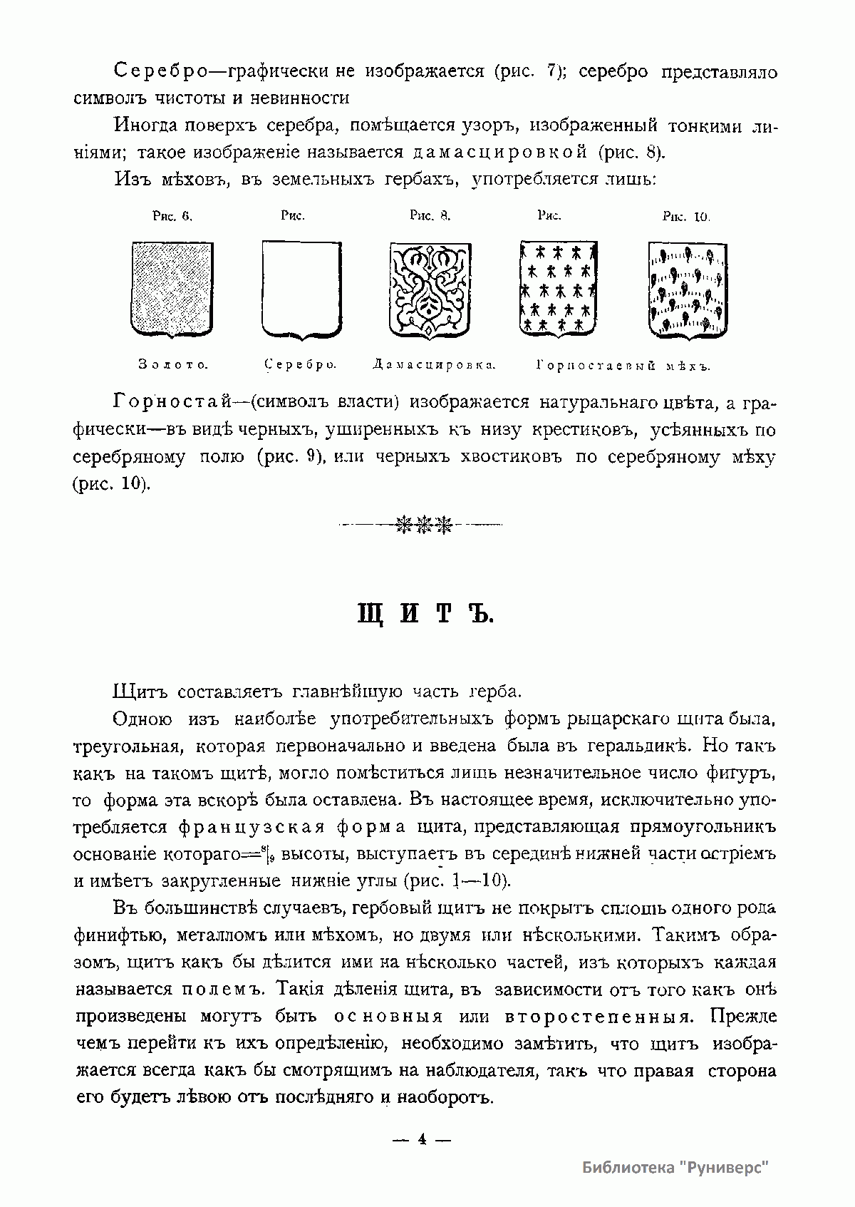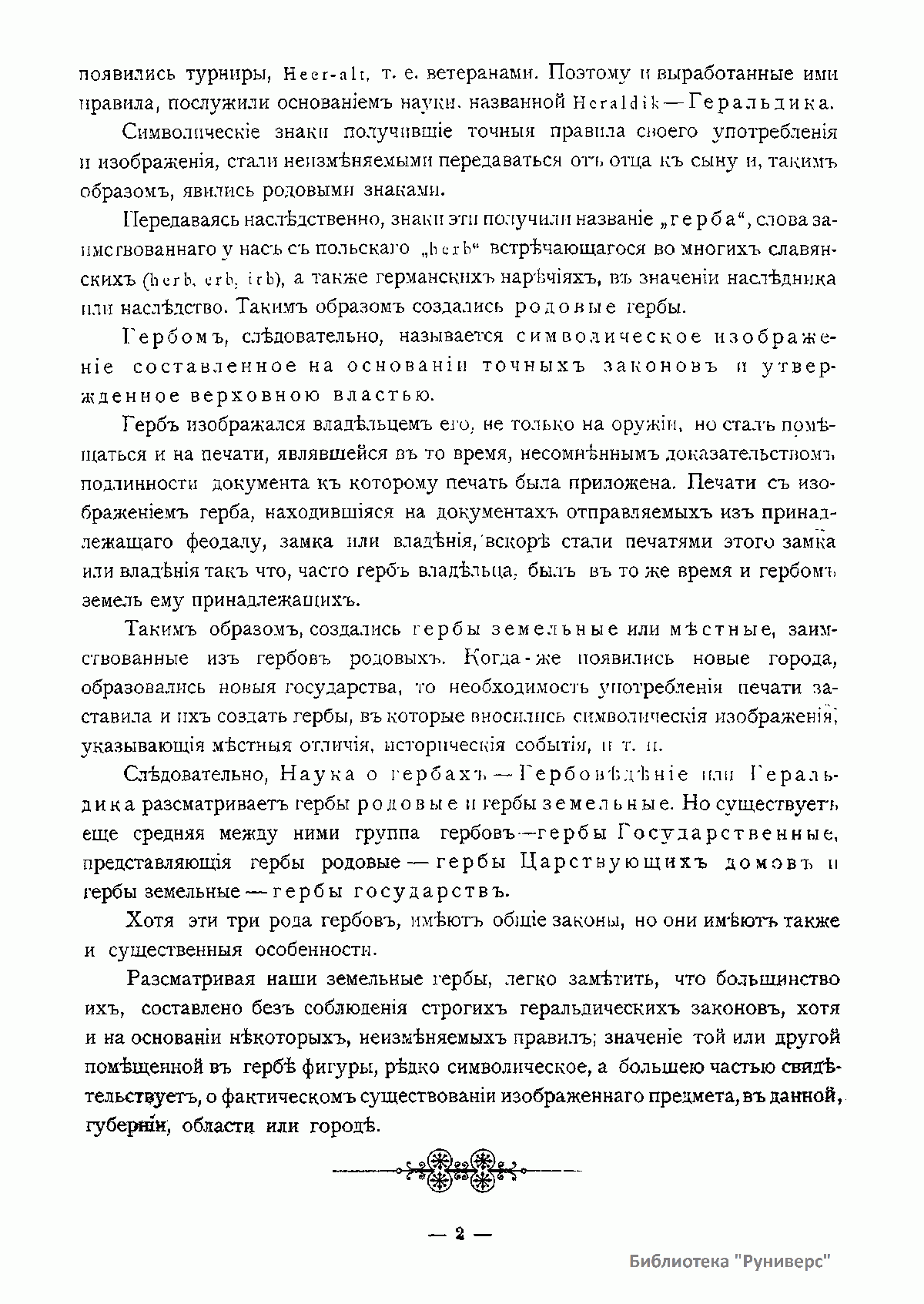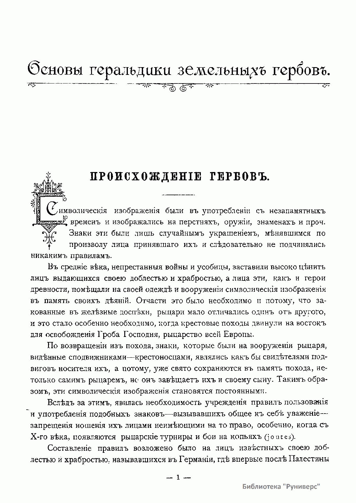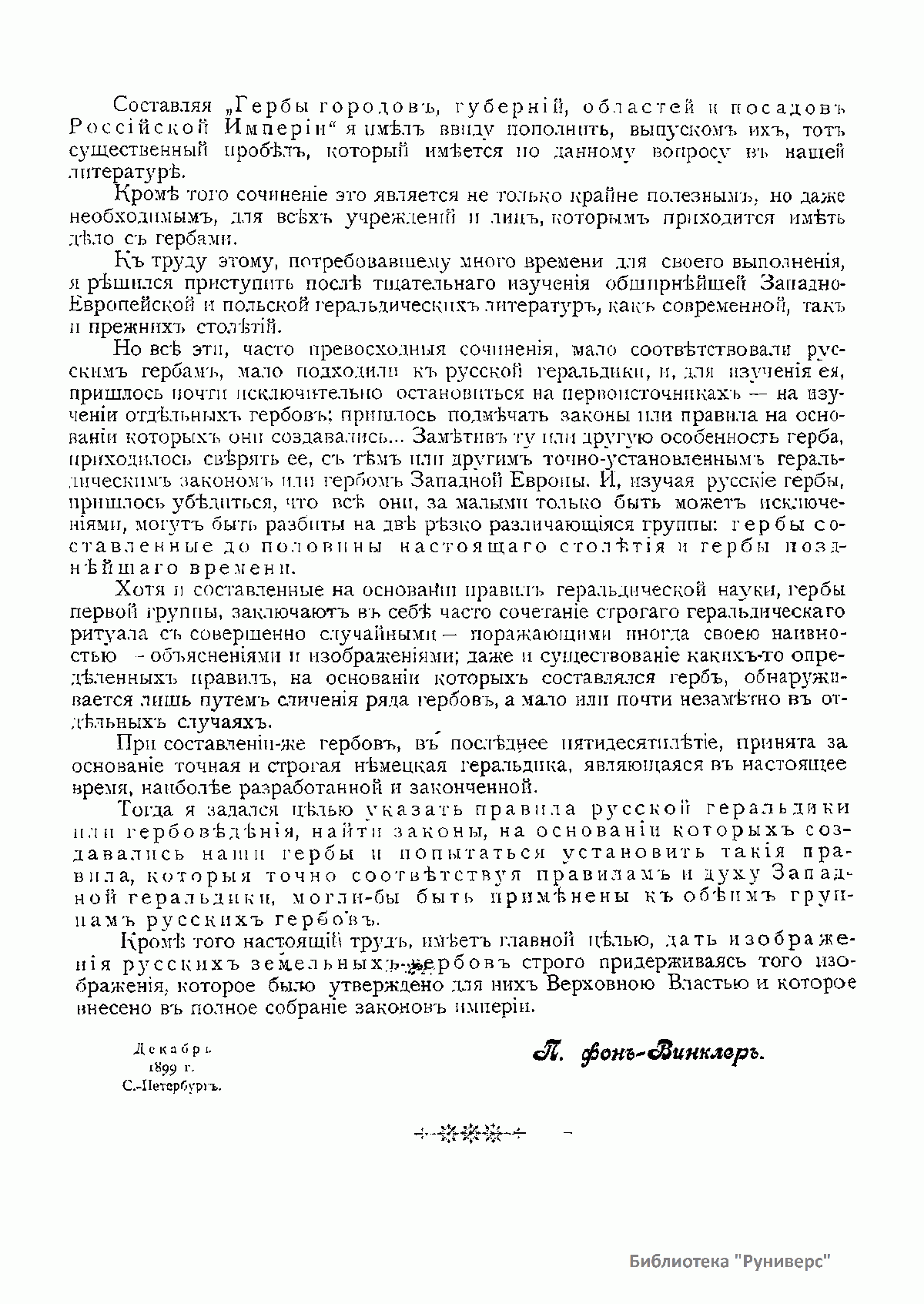 Настоящий труд имеет главной целью дать изображение русских земельных гербов, строго придерживаясь того изображения, которое было утверждено для них верховной властью и которое внесено в полное собрание законов Российской империи. Кроме того, автор задался целью указать правила русской геральдики или гербоведения, найти законы, на основании которых создавались наши гербы, и попытаться установить такие правила, которые, точно соответствуя правилам и духу западной геральдики, могли бы быть применены ко всем русским гербам. К своему труду автор приступил после тщательного изучения обширной западноевропейской и польской геральдической литературы – как современной, так и прежних столетий. Он сделал вывод о том, что все эти сочинения мало подходят к русской геральдике. Для ее изучения автору пришлось останавливаться исключительно на первоисточниках – изучать отдельные гербы.