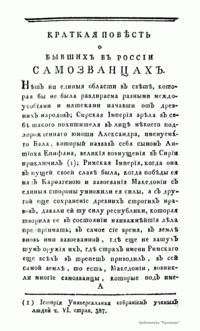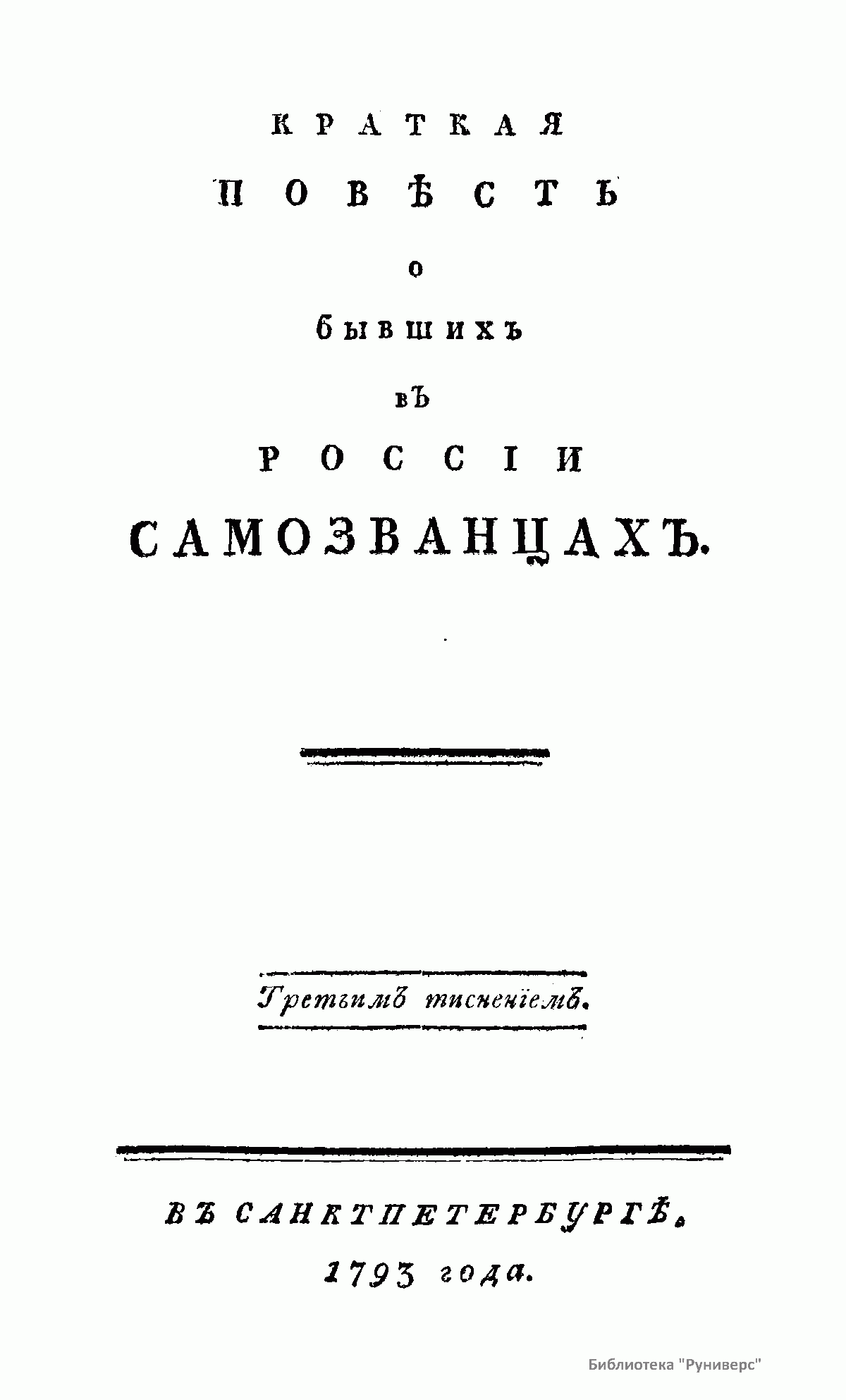 Самозванчество не представляет собой чисто русского явления, но ни в какой другой стране явление это не было столь частым и не играло бы столь значительной роли в истории русского народа. Историю России нельзя написать, обходя проблему самозванчества. По словам Ключевского, «у нас с легкой руки первого Лжедмитрия самозванство стало хронической болезнью государства: с тех пор чуть не до конца восемнадцатого века редкое царствование проходило без самозванца». Данное издание 1793 года не решает проблему самозванчества, но дает много выразительных подробностей о бывших в России самозванцах.