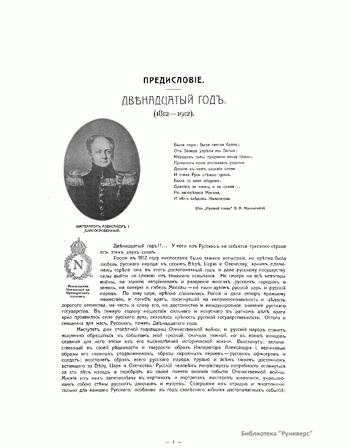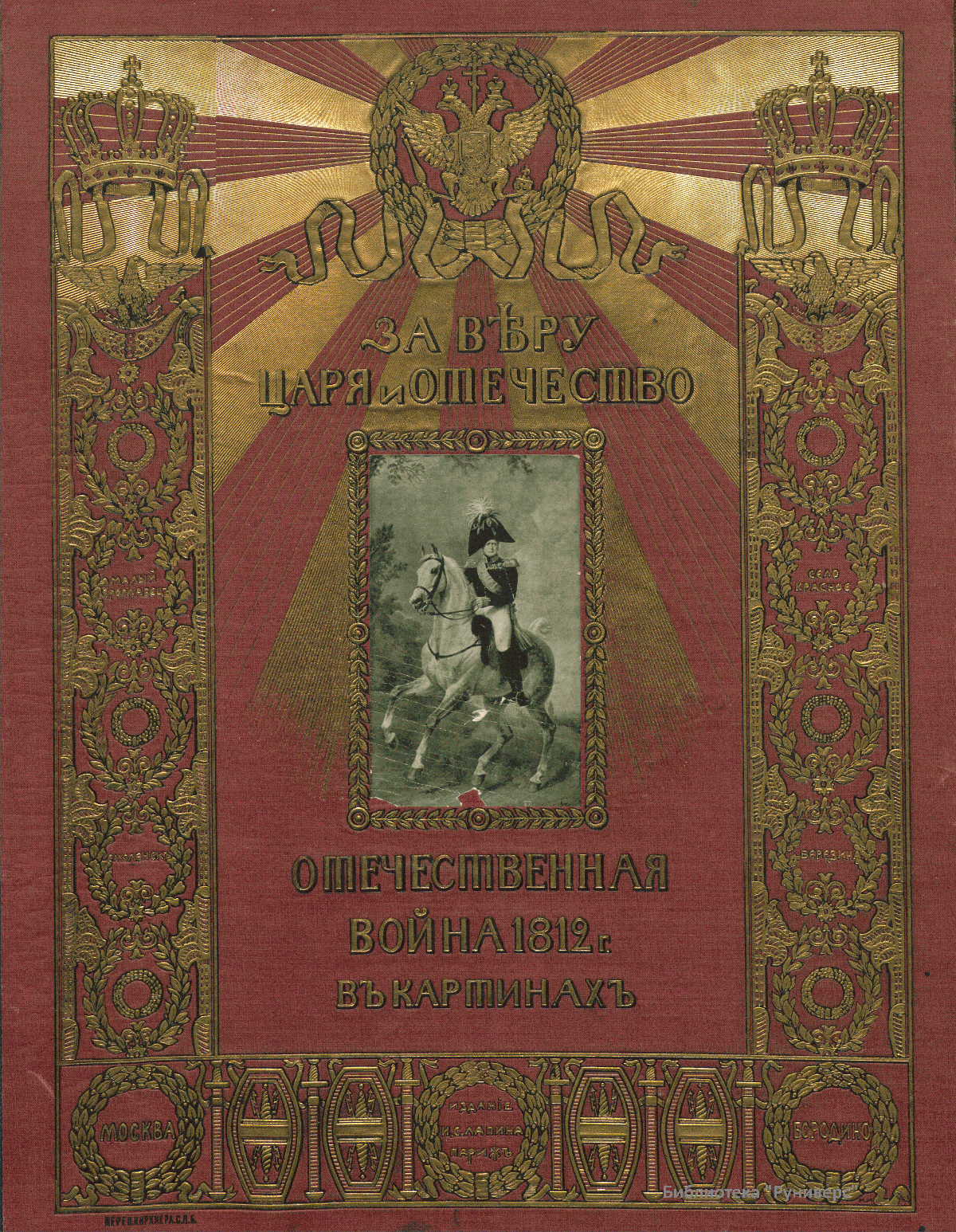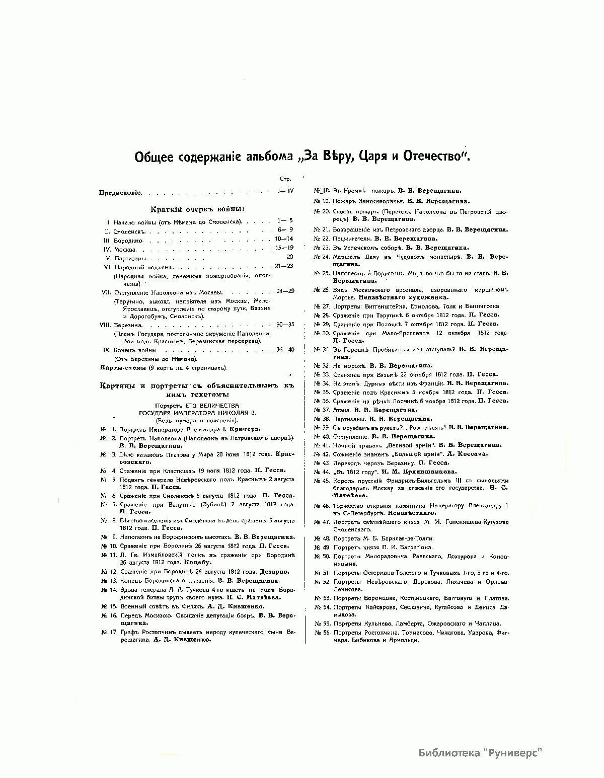 Книга издана в Париже в 1912 году к столетию Отечественной войны 1812 года. Издание состоит из собрания картин и портретов. Все картины (43) в красках, часть портретов (18) тоже в красках, остальные (23) черно-белые. Каждая картина напечатана на отдельном листе, шесть больших портретов напечатаны тоже на больших листах. Остальные портреты (35) сгруппированы по четыре на листе, и один лист имеет семь портретов. Все картины и портреты снабжены пояснительным текстом, напечатанным на прозрачной бумаге, и принадлежат кисти известных художников. Это собрание предваряет краткий очерк Отечественной войны с девятью картами-схемами и иллюстрациями. 84 иллюстрации представляют собой снимки со старинных гравюр и изданий, некоторых музейных предметов, гербов, монограмм и пр. В своей работе издатель и составитель руководствовались одним «задушевным желанием»: дать русскому человеку краткое и наглядное пособие, которое предоставило бы ему возможность оглянуться на сто лет назад, вспомнить, продумать и прочувствовать великие события 1812 года. «Россия в 1812 году окончательной своей победой более всего обязана высокому душевному настроению царя и его народа. И потомкам героев 1812 года не иначе как сердцем понять великие события этого года. Пусть это художественное издание и говорит сердцу русского человека».