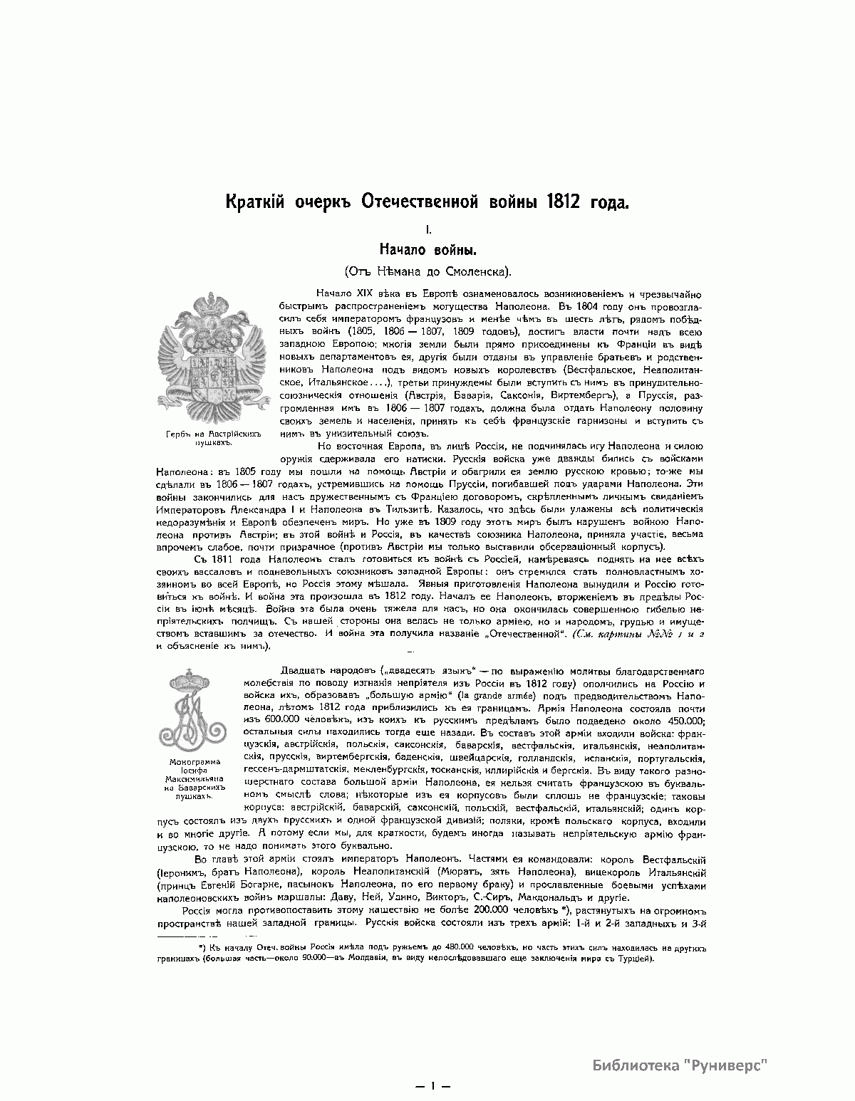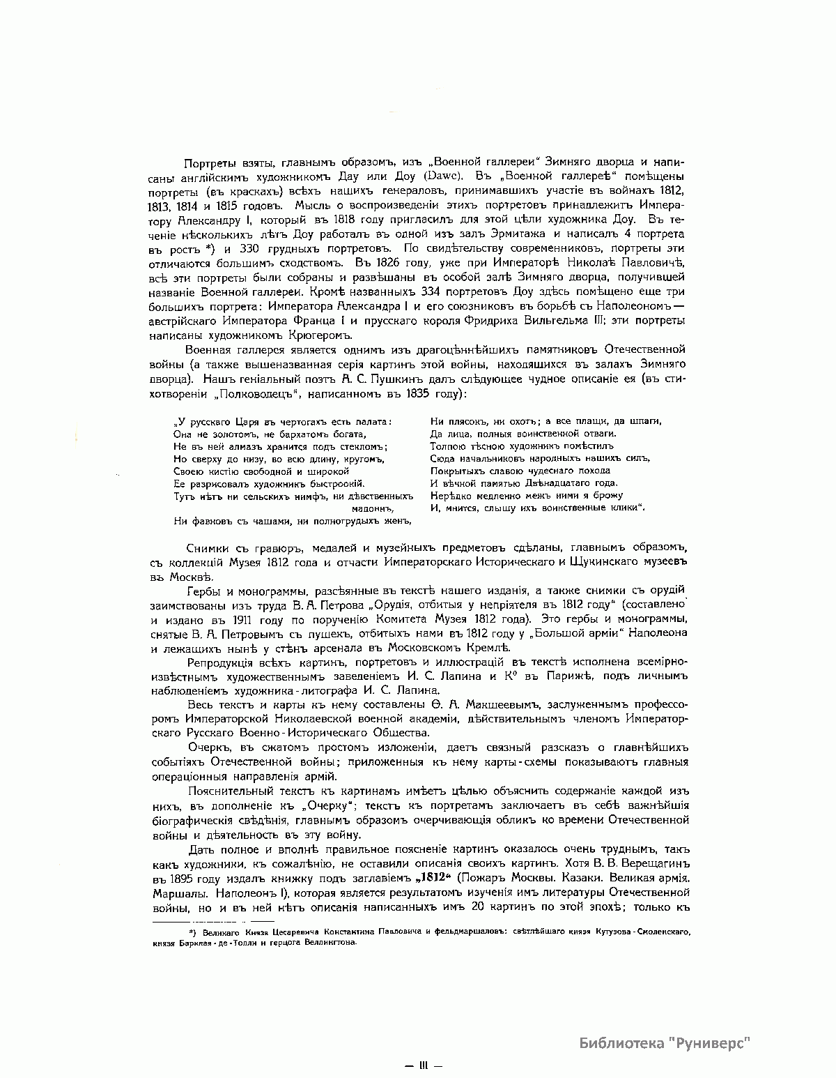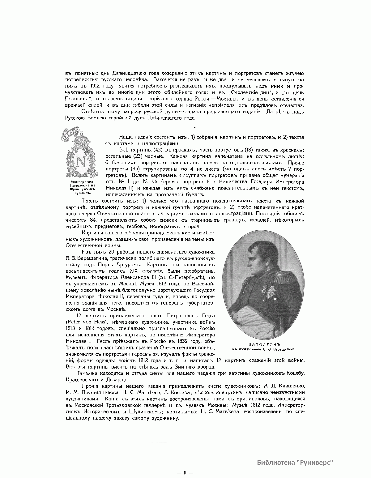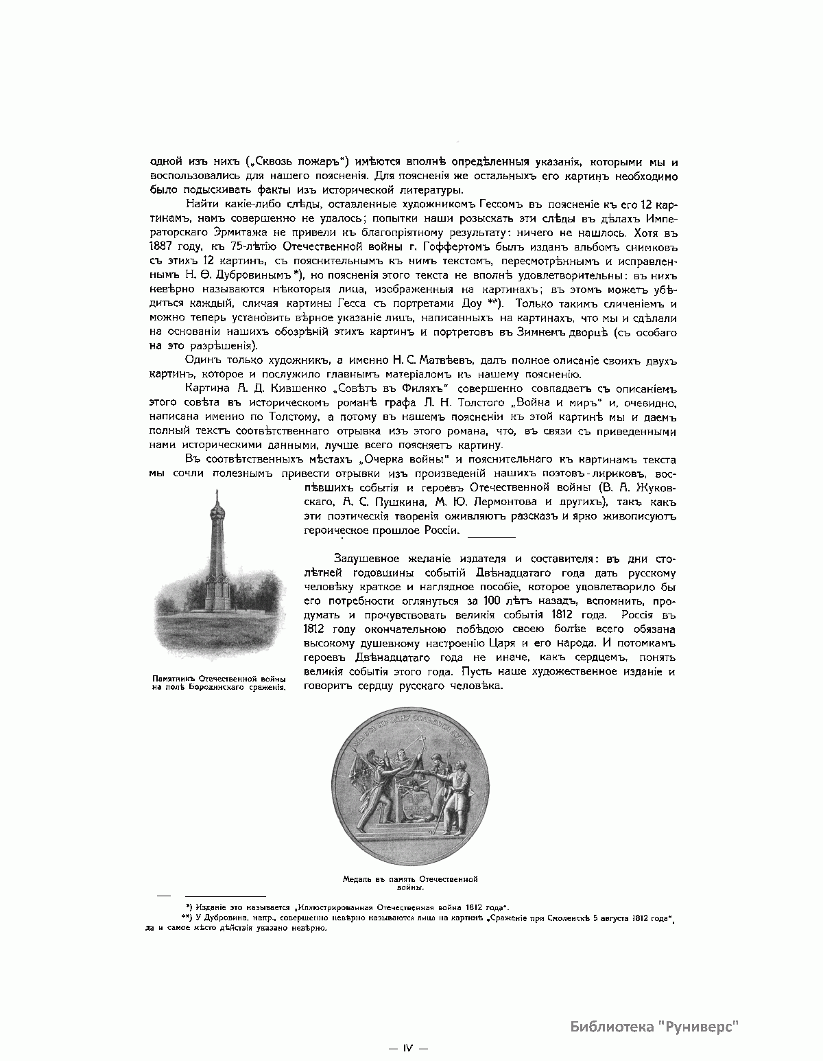 Книга издана в Париже в 1912 году к столетию Отечественной войны 1812 года. Издание состоит из собрания картин и портретов. Все картины (43) в красках, часть портретов (18) тоже в красках, остальные (23) черно-белые. Каждая картина напечатана на отдельном листе, шесть больших портретов напечатаны тоже на больших листах. Остальные портреты (35) сгруппированы по четыре на листе, и один лист имеет семь портретов. Все картины и портреты снабжены пояснительным текстом, напечатанным на прозрачной бумаге, и принадлежат кисти известных художников. Это собрание предваряет краткий очерк Отечественной войны с девятью картами-схемами и иллюстрациями. 84 иллюстрации представляют собой снимки со старинных гравюр и изданий, некоторых музейных предметов, гербов, монограмм и пр. В своей работе издатель и составитель руководствовались одним «задушевным желанием»: дать русскому человеку краткое и наглядное пособие, которое предоставило бы ему возможность оглянуться на сто лет назад, вспомнить, продумать и прочувствовать великие события 1812 года. «Россия в 1812 году окончательной своей победой более всего обязана высокому душевному настроению царя и его народа. И потомкам героев 1812 года не иначе как сердцем понять великие события этого года. Пусть это художественное издание и говорит сердцу русского человека».