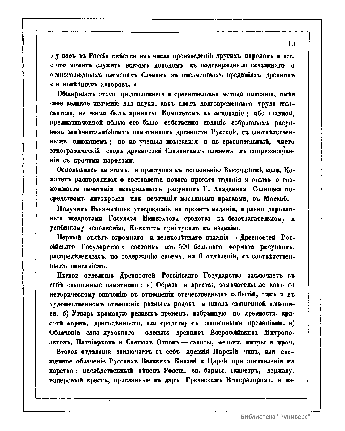 Авторы настоящего издания считают, что время охранения памятников России настало со вступления на престол Императора Николая I. Повелевая хранить памятники и остатки русских древностей, он приказал все, что заслуживает внимание и составляет материал истории, отчетливо срисовать, описать и издать. Император повелел учредить в Москве Комитет издания древностей Российского государства. Первый отдел огромного и великолепного издания «Древности Российского государства» состоит из 500 большого формата рисунков, распределенных по своему содержанию на шесть частей с соответствующим описанием. Первая часть «Древностей» заключает в себе священные памятники: а) образа и кресты, замечательные в историческом и художественном отношении, б) храмовую утварь разных времен, в) облачения духовного сана. Вторая часть содержит древний царский чин, или священное облачение русских великих князей и царей при поставлении на царство. В третьей части представлена древняя броня и оружие. Четвертую часть составляют древние великокняжеские, царские, боярские и местные народные одежды в изображениях и портретах. В пятой части можно увидеть древнюю царскую столовую утварь. Шестая часть состоит из памятников древнего русского зодчества.