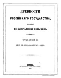 Авторы настоящего издания считают, что время охранения памятников России настало со вступления на престол Императора Николая I. Повелевая хранить памятники и остатки русских древностей, он приказал все, что заслуживает внимание и составляет материал истории, отчетливо срисовать, описать и издать. Император повелел учредить в Москве Комитет издания древностей Российского государства. Первый отдел огромного и великолепного издания «Древности Российского государства» состоит из 500 большого формата рисунков, распределенных по своему содержанию на шесть частей с соответствующим описанием. Первая часть «Древностей» заключает в себе священные памятники: а) образа и кресты, замечательные в историческом и художественном отношении, б) храмовую утварь разных времен, в) облачения духовного сана. Вторая часть содержит древний царский чин, или священное облачение русских великих князей и царей при поставлении на царство. В третьей части представлена древняя броня и оружие. Четвертую часть составляют древние великокняжеские, царские, боярские и местные народные одежды в изображениях и портретах. В пятой части можно увидеть древнюю царскую столовую утварь. Шестая часть состоит из памятников древнего русского зодчества.