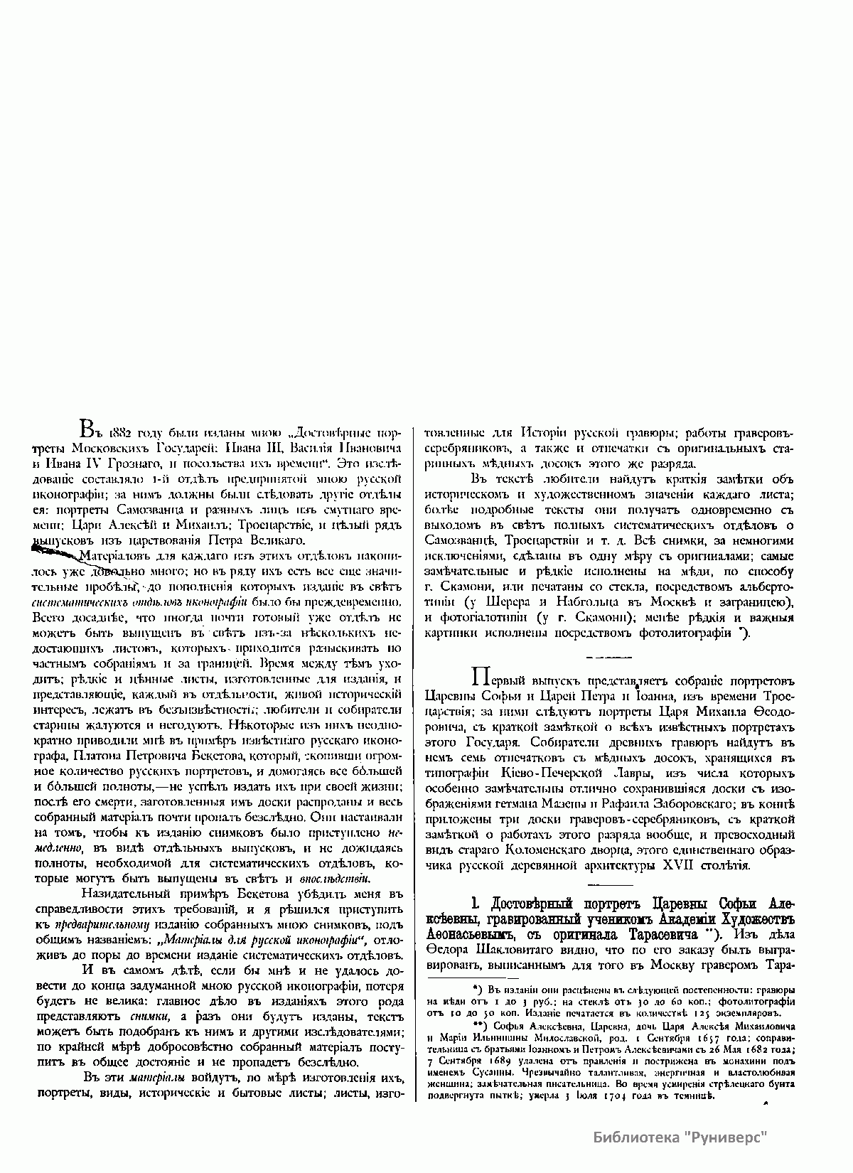 В 1882 г. Д. Ровинский издал книгу «Достоверные портреты московских государей: Ивана III, Василия Ивановича и Ивана IV Грозного – и посольства их времени». Это исследование составляло первый отдел предпринятой автором русской иконографии. За ним должны были следовать другие отделы. Материалов для каждого из этих отделов накопилось довольно много, но тем не менее существовали еще значительные пробелы, которые не позволяли приступить к систематическому изданию. Но так как любители и собиратели старины настаивали на издании, автор приступил к предварительной публикации собранных им снимков под общим названием «Материалы для русской иконографии». В эти материалы вошли портреты, виды, исторические и бытовые листы, листы, изготовленные для истории русской гравюры, работы граверов-серебряников, а также отпечатки с оригинальных старинных медных досок. Все снимки, за немногим исключением, сделаны в одну меру с оригиналами. Самые замечательные и редкие исполнены на меди по способу Г. Скамони, или печатаны со стекла посредством альбертотипии (у Шера и Набгольца в Москве и за границей) и фотогиалотипии (у г. Скамони); менее редкие и важные картинки исполнены посредством фотолитографии.