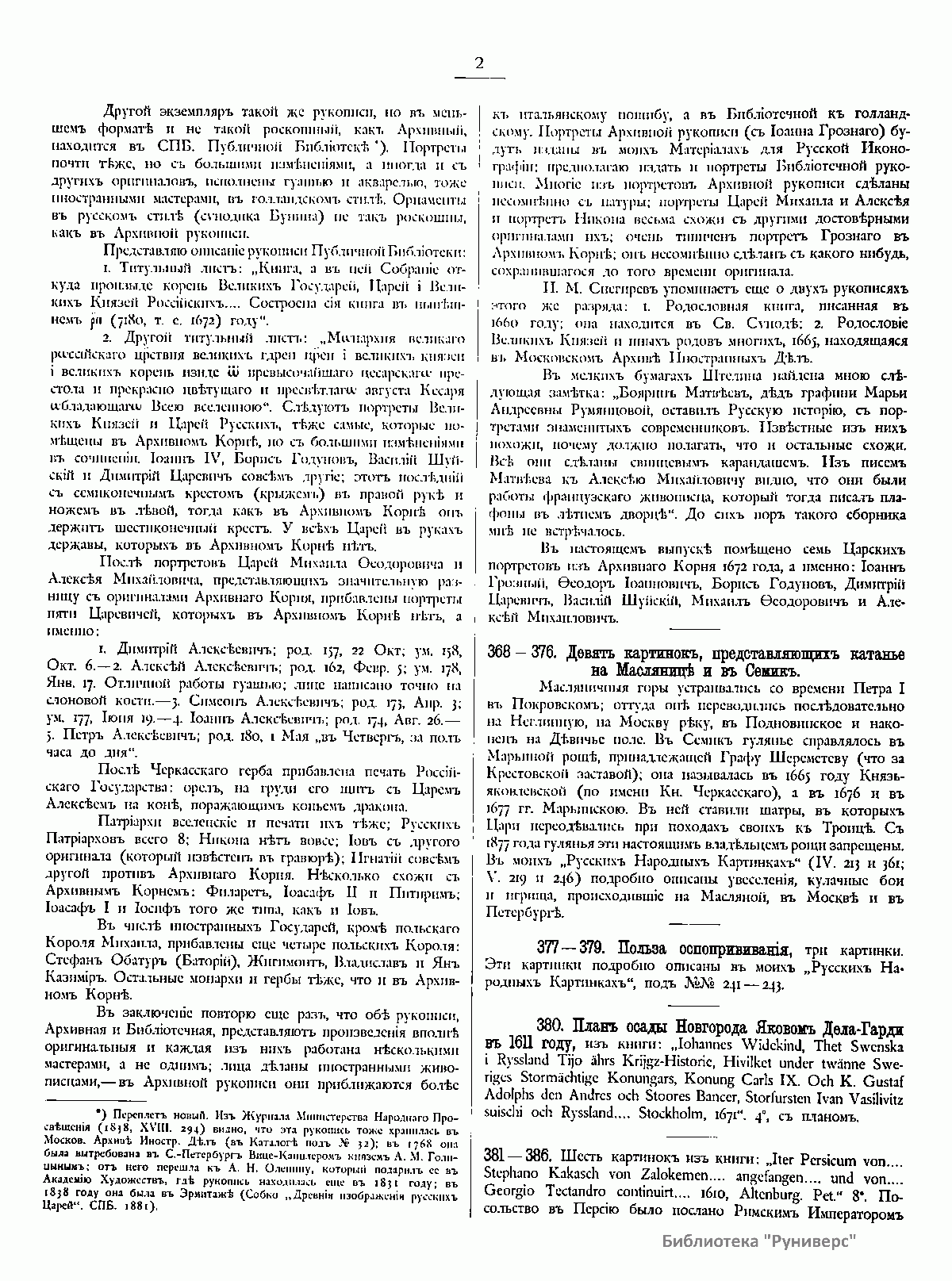 В 1882 г. Д. Ровинский издал книгу «Достоверные портреты московских государей: Ивана III, Василия Ивановича и Ивана IV Грозного – и посольства их времени». Это исследование составляло первый отдел предпринятой автором русской иконографии. За ним должны были следовать другие отделы. Материалов для каждого из этих отделов накопилось довольно много, но тем не менее существовали еще значительные пробелы, которые не позволяли приступить к систематическому изданию. Но так как любители и собиратели старины настаивали на издании, автор приступил к предварительной публикации собранных им снимков под общим названием «Материалы для русской иконографии». В эти материалы вошли портреты, виды, исторические и бытовые листы, листы, изготовленные для истории русской гравюры, работы граверов-серебряников, а также отпечатки с оригинальных старинных медных досок. Все снимки, за немногим исключением, сделаны в одну меру с оригиналами. Самые замечательные и редкие исполнены на меди по способу Г. Скамони, или печатаны со стекла посредством альбертотипии (у Шера и Набгольца в Москве и за границей) и фотогиалотипии (у г. Скамони); менее редкие и важные картинки исполнены посредством фотолитографии.