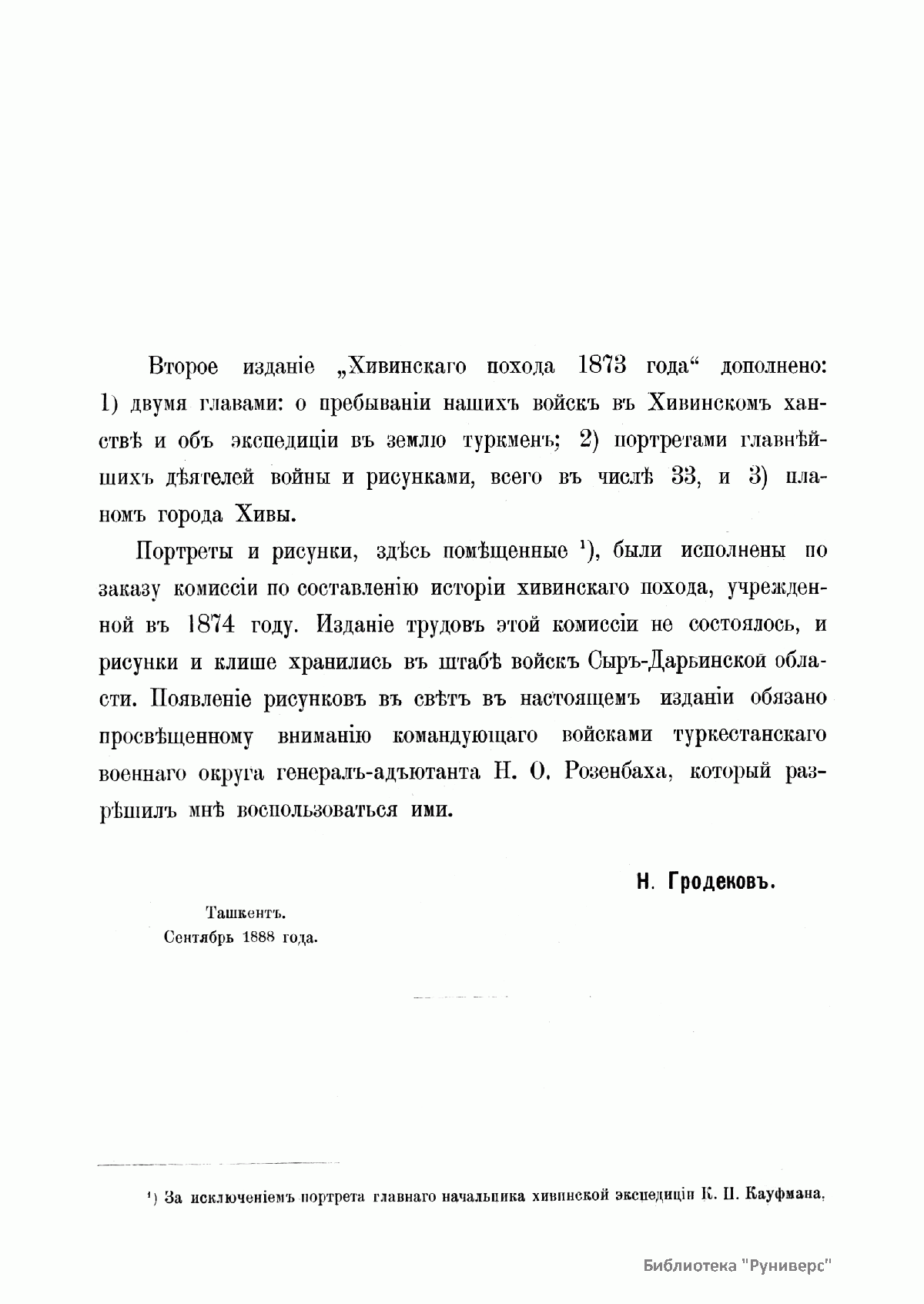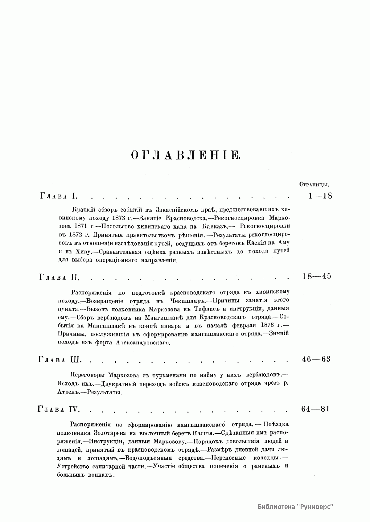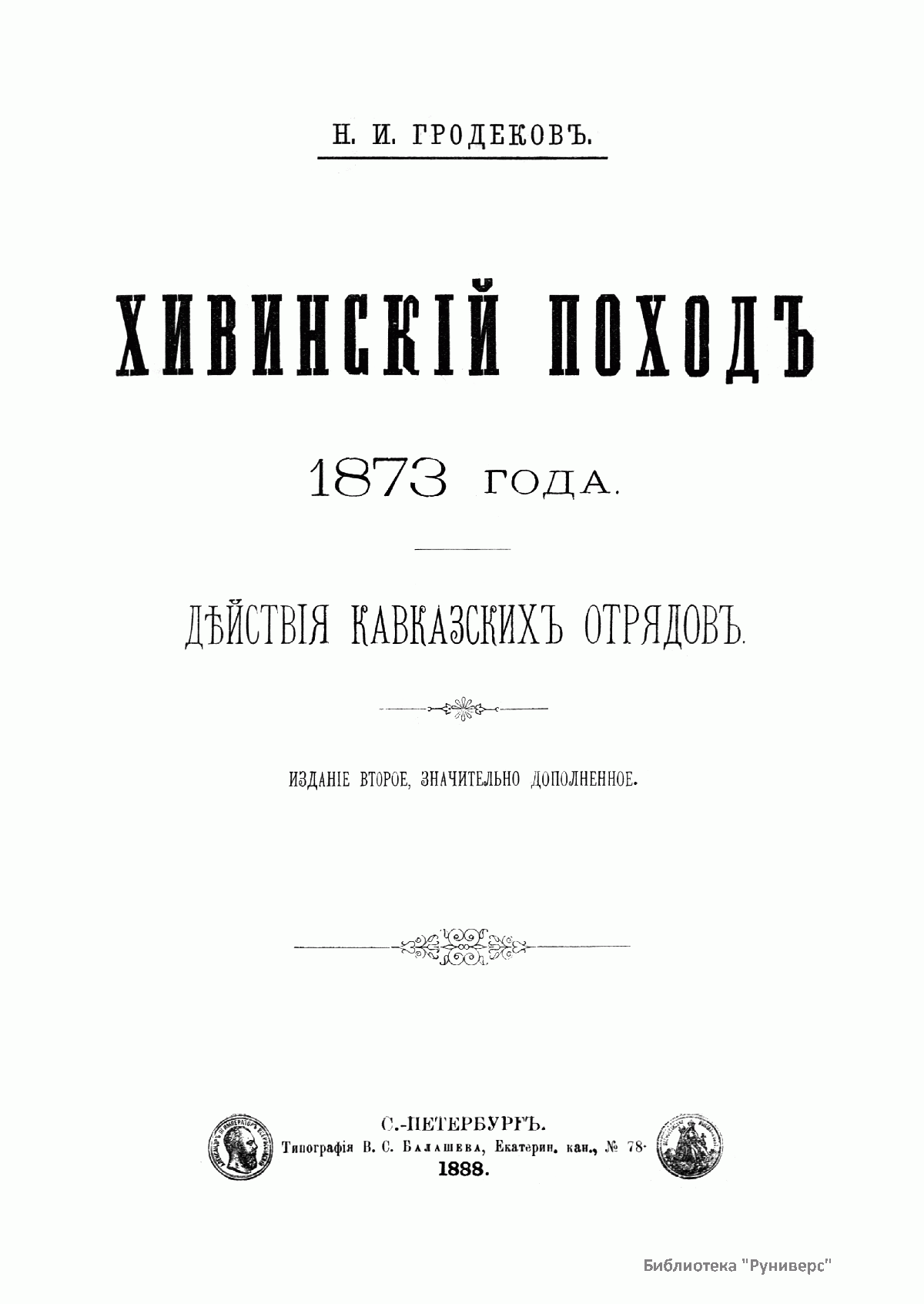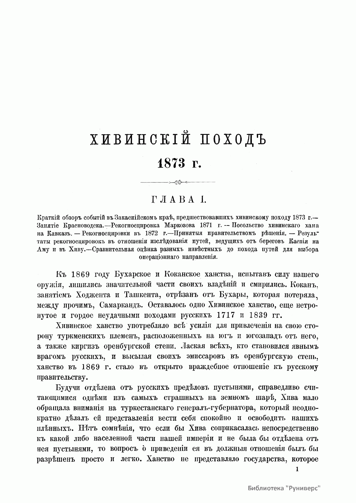 Данное издание представляет собой описание событий Хивинского похода 1873 года. Автор книги Гродеков Н. И. являлся участником военной экспедиции в качестве начальника штаба Мангышлакского отряда полковника Ломакина и за боевые отличия был награжден орденом св. Станислава 2-ой степени. Основные события похода, включая сравнительную оценку разных известных до военных действий путей, автор превосходно описал в данной книге. Издание было значительно дополнено двумя главами, портретами главных деятелей войны, рисунками, планом города Хивы, что дает возможность рассмотреть картину похода со всех сторон.