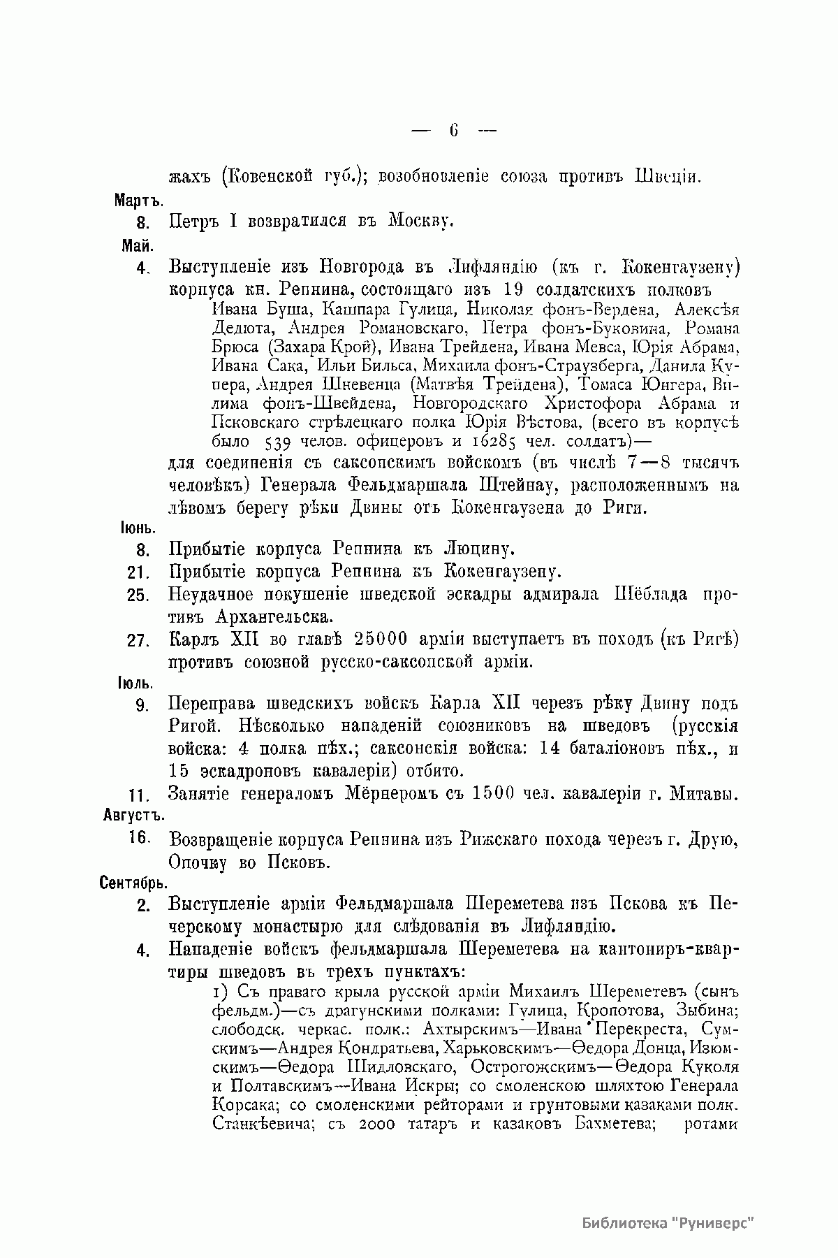 Подробный 5-томный справочник, изданный в 1908 – 1913 гг. коллективом авторов на основе фондов Военно-ученого архива Главного управления Генерального штаба (ныне Российский государственный военно-исторический архив), который содержит подробные сведения о боевых действиях русской армии и флота за период с 1695 г. (1-й Азовский поход) по 1905 г. (русско-японская война 1904 – 1905 гг.). В Справочнике приведены хронология событий, состав воинских соединений, включая наименования воинских подразделений (вплоть до отдельных рот и эскадронов), фамилии командиров, боевые потери и т.д.