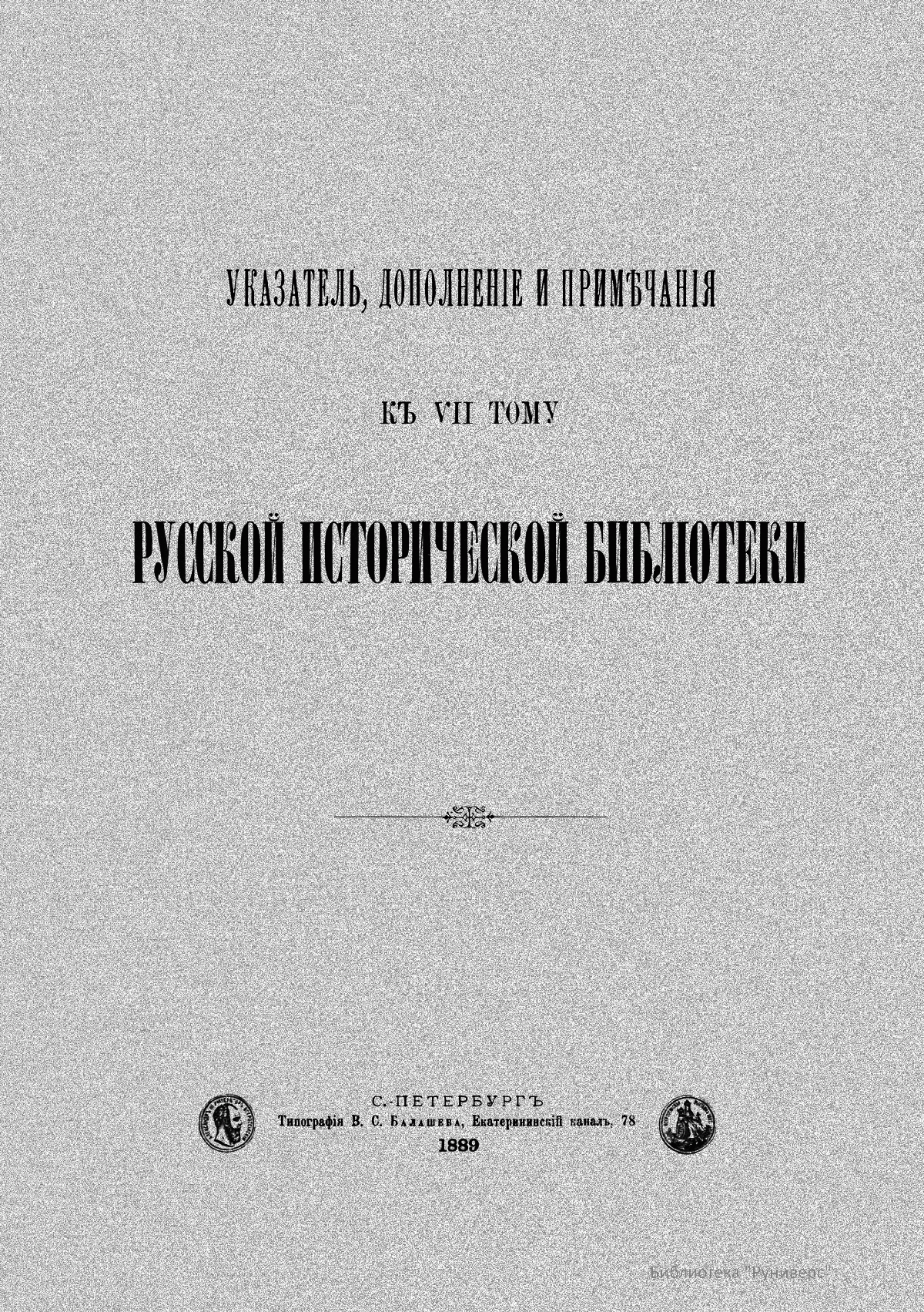 Указатель, дополнение и примечания к VII тому Русской исторической библиотеки