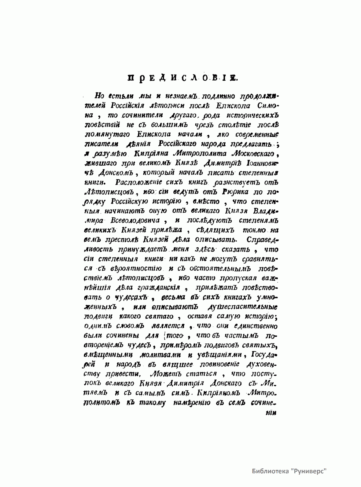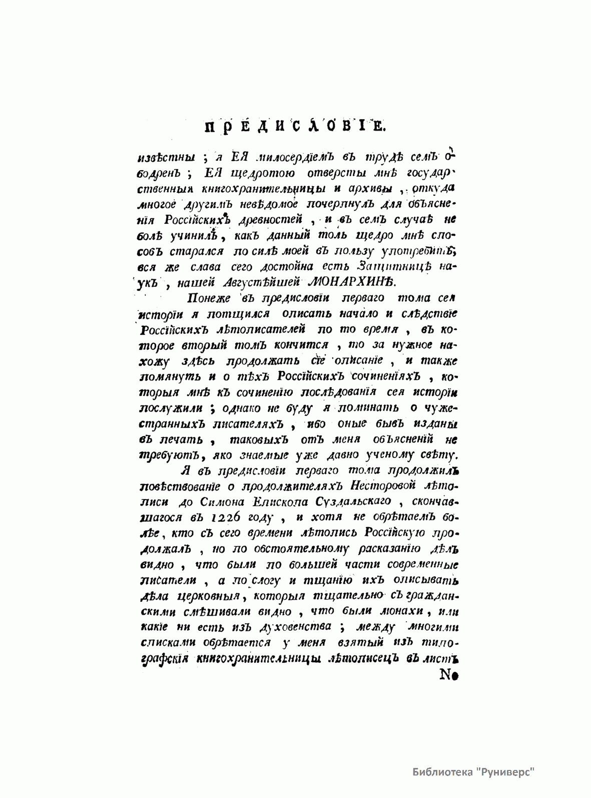 (также князю доверили разобрать и систематизировать архив Петра I). Начиная с 1770 г. вышло 7 томов, охватывающих историю России с древнейших времен до 1610 г. Следуя за идеями французских просветителей, Щербатов не только описывал действия исторических личностей, но и указывал, что за их поступками кроются определенные мысли, идеи, нравы, господствующие в обществе. И это было новым по отношению к предшествующей историографии.