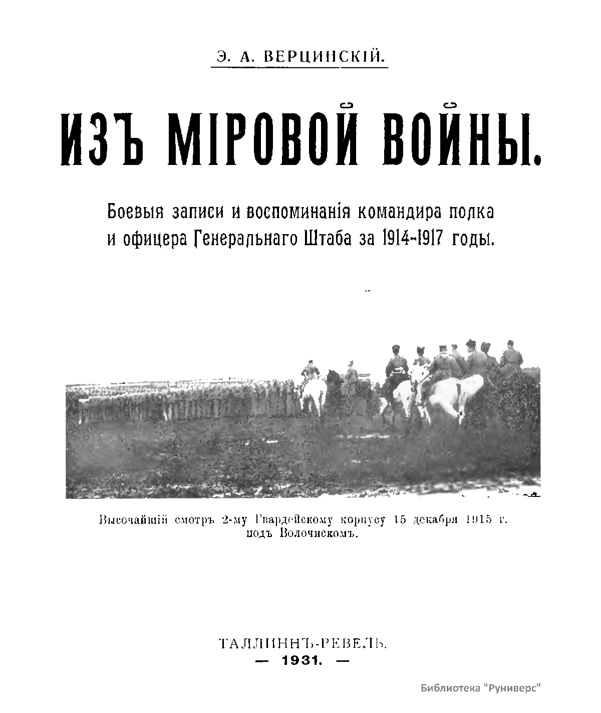 Книга воспоминаний бывшего командира Лейб-гвардии 2-го стрелкового Царскосельского полка (с 22 января 1915 г. по 2 июня 1916 г.) и начальника Штаба Гвардейской стрелковой дивизии (с 11 сентября 1916 по 18 февраля 1917 г.) генерал-майора Эдуарда Александровича Верцинского подробно повествует о боевом опыте автора в период Первой мировой войны с 1914 по 1916 год включительно. Им последовательно описаны все боевые операции дивизии на Западном фронте, анализируется работа штаба и отдельных командиров. Книга написана в эмиграции в 1931 г. в Эстонии и была издана в Таллине. Э.А. Верцинский в гражданской войне не участвовал. Однако после вхождения Эстонии в состав СССР автор данной книги был арестован в сентябре 1940 г. и расстрелян 28 февраля 1941 г. в Ленинграде.