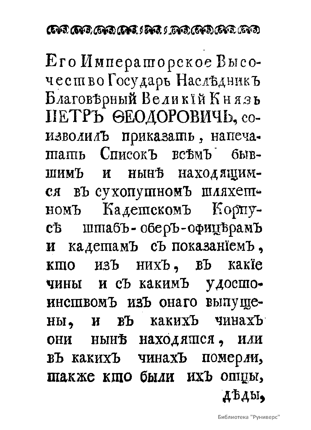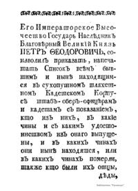 Список живущих и умерших на 1761 г. штаб- и обер-офицеров – руководителей, преподавателей и выпускников Сухопутного Шляхетского кадетского корпуса, а также обучающихся в тот период кадетов Корпуса с краткими личными характеристиками каждого. Список составлен и издан по приказу великого князя Петра Федоровича (будущего императора Петра III).