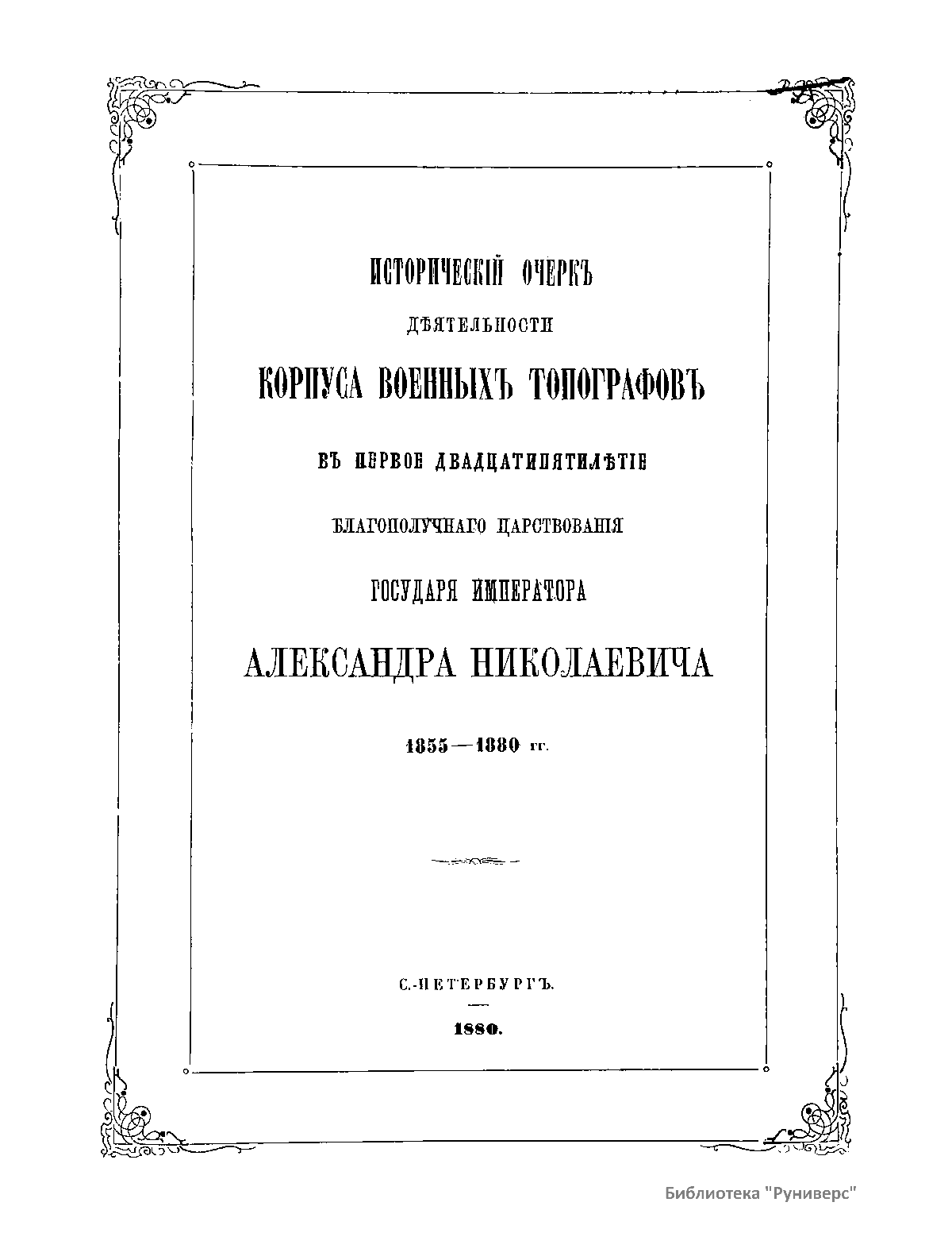 Историческiй очеркъ дѣятельности корпуса военныхъ топографовъ въ первое двадцатипятилѣтие благополучнаго царствованiя Государя Императора Александра Николаевича 1855-1880 гг
