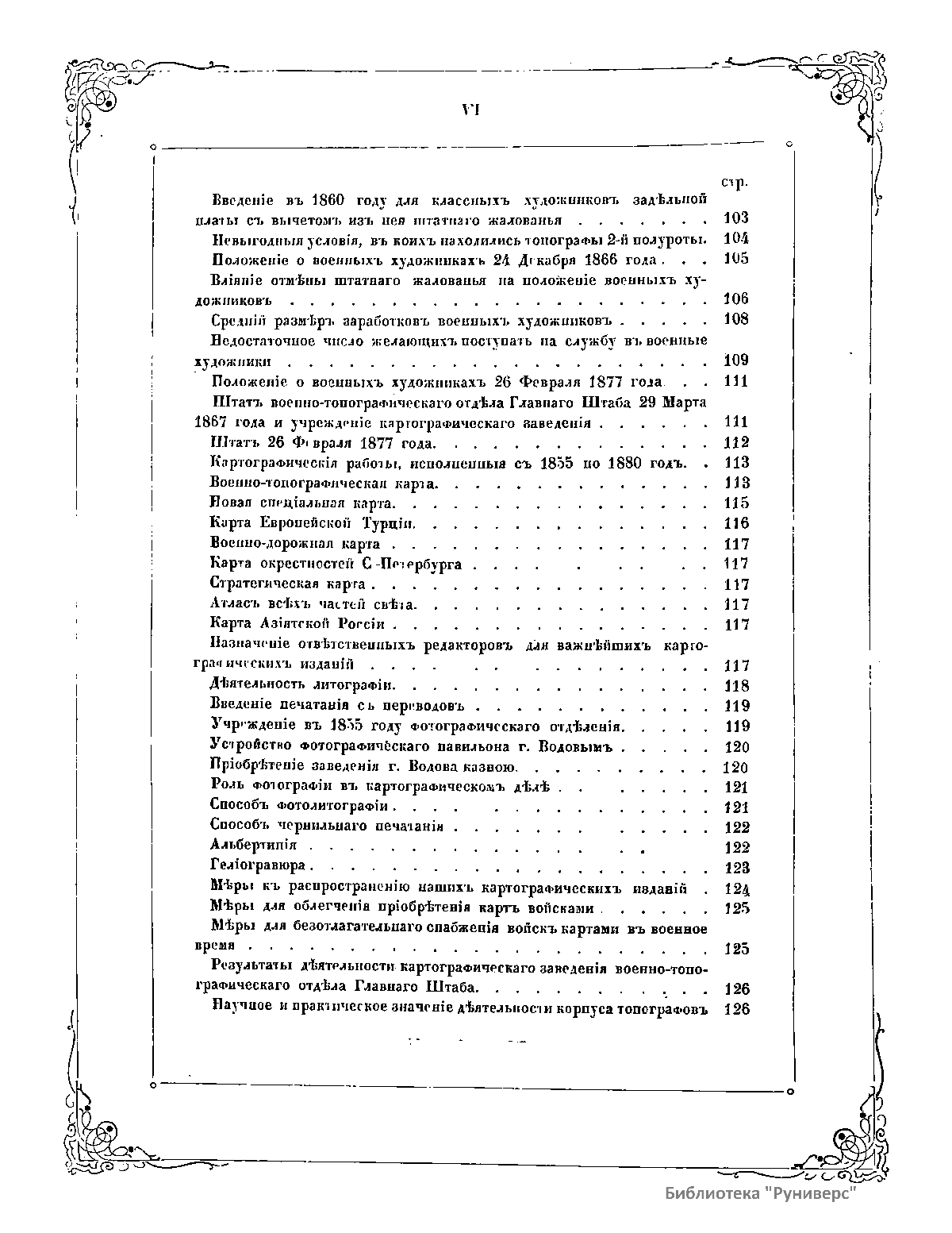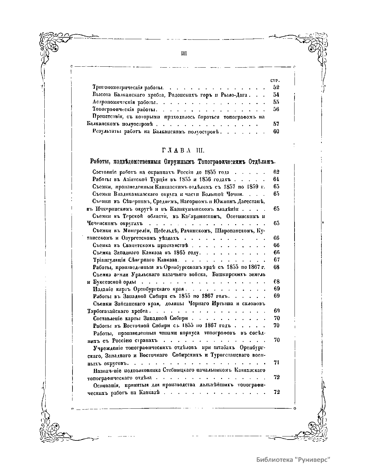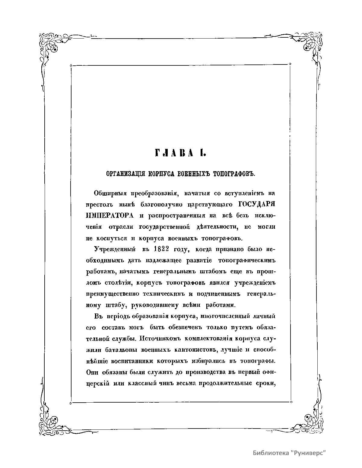 Книга военного топографа Виктора Францевича де-Ливрона посвящена деятельности Корпуса военных топографов. В ней содержатся - краткий обзор картографических, топографических, астрономических и тригонометрических работ, произведенных в России до учреждения Корпуса Топографов 1822 г. Значительную долю повествования автор отводит сведениям об учреждении и развитии Корпуса в 1822 - 1872 гг. Здесь приводится описание различных топографических, картографических и других работ Корпуса, производившихся при Военных округах и в разных регионах России. В качестве приложения даны списки генералов, офицеров и картографов Корпуса по 28 января 1872 г., карты Европейской и Азиатской России с показанием топографических и астрономических работ, карта Европейской России с показанием генерального межевания произведенного с 1765 по 1822 г.