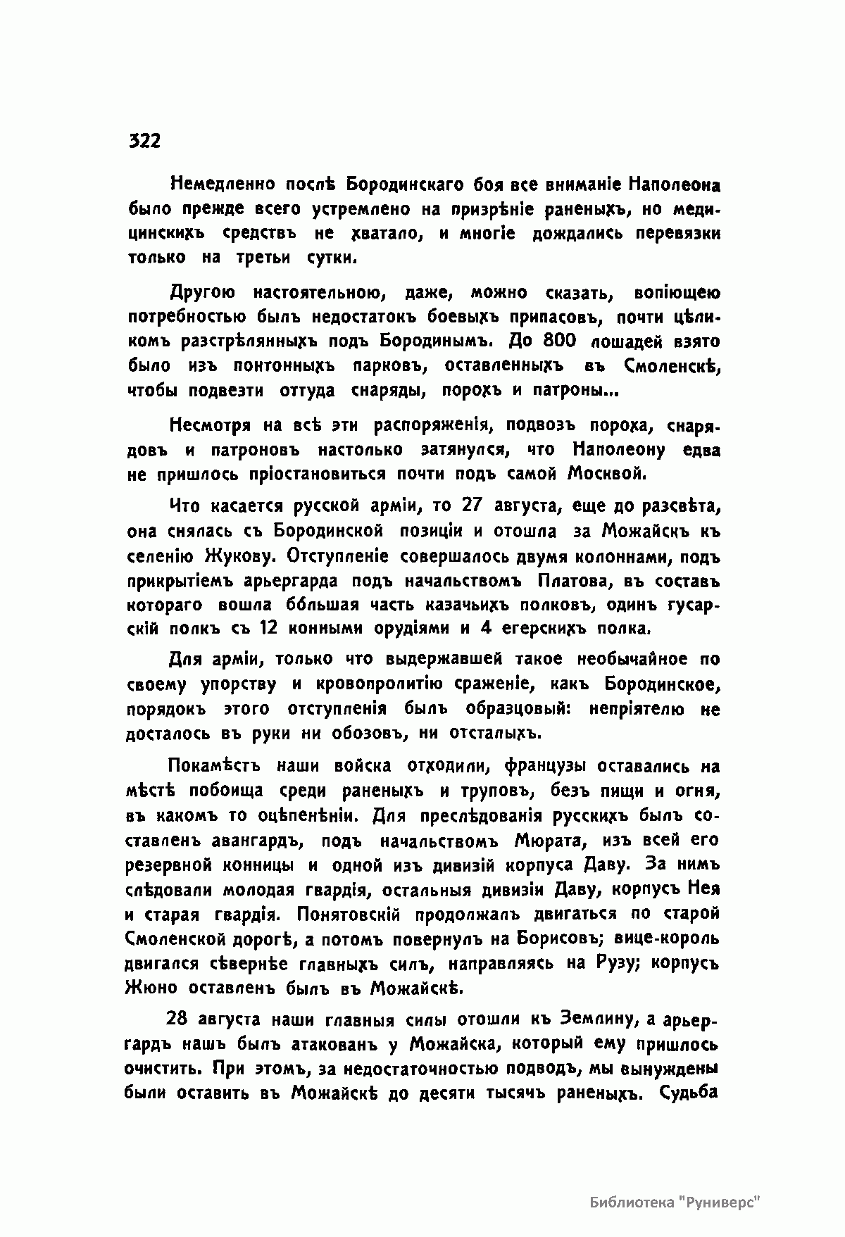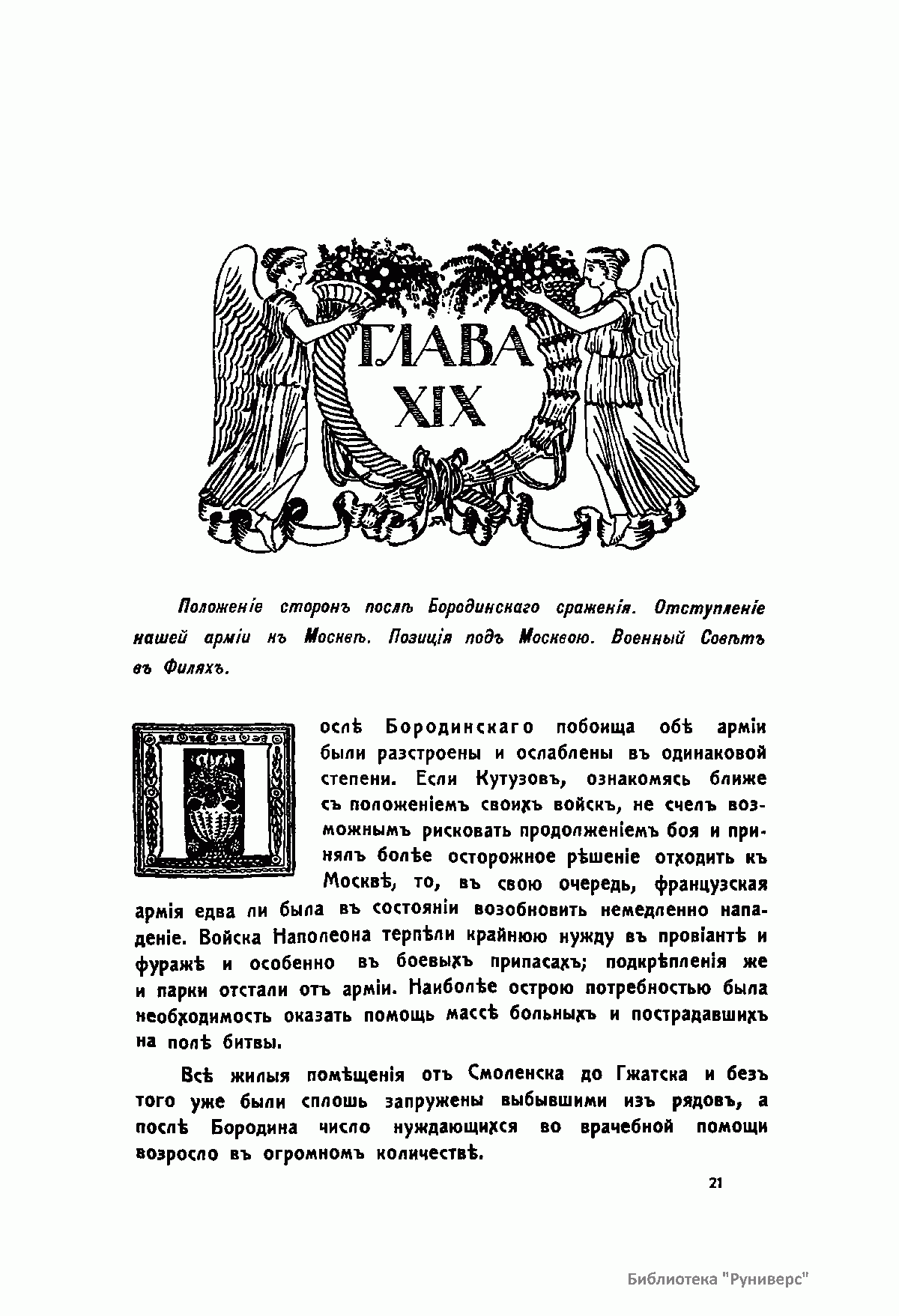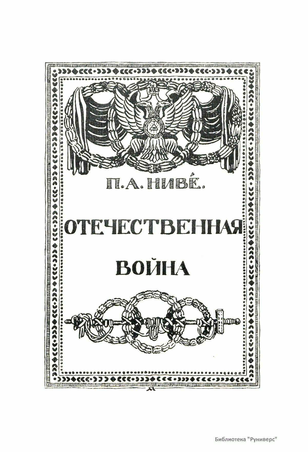 Книга военного историка, полковника Петра Андреевича Ниве «Отечественная война» является юбилейным изданием 1912 г., которое имело целью восстановить точную, во всех ее деталях историческую канву событий Отечественной войны 1812 г. Данное издание богато иллюстрировано, в нем представлены планы и карты всех крупных сражений «Русской кампании Наполеона».