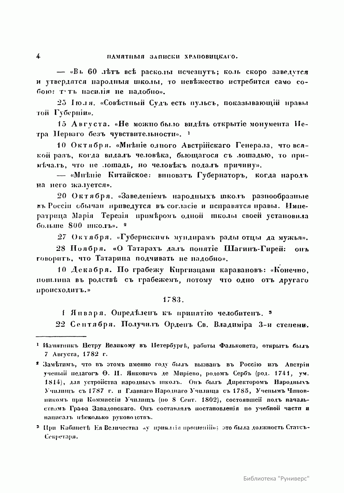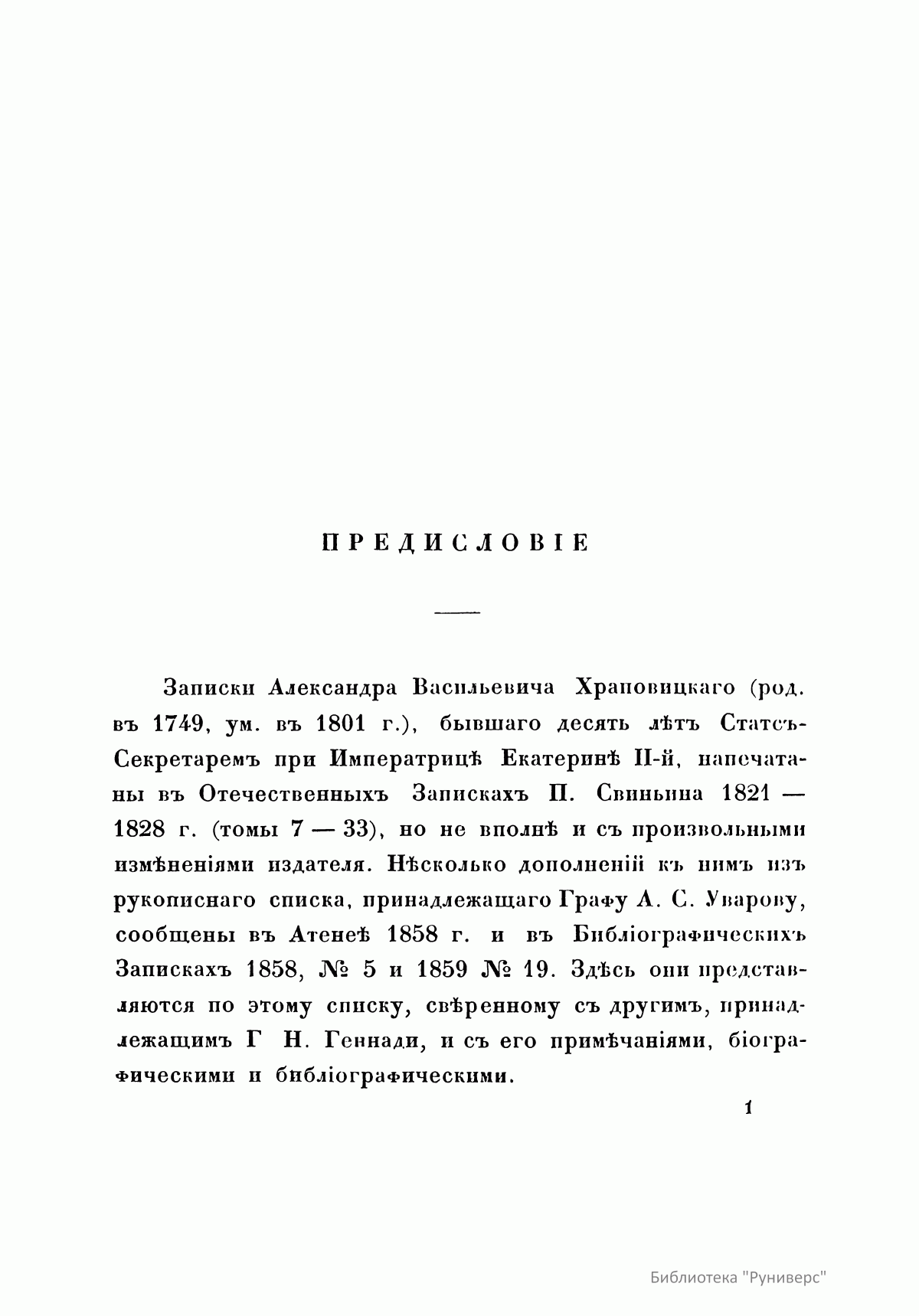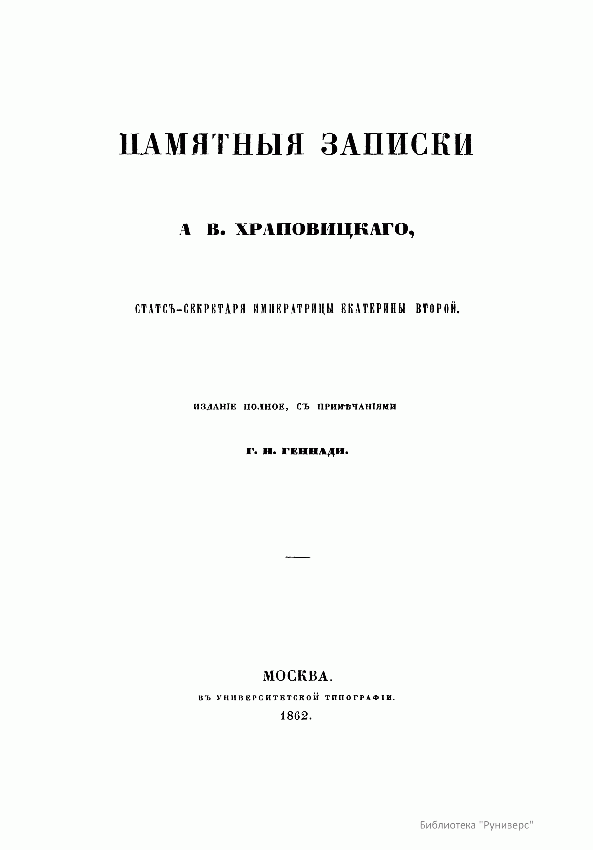 Записки Александра Васильевича Храповицкого (1749 – 1801), бывшего десять лет статс-секретарем при императрице Екатерине II, напечатаны в «Отечественных записках» П. Свиньина 1821 – 1828 (т. 7 – 33), но не полностью и с произвольными изменениями издателя. Несколько дополнений к ним из рукописного списка, принадлежащего графу А. С. Уварову, сообщены в «Атенее» 1858 г. и в «Библиографических записках» 1858 г. № 5 и 1859 № 19. В настоящем издании они представляются по этому списку, сверенному с другим, принадлежащим Г. Н. Геннади, с его библиографическими и биографическими примечаниями. Биографию Храповицкого можно найти в «Отечественных записках» 1821 г., т. 7, подробнее – в словаре Бантыша-Каменского, т. 3 (Спб. 1849). В конце книги находятся примечания, где анализируются существенные недостатки данного издания «Записок» и указывается на преимущества издания П. Свиньина. «Записки» имеют форму дневника, где события распределены по месяцам и дням.