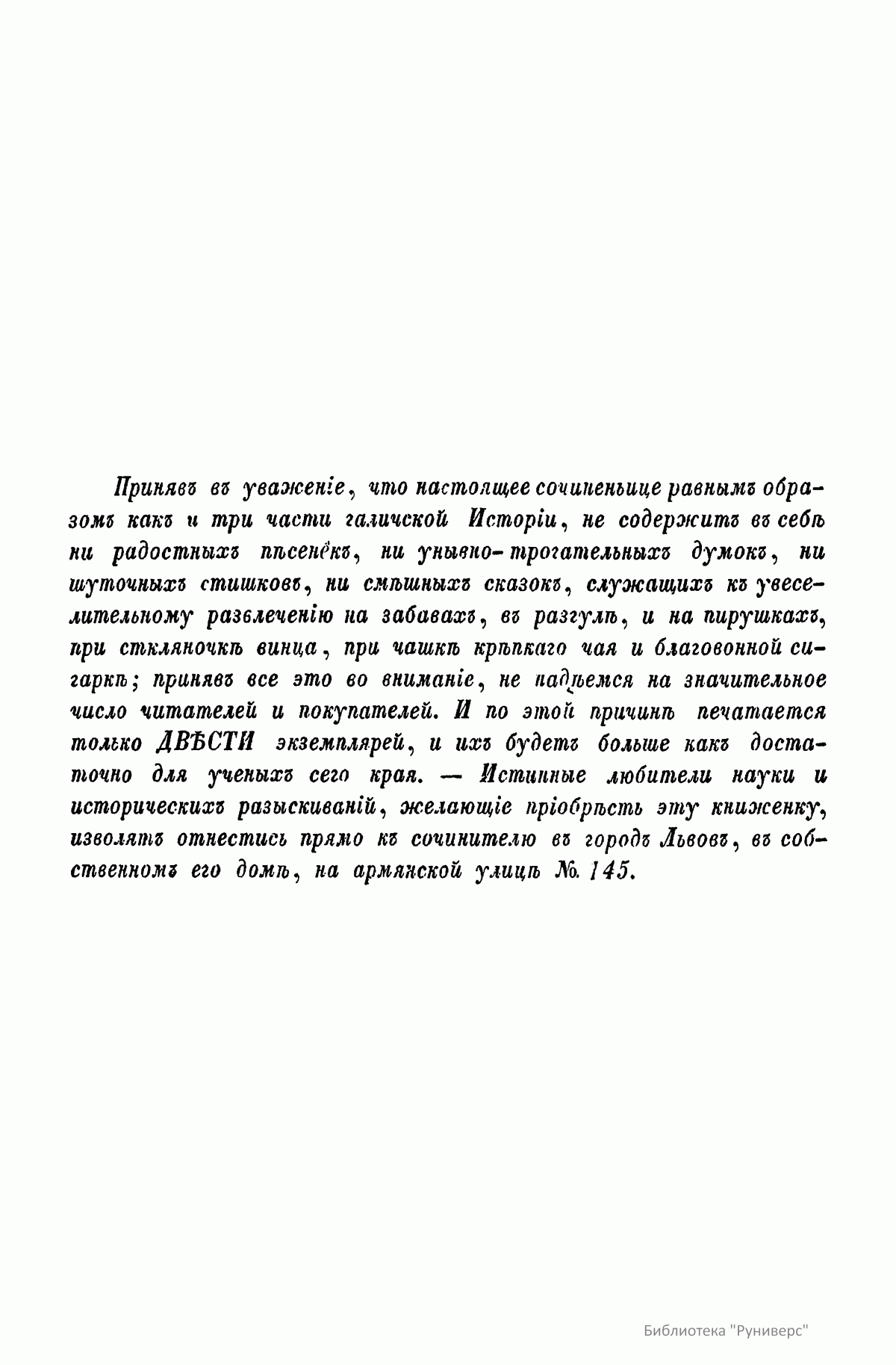 Автор адресует свой труд «истинным любителям науки и исторических разыскиваний». В книге опубликованы латинские выписки из сочинений польских историков Анонима Гнезненского и Иоанна Длугоша, относящиеся к истории Галицко-Владимирской Руси, за период от 1337-го по 1387 год, с русским переводом и критическими замечаниями. Автор ставит цель исследовать, каким образом эта часть русского мира попала под власть польской державы. Во вступлении дана характеристика европейского Севера, к которому принадлежала и Галиция, в древности. Поселившийся на севере Европы многочисленный славянский народ разделился на два мира - русский и лядский (польский). Первым управляли потомки Рюрика, а вторым потомки Пяста. Когда в русском мире с кончиной Ярослава Мудрого, а в лядском мире с кончиной Болеслава Кривоустого прекратилось единодержавие, оба мира распались на множество больших и малых удельных княжеств, которые тем не менее оставались исключительным достоянием обоих господствовавших родов. В XIV столетии в обоих мирах разъединенные части стали сливаться в большие государства. Однако в лядском мире возникло два польских королевства, два польских короля: Иоанн Слепой король чешский писался польским королем, и Казимир Владиславович Великий употреблял титул польского короля. Равным образом в две отдельные системы сгруппировался и русский мир: в состоявшую тогда под монгольским владычеством Русь и в литовскую Русь. В татарской Руси московские князья в борьбе с тверской линией Рюриковичей за великокняжеское достоинство, в попытке низвергнуть татарское иго, в стремлении покорить мелкие единородные княжества и усмирить своевольную новгородскую республику, стали только предвещать будущее свое величие. Совсем другим образом устроилась западная Русь, литворусская держава. После смерти королевича Шварно Даниловича в Литве настала новая династия Гедиминовичей. Сначала Гедиминовичи завладели оружием многими русским землями, а после через вступление в браки с русскими княжнами сроднились с Рюриковичами, приняли русское вероисповедание, язык и обычаи. Образовался сильный союз больших и меньших князей Гедиминовичей и Рюриковичей с удивительным согласием между собой: они воевали вместе против прусских крестоносцев, поляков, венгров, татар, татарам подвластных северо-восточных русских князей, освободили западную Русь от татарского данничества. Так возникла Литовская Русь. Во второй половине XIII столетия между реками Вислой, Неманем и Балтийским морем, между пределами Польши, Литвы и Руси зародилось и устроилось новое странное государство воинов-монахов – прусских крестоносцев, которых поляки называли Крижаками. Эта держава постоянно усиливалась бродячими рыцарями целого запада Европы и достигло в XIV веке могущества: было грозой соседних народов и имело большое влияние на дела северной Европы. Польский король Казимир в 1343 году заключил с опасными соседями невыгодный мир, уступив им большую часть исконных земель, а литворусский союз боролся с ними почти целое столетие и сохранил в целости свое достояние. Кроме этих главных держав, действовавших на севере Европы, по берегам Черного моря расстилались татарские жилища, но их прежнее могущество теряло свой блеск. Татары и Людвиг король венгерский – сперва как сродник-союзник польского коро