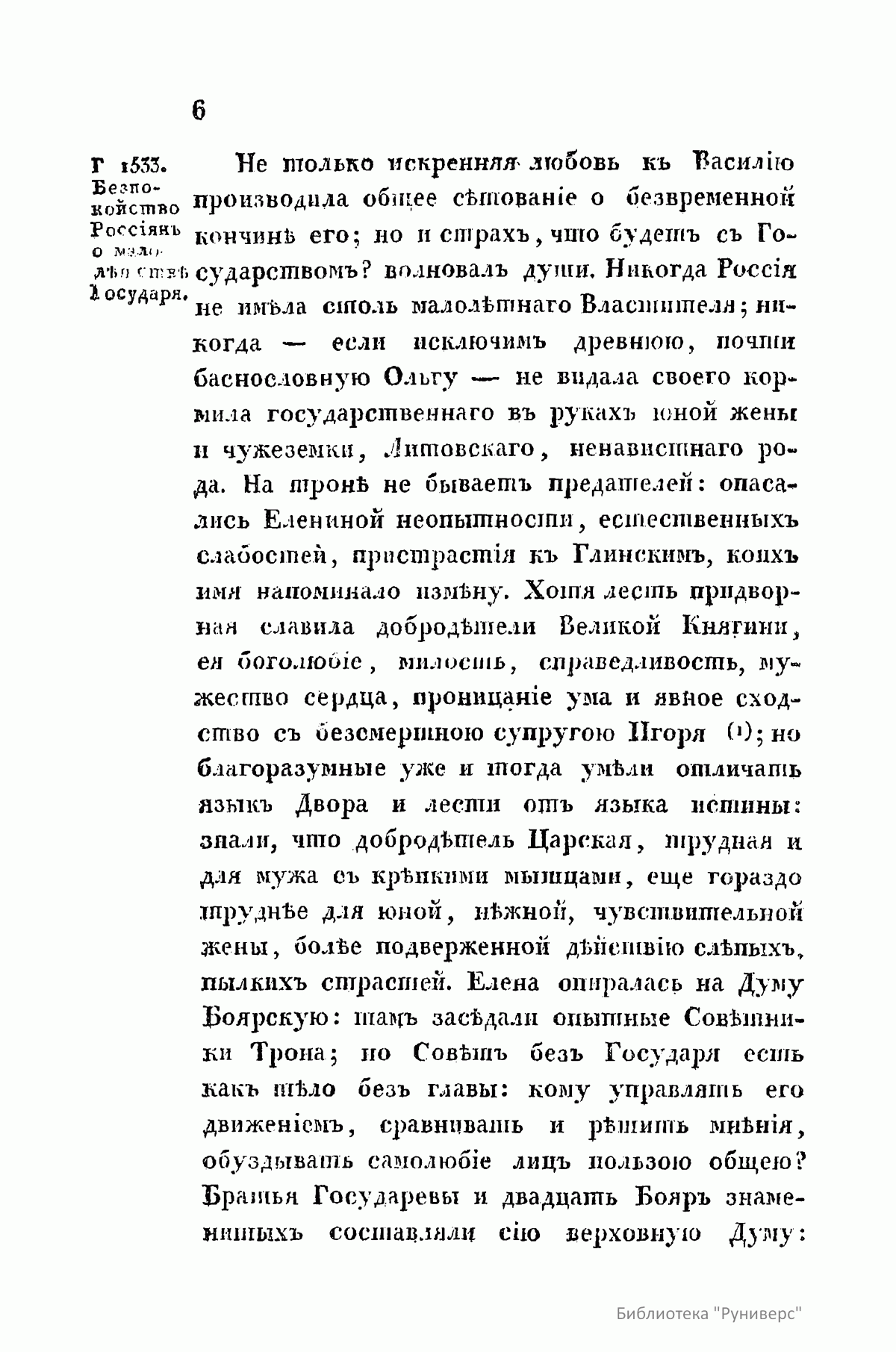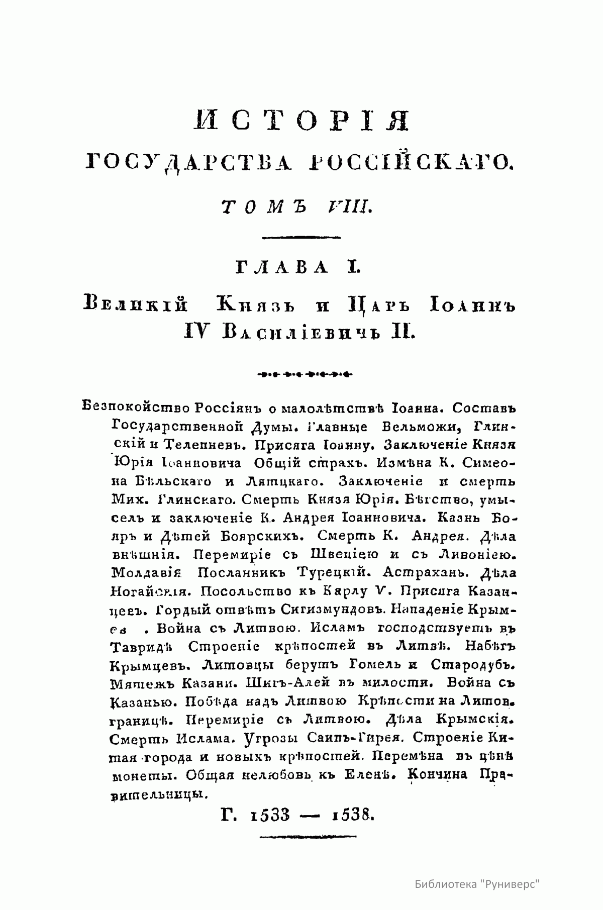 В 1816 году он выпустил первые восемь томов «Истории государства Российского», трёхтысячный тираж которых разошелся в течение месяца. В последующие годы вышли еще три тома «Истории», появился ряд переводов её на главнейшие европейские языки. Тенденциозно-монархическое освещение русского исторического процесса сблизило Карамзина с двором и царем, поселившим его подле себя в Царском Селе. Незаконченный XII том был издан уже после его смерти.