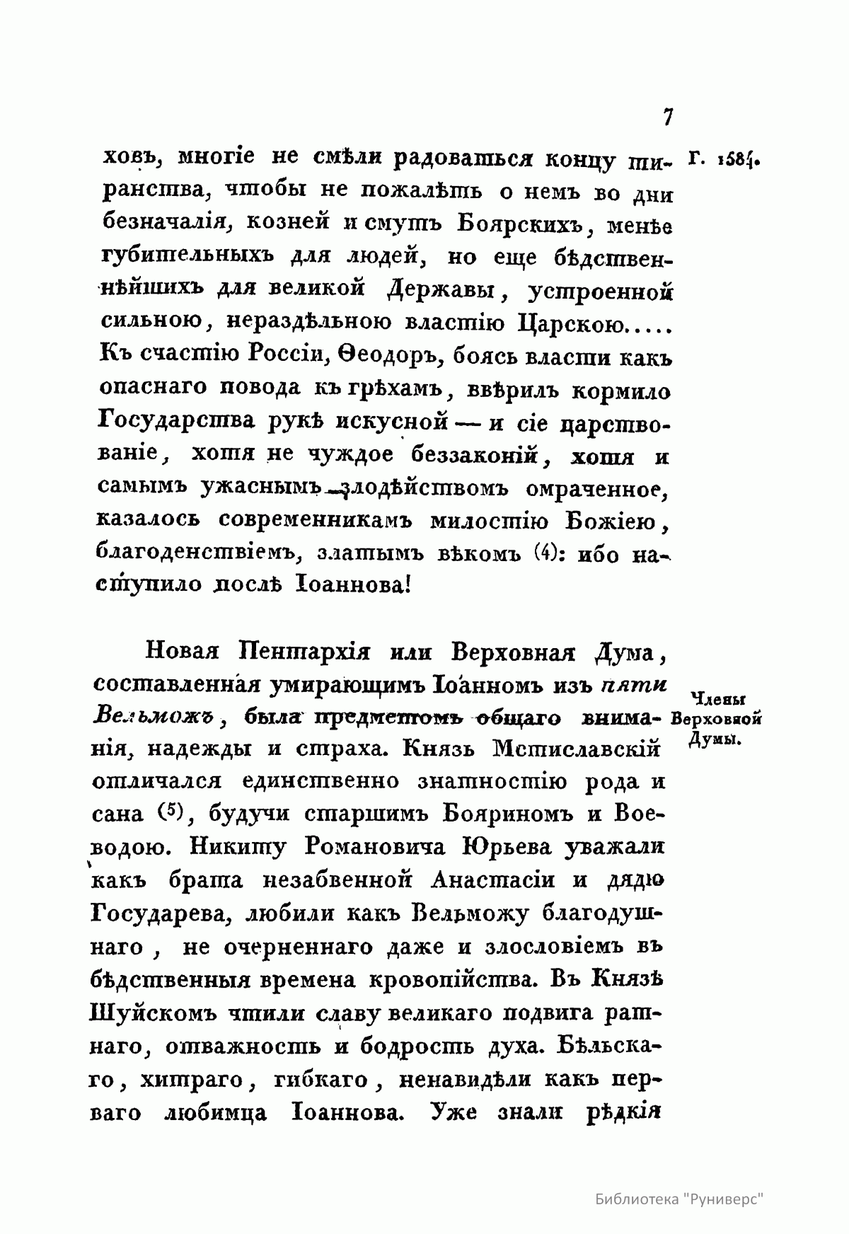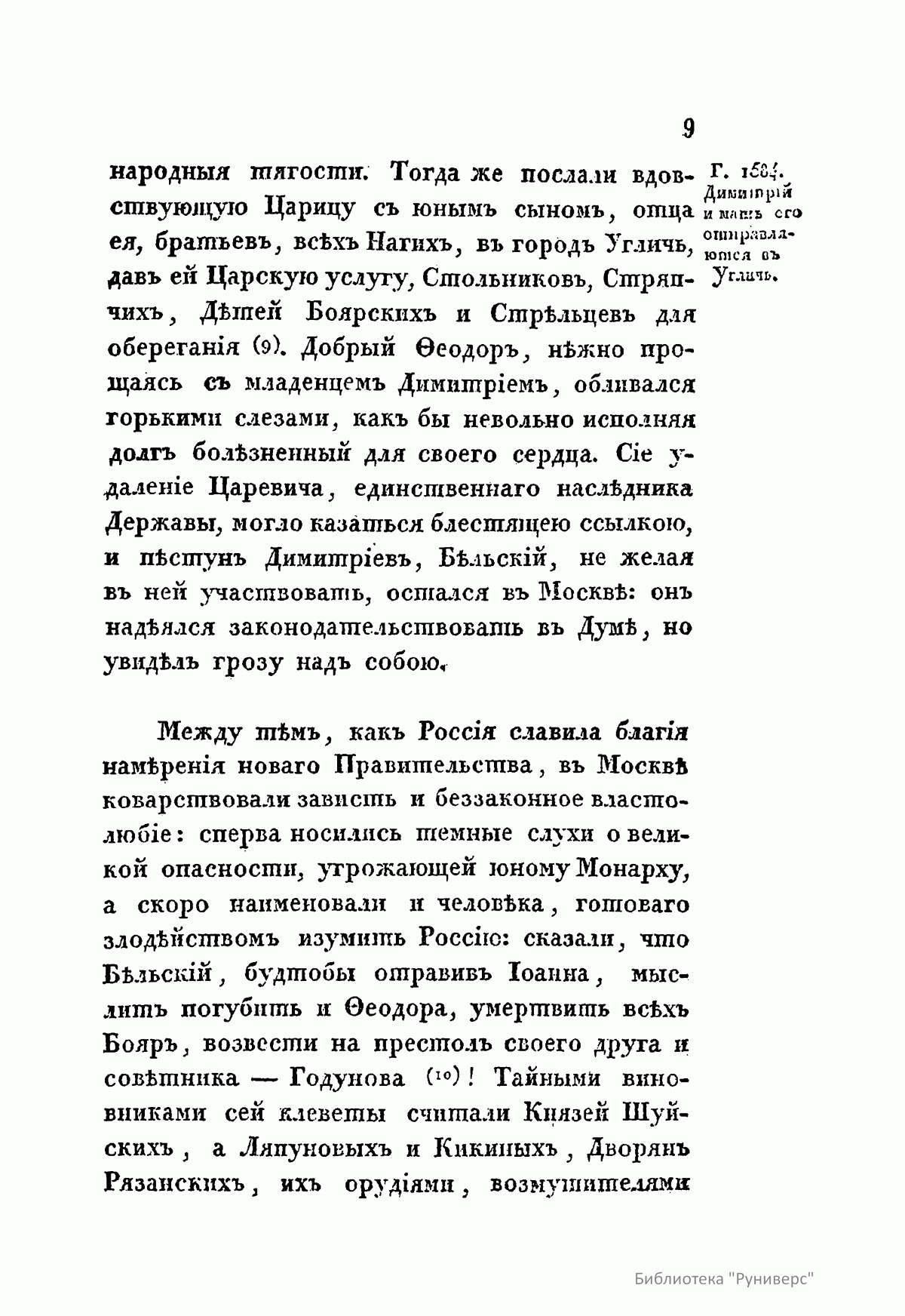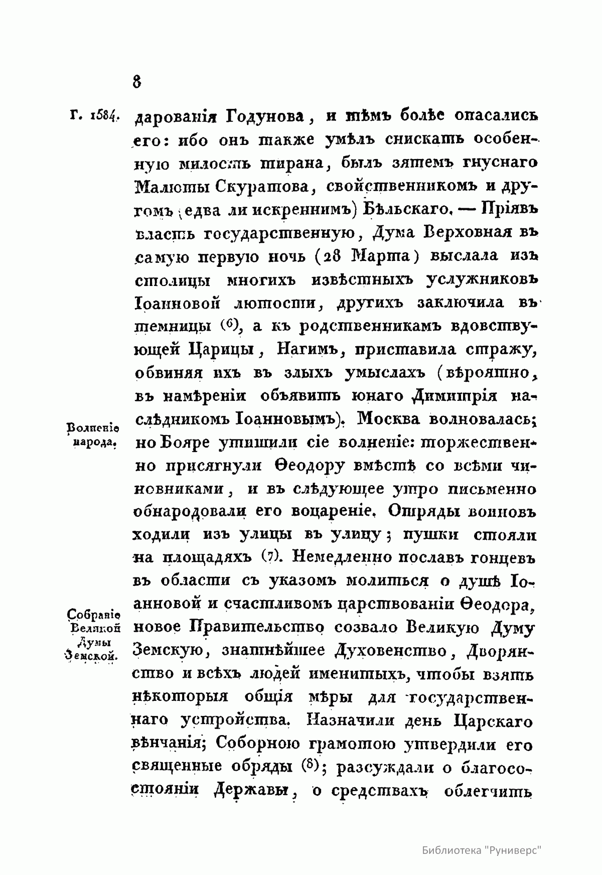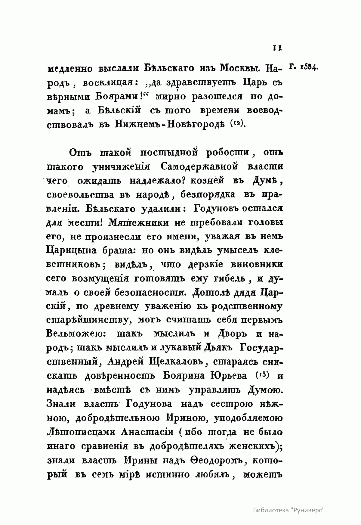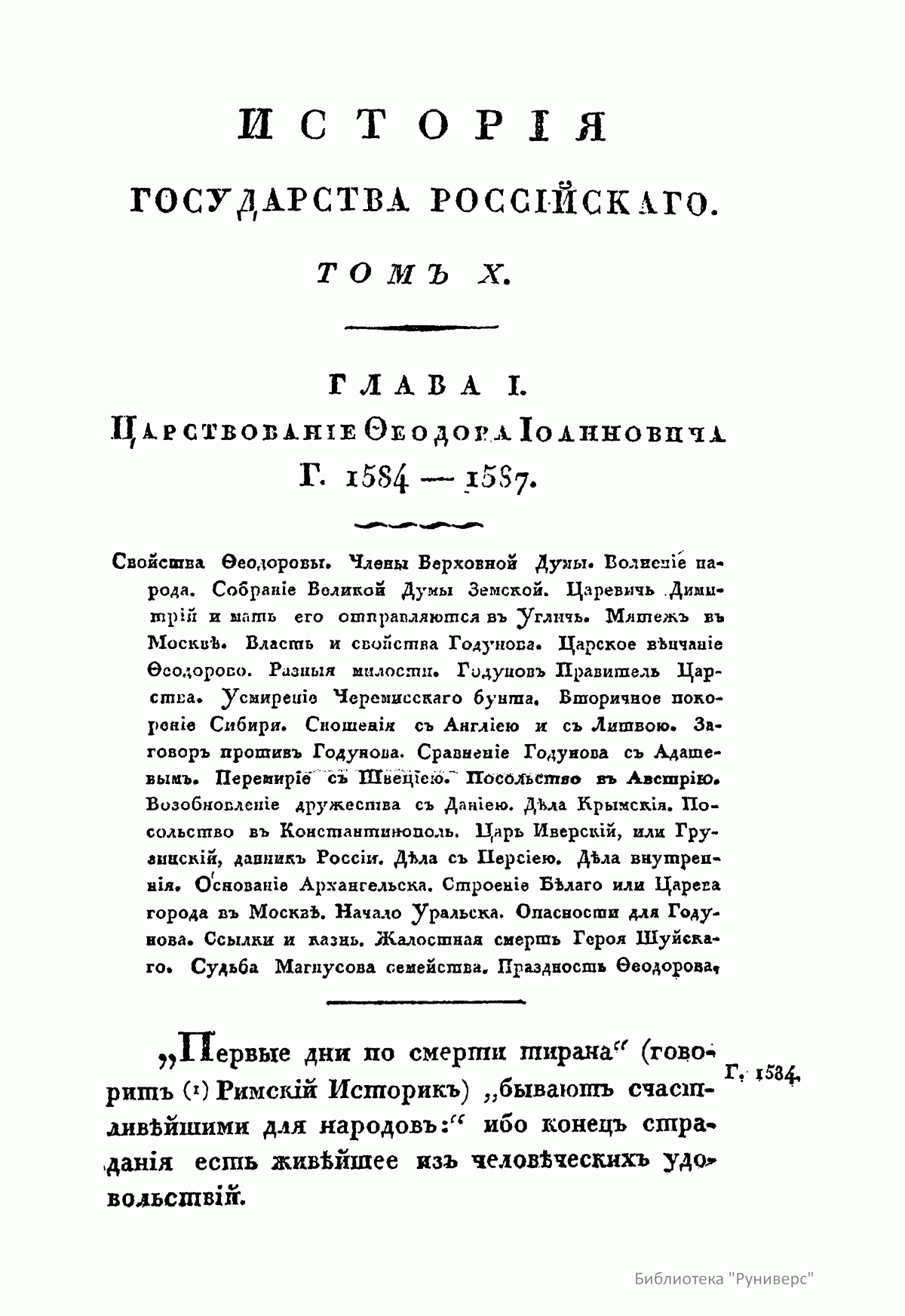 В 1816 году он выпустил первые восемь томов «Истории государства Российского», трёхтысячный тираж которых разошелся в течение месяца. В последующие годы вышли еще три тома «Истории», появился ряд переводов её на главнейшие европейские языки. Тенденциозно-монархическое освещение русского исторического процесса сблизило Карамзина с двором и царем, поселившим его подле себя в Царском Селе. Незаконченный XII том был издан уже после его смерти.