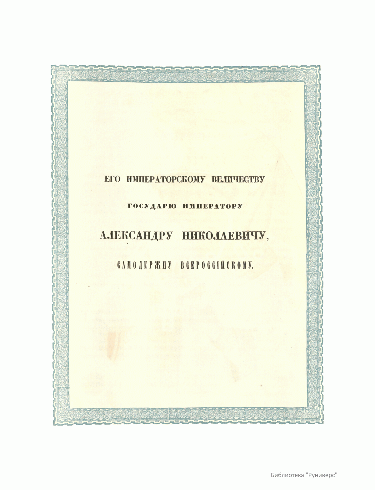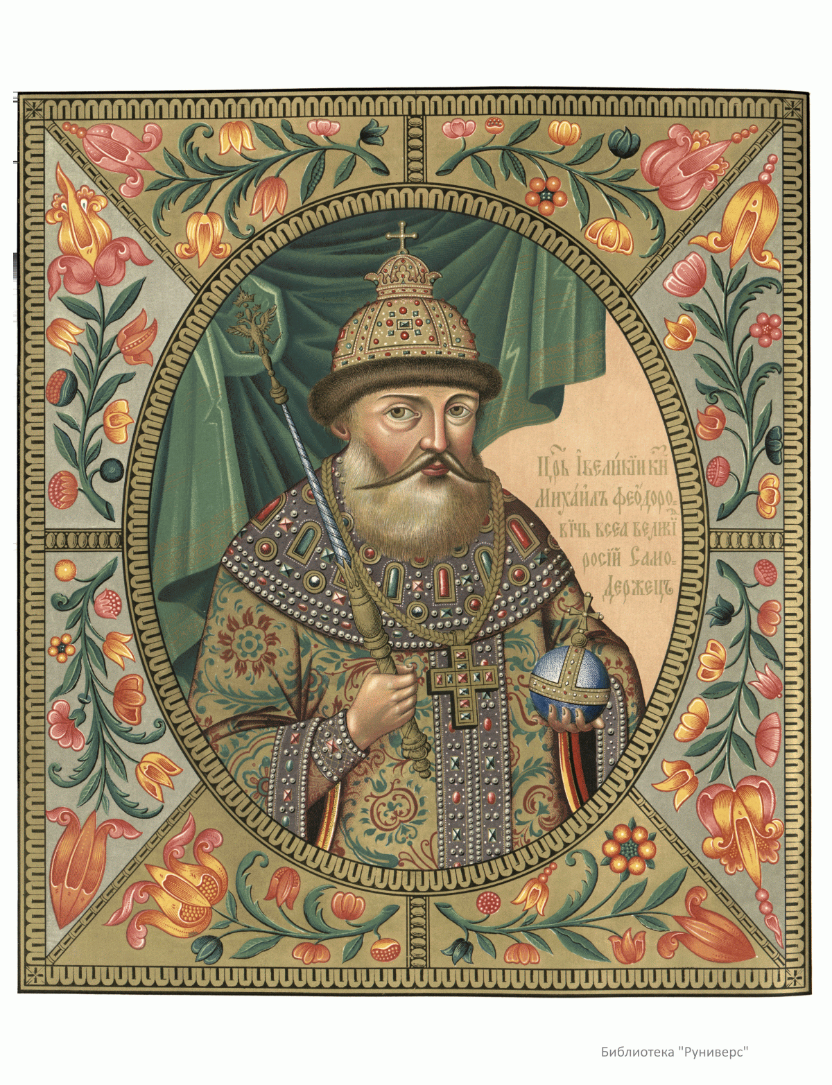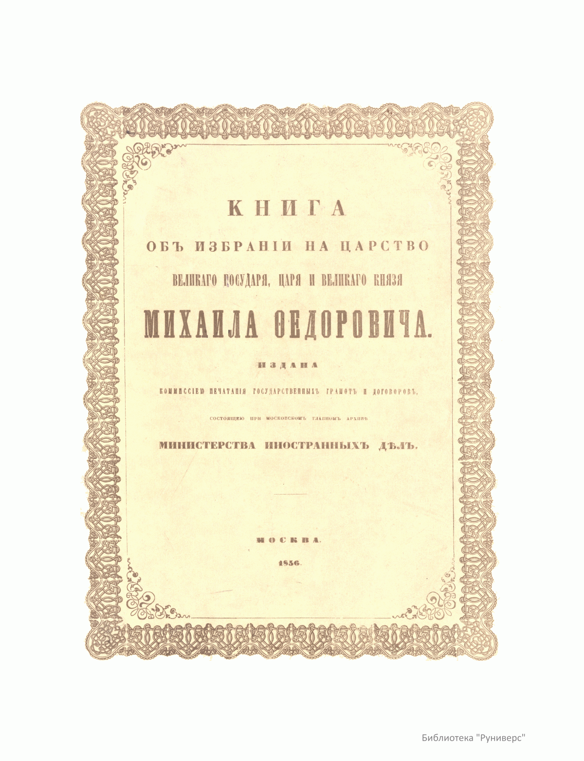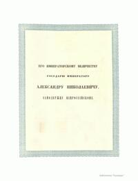 Михаил Федорович Романов (1596 – 1645) – первый царь из династии Романовых. Избран на московский престол Земским собором 21 февраля ст.ст. 1613 года. 11 июня ст. ст. 1613 года состоялось его царское венчание. Приходился двоюродным племянником последнему русскому царю из московской ветви династии Рюриковичей Федору Иоанновичу. В настоящей книге, посвященной Александру II, опубликована рукопись второй половины XVII века, в которой на александрийской бумаге полууставом были описаны избрание и венчание на царство Михаила Федоровича (стр. 55). Рукопись представлена почти в том же виде, в каком она существует в подлиннике. Тексту предшествует фронтиспис, состоящий из цветочного орнамента по золотому и серебряному фону, а в середине вмещающий название: «Книга о избрании на превысочайший престол, великаго российскаго царствия, Великаго Государя Царя, и Великаго Князя Михаила Федоровича, всея великия России Самодержца». В рукописи имелись вклеенные между листов рисунки, наглядно изображавшие «дело избрания и обряды венчания царя, со всеми подробностями современных одеяний, вооружения и старинного вида зданий Московского Кремля». Эти рисунки, гравированные на меди, были изданы в особой тетради (отсутствуют). Публикации рукописи предшествует описание исторических событий начала XVII века на русском языке (стр. 14) и подробное описание рукописи и обстоятельств, связанных с ее появлением (стр. 47).