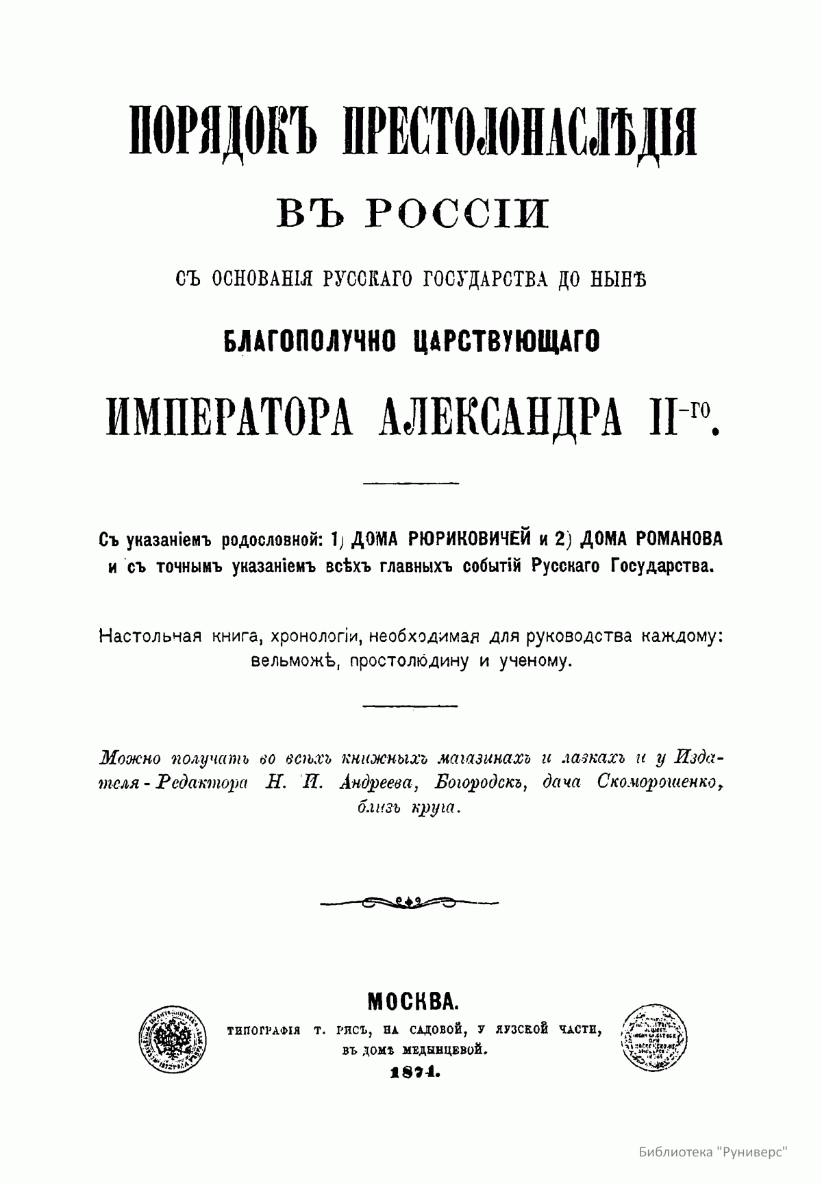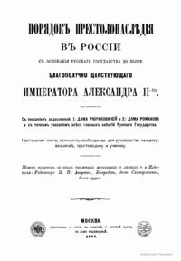 Порядокъ престолонаслѣдiя въ Россiи съ основанiя русскаго государства до нынѣ благополучно царствующаго Императора Александра II-го