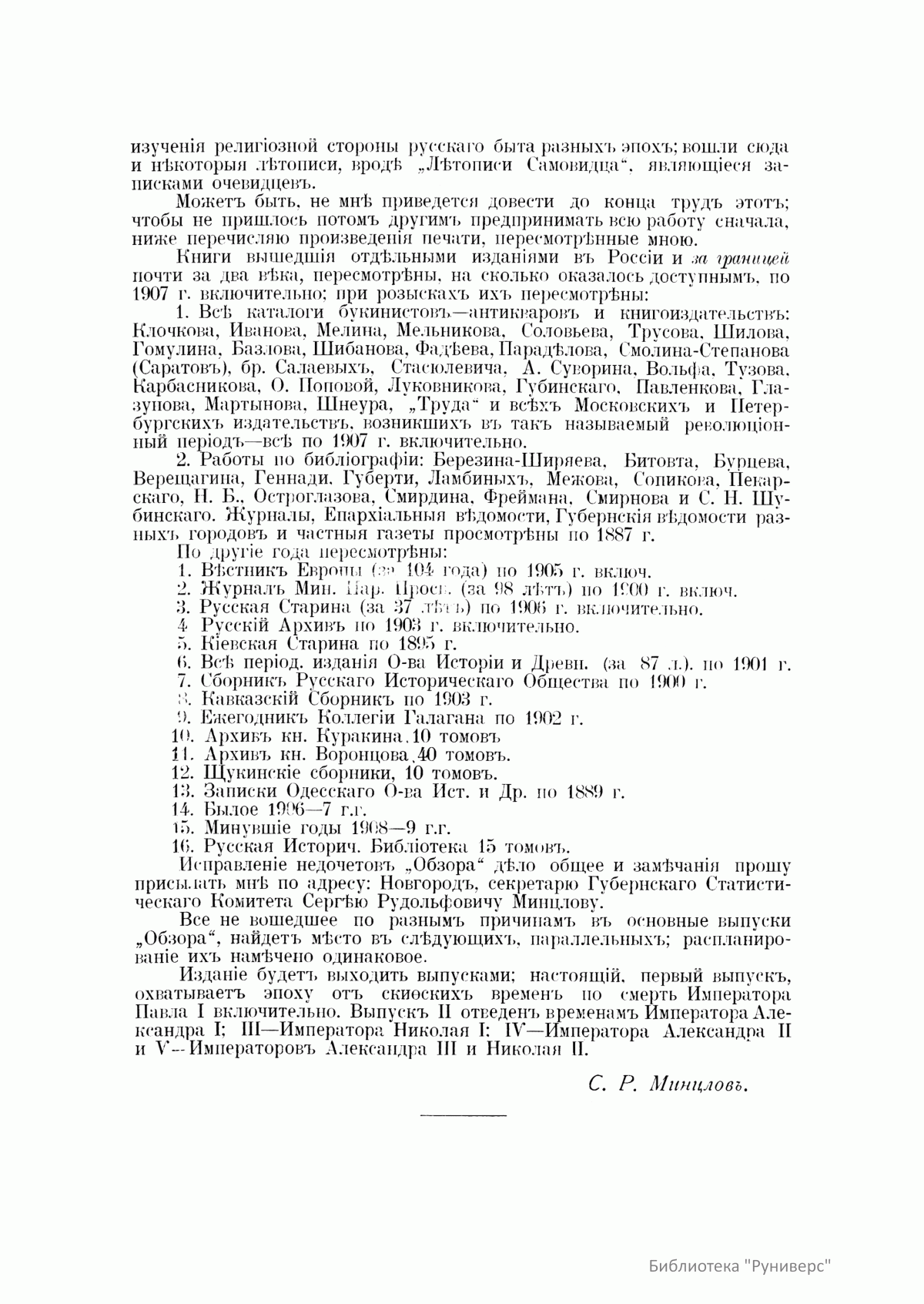 Историк-библиограф, археолог, писатель Сергей Рудольфович Минцлов (1870–1933) — крупный авторитет в области изучения и собирания старой русской книги. В 1911–1912 гг. он выпустил в свет «Обзор записок, дневников, воспоминаний, писем и путешествий, относящихся к истории России и напечатанных на русском языке». Этот библиографический указатель, включающий в себя более 5000 названий, стал результатом многолетнего труда. Минцлов просмотрел все основные библиографические пособия, каталоги букинистов-антикваров, журналы, епархиальные и губернские ведомости. Кроме того, был также использован ряд наиболее важных исторических сборников («Сборник Русского исторического общества», «Кавказский сборник», «Щукинские сборники», «Архив князя Воронцова», «Архив князя Куракина» и др.). В указателе учтено большое число различных дипломатических донесений, не относящихся к мемуарному жанру.