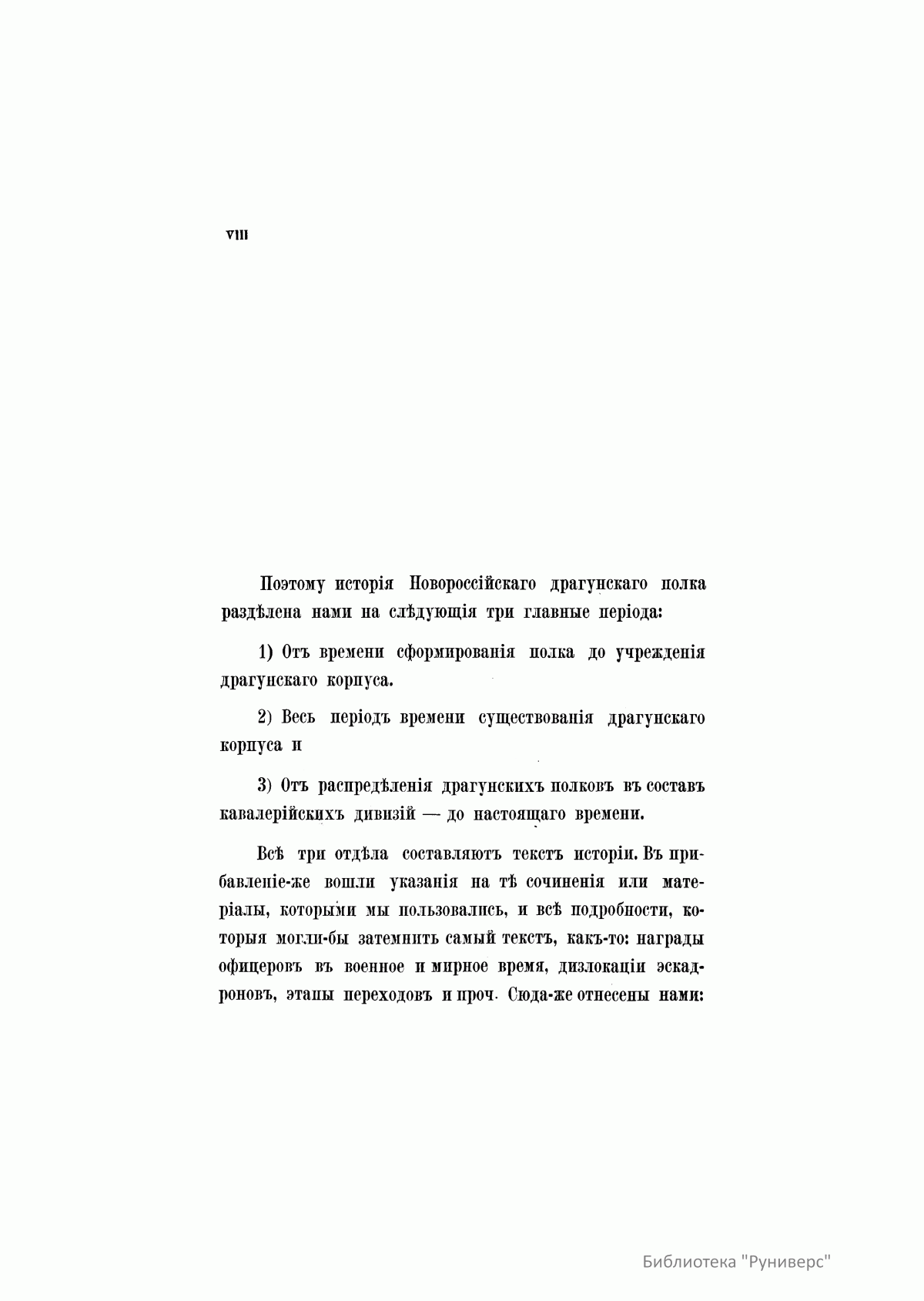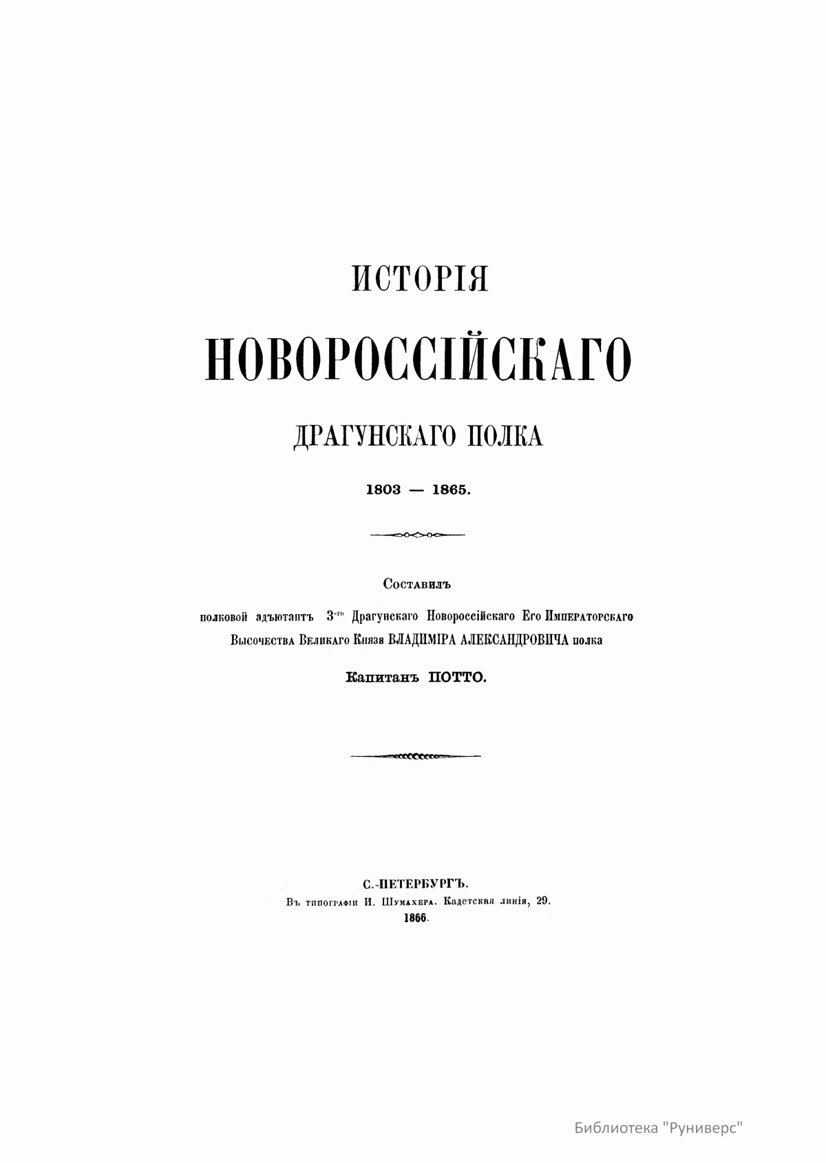Труд выдающегося русского венного историка, генерал-лейтенанта Василия Александровича Потто (1836–1911) «История Новороссийского драгунского полка» удостоился высокой оценки императора Александра II. Помимо официальной летописи боевых действий, в издании отражена внутренняя жизнь полка и те характерные черты, которые отличали полковую жизнь новороссийских драгун от других полков русской армии. В. А. Потто, получивший военное образование в Тульском Александровском кадетском корпусе, в Орловском кадетском корпусе Бахтина и в Дворянском полку, в 1855 г. был произведен в прапорщики и получил назначение в Новороссийский драгунский полк, вместе с которым участвовал в блокаде и взятии Карса во время Крымской войны, в подавлении восстания в Польше в 1863 г. Исторический очерк разделен на три главных периода: первый охватывает события от времени сформирования полка до учреждения драгунского корпуса; второй период посвящен существованию драгунского корпуса; в третьем описан временной этап от распределения драгунских полков в состав кавалерийских дивизий до 1865 г. Основной текст дополняют сведения о наградах офицеров в военное и мирное время, описания обмундирования и вооружения, списки офицеров, служивших в полку и др.