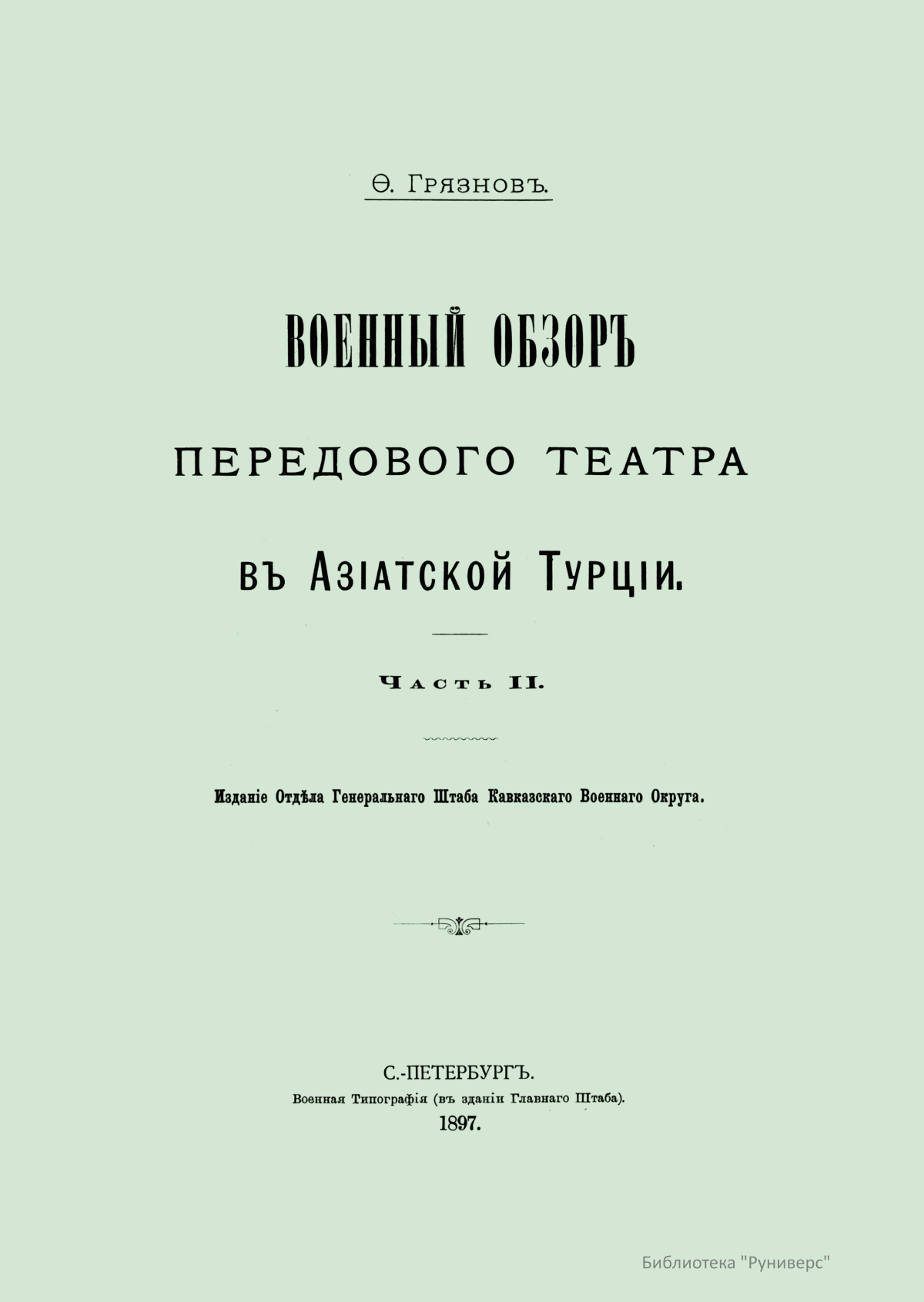 «Военный обзор передового театра в Азиатской Турции» составлен полковником Генерального штаба Ф. Ф. Грязновым по особому поручению. Книга издана в двух частях в 1895–1897 годах отделом Генерального штаба и штабом Кавказского военного округа, первая часть напечатана в Тифлисе, вторая — в Санкт-Петербурге. Обзор включает данные из компетентных русских и иностранных источников по географии, статистике и топографии района. Все сведения дополнены заметками автора, снявшего за период 1890–1892 годов 7500 верст маршрутной съемки по наиболее важным с военной точки зрения и наименее исследованным направлениям. Разведка была произведена им под прикрытием, он обследовал район в качестве пеших прогулок как надворный советник и вице-консул России в Армении. Двухтомник представляет собой военный обзор Армянского театра, как наиболее значимого для России, непосредственно прилегающего к Кавказско-Турецкой границе. Здесь представлено подробное описание и оценка его границ, орографии, гидрографии, климата, населения, экономики страны, путей сообщения, почтовых и телеграфных линий, а также краткий стратегический очерк операционных направлений от границы Закавказья в пределах рассматриваемого района. К первой части приложена цветная схема направлений, пройденных и снятых маршрутной съемкой.