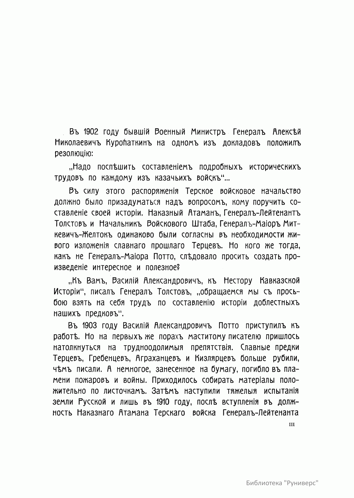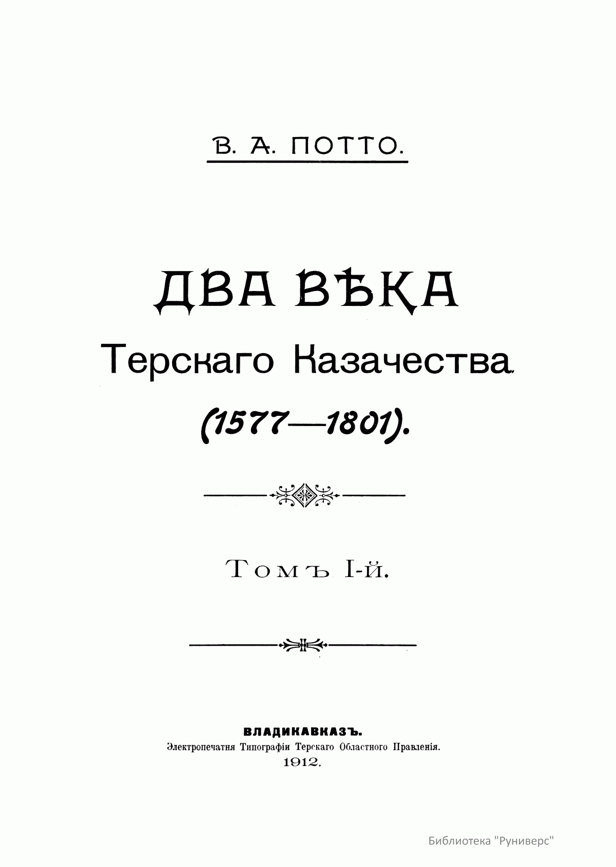 Труды выдающегося русского венного историка, генерал-лейтенанта Василия Александровича Потто (1836–1911), освещающие этапы прихода и становления русской власти в кавказском регионе, историю многолетних кавказских войн и развития казачества, обогатили русскую военную литературу и по праву считаются одними из лучших произведений кавказской тематики. Многие годы В. А. Потто собирал разрозненные документы, военные хроники и архивные материалы, чтобы отобразить общую картину драматических событий, определивших особую роль кавказских войн в истории российского государства. В 1896 г. В. А. Потто был назначен начальником военно-исторического отдела при Штабе Кавказского военного округа, где значительно расширил свою издательскую деятельность. Под его редакцией вышли «Утверждение русского владычества на Кавказе» в 8 томах, «Кавказский сборник», издававшийся в Тифлисе в 1876–1912 гг., «Памятники времен Кавказской войны», «Исторический очерк Кавказских войн от их начала до присоединения Грузии к России». «Два века терского казачества» последнее произведение В. А. Потто. В этом исследовании прослеживается роль терского казачества в истории Российского государства. Автор планировал подготовить трехтомное сочинение, но смерть помешала ему закончить задуманное, и в 1912 г. в свет вышли первые два тома издания.