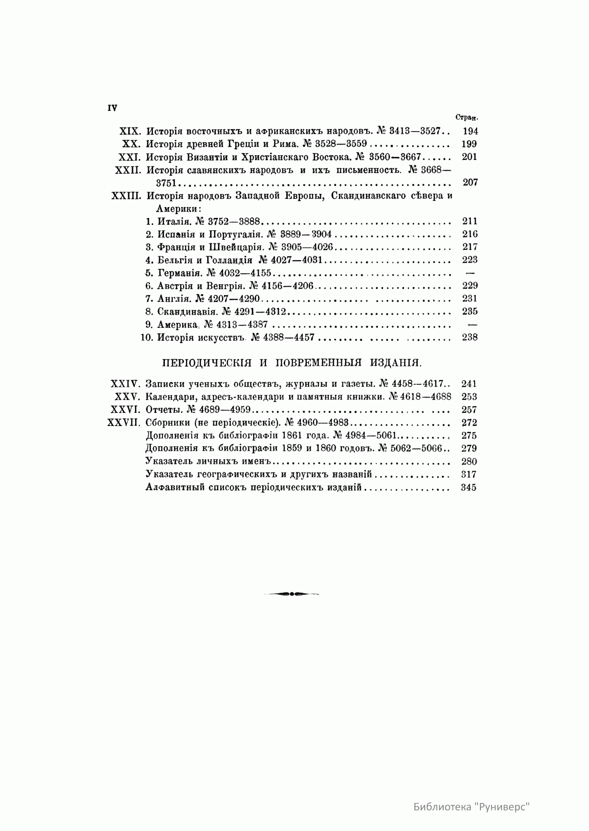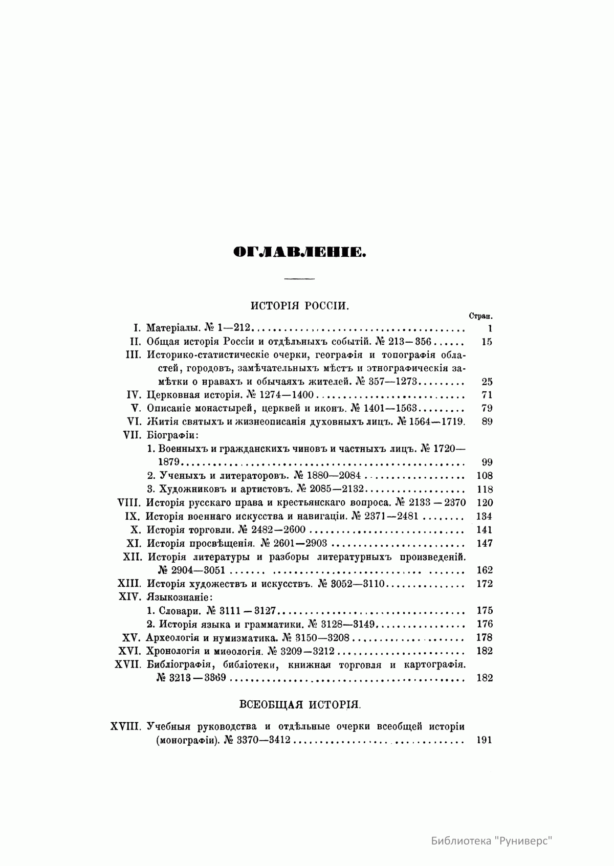 В десяти томах «Русской исторической библиографии» заключается описание свыше 44 000 книг, карт, периодических изданий, статей из журналов и газет по русской и всеобщей истории. Кроме этого, богато представлена литература о Крымской войне 1853–1856 гг., реформе 1860-х гг., польском восстании 1863–1864 гг. и о других событиях.