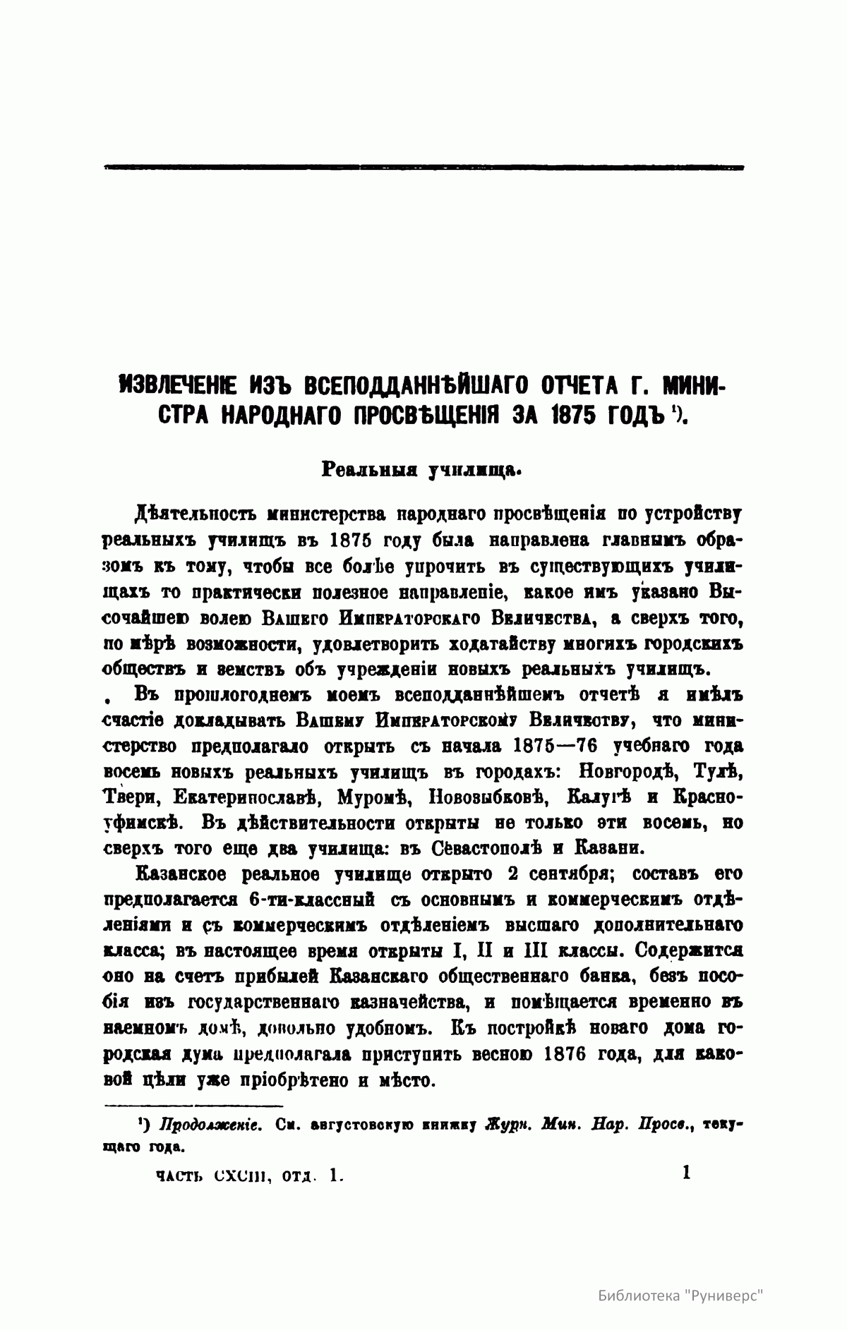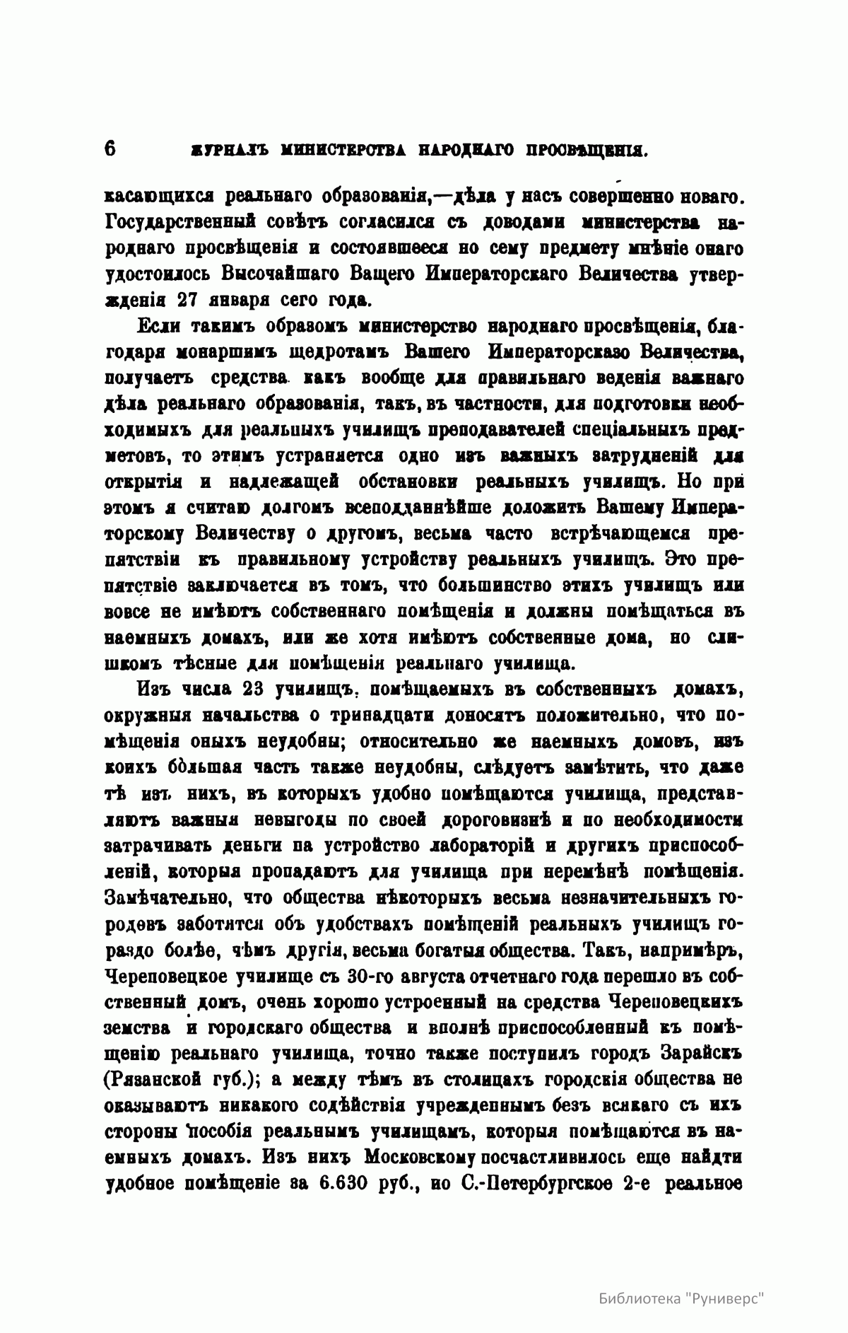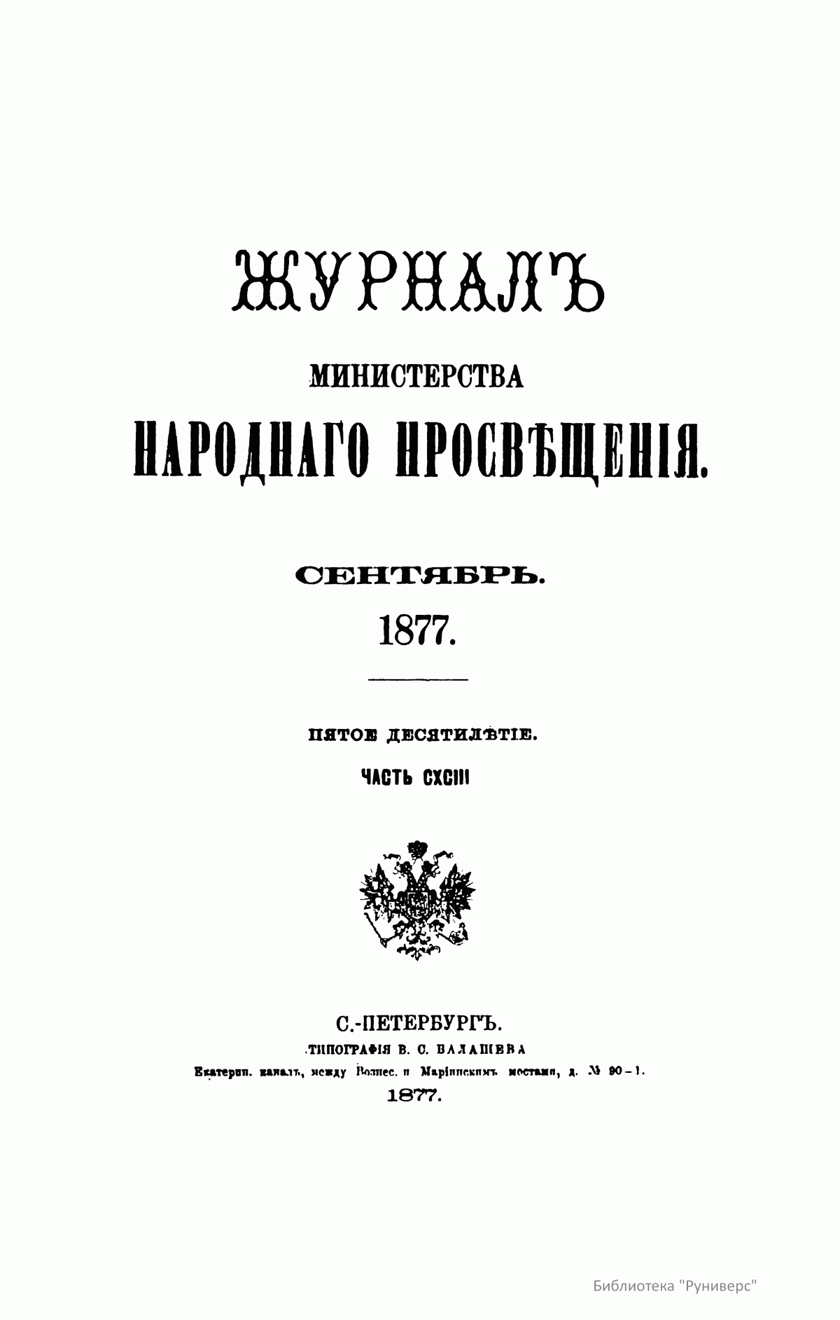 Журнал Министерства народного просвещения выходил с 1834-го по 1917 год. Официальный периодический журнал об успехах просвещения в России. Издатели журнала уверены в том, что «если для каждого человека необходим выход из грубой тьмы невежества и беспрерывное дальнейшее движение к свету, то для народов необходимо попечительное участие правительства в образовании. Только правительство имеет все средства знать и высоту успехов всемирного образования, и настоящие нужды Отечества».