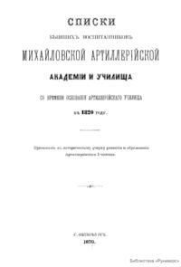 Списки бывшихъ воспитанниковъ Михайловской артиллерiйской академiи и училища со времени основанiя артиллерiйскаго училища в 1820 году