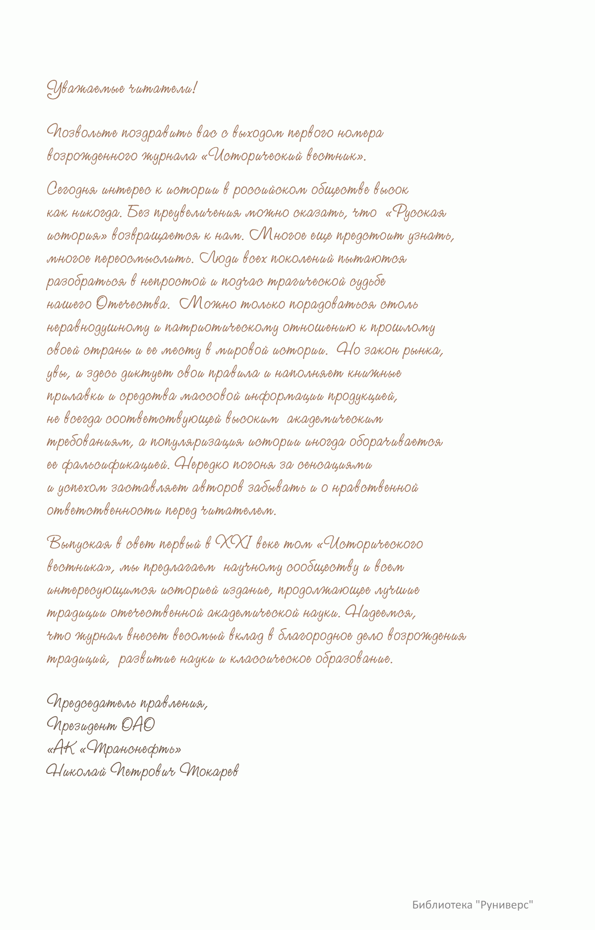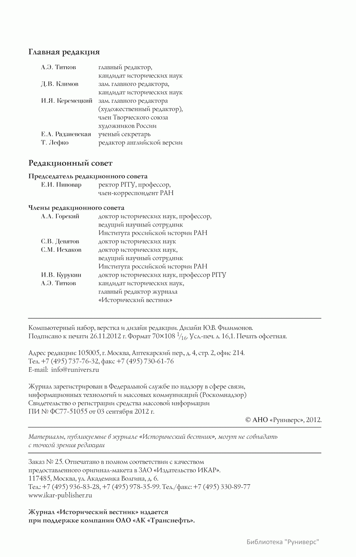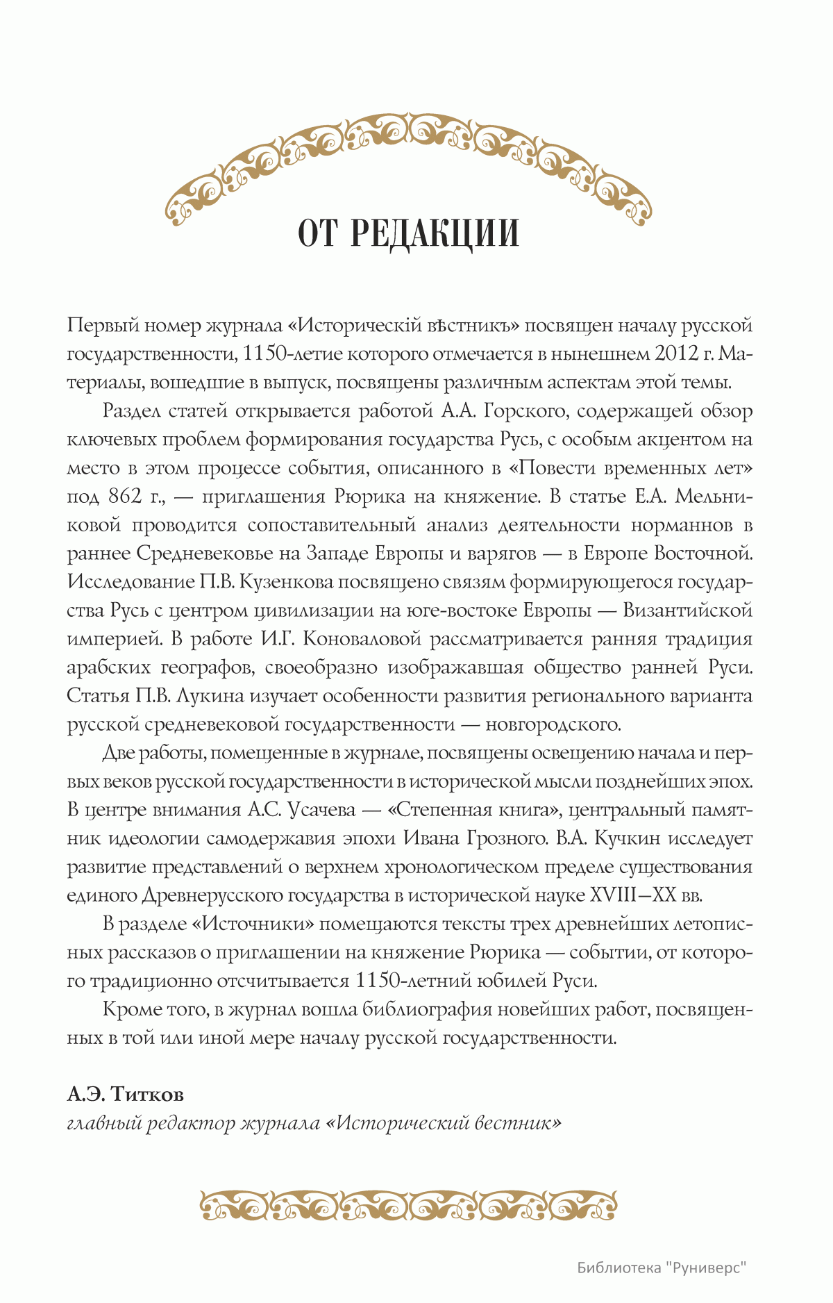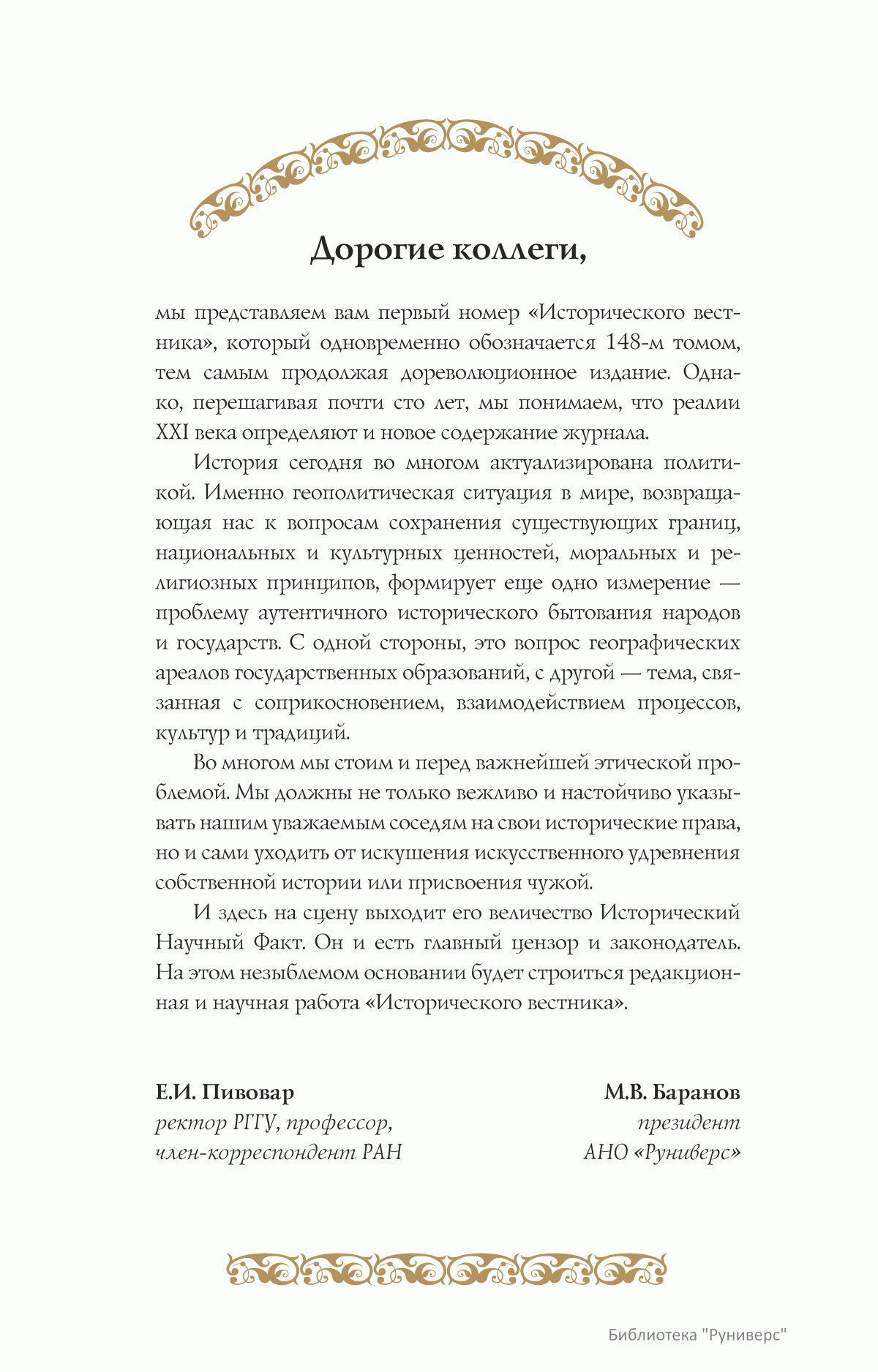 Дорогие коллеги, мы представляем вам первый номер «Исторического вестника», который одновременно обозначается 148-м томом, тем самым продолжая дореволюционное издание. Однако, перешагивая почти сто лет, мы понимаем, что реалии XXI века определяют и новое содержание журнала. История сегодня во многом актуализирована политикой. Именно геополитическая ситуация в мире, возвращающая нас к вопросам сохранения существующих границ, национальных и культурных ценностей, моральных и религиозных принципов, формирует еще одно измерение — проблему аутентичного исторического бытования народов и государств. С одной стороны, это вопрос географических ареалов государственных образований, с другой — тема, связанная с соприкосновением, взаимодействием процессов, культур и традиций. Во многом мы стоим и перед важнейшей этической проблемой. Мы должны не только вежливо и настойчиво указывать нашим уважаемым соседям на свои исторические права, но и сами уходить от искушения искусственного удревнения собственной истории или присвоения чужой. И здесь на сцену выходит его величество Исторический Научный Факт. Он и есть главный цензор и законодатель. На этом незыблемом основании будет строиться редакционная и научная работа «Исторического вестника».