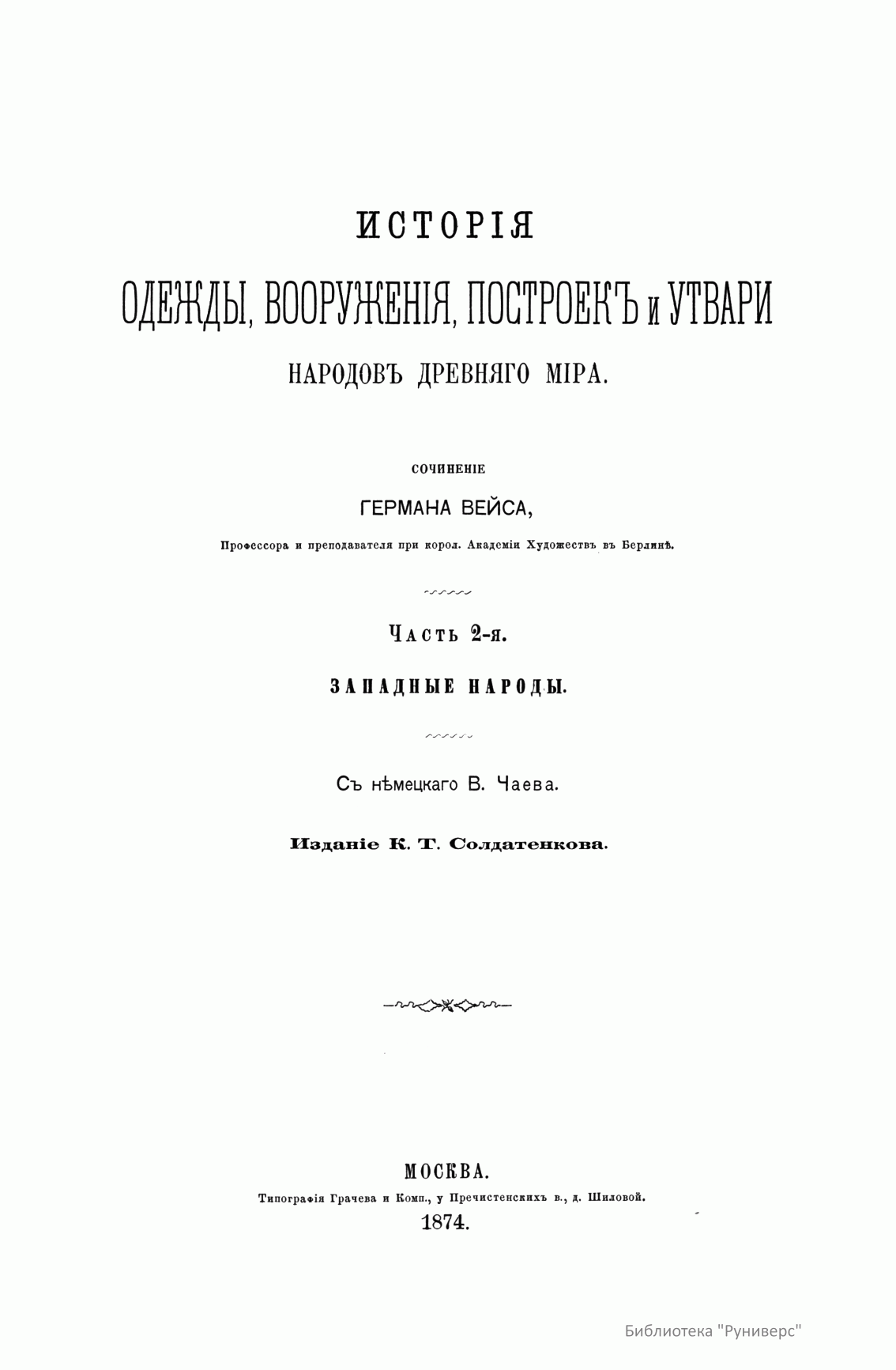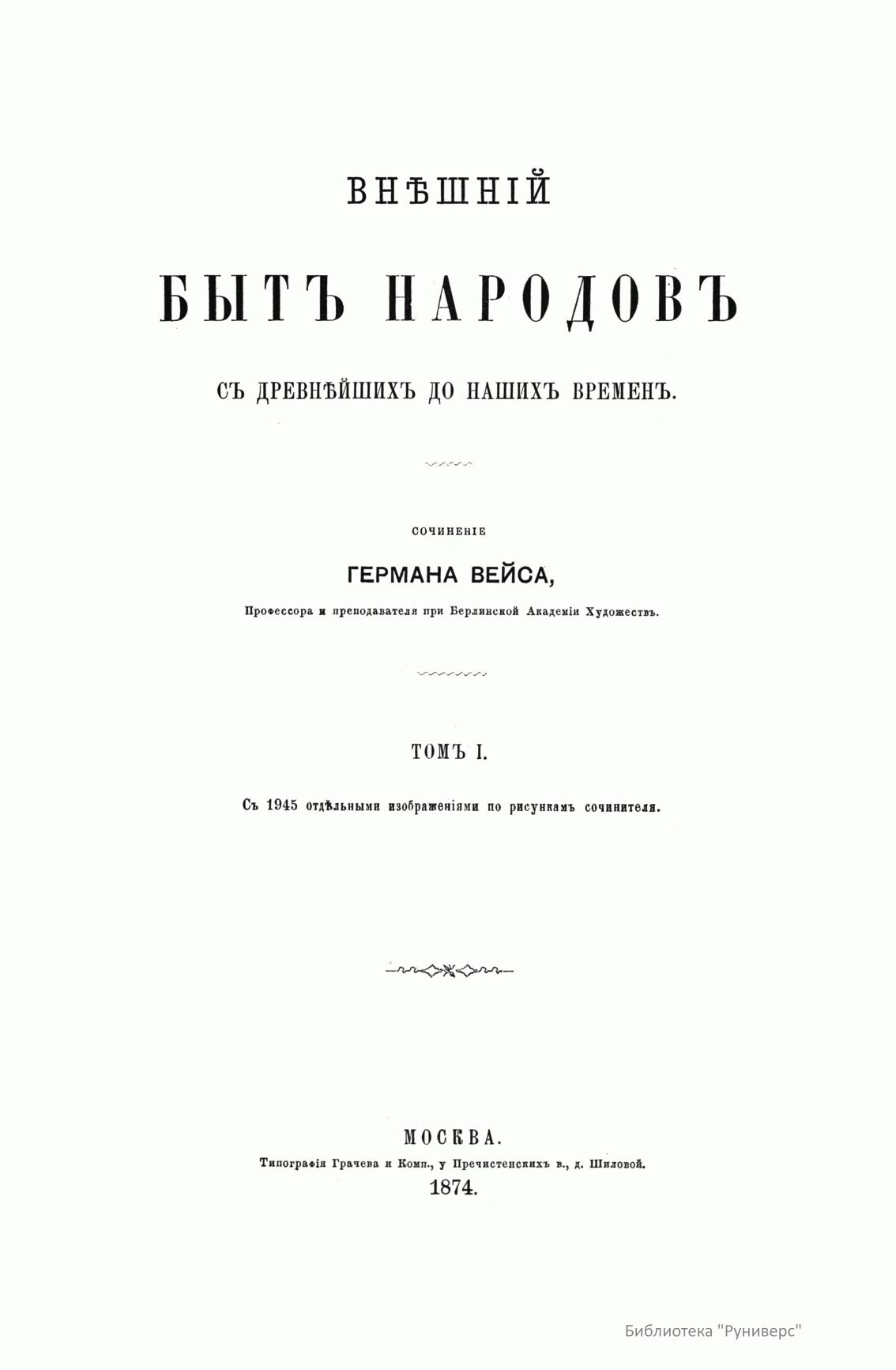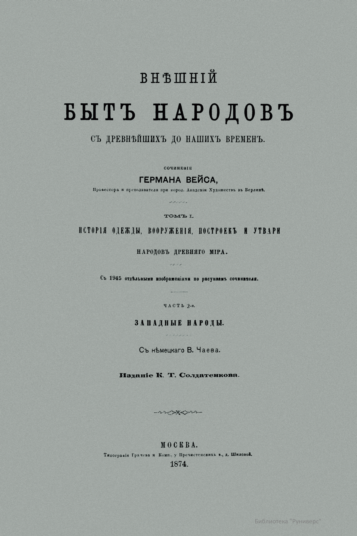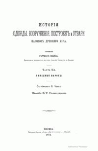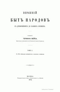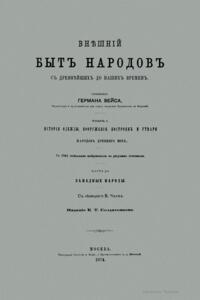 Сочинение Германа Вейса, профессора и преподавателя Берлинской Академии художеств, адресовано прежде всего художникам, а также всем интересующимся историей культуры разных народов. Книга состоит из трех частей. Первый том посвящен древнему миру (Часть первая – восточные народы: древние народы Африки (египтяне, эфиопяне), древние народы Азии (аравитяне, народы западной Азии, ассирияне и вавилоняне, мидяне и персы, евреи и финикияне, малоазийские народы, индусы, Китай). Часть вторая – западные народы: древнейшие народы Европы (народы северовосточной Европы, народы европейской Сарматии, народы северной, средней и западной Европы, народы Испании, народы Греции, народы Италии). Второй том посвящен средним векам до начала XIV столетия (Часть первая – Византия и Восток. Часть вторая – европейские народы). Третий том продолжен до второй половины XIX века (Часть первая – от XIV до XVI столетия. Часть вторая – с XVI столетия). Все содержание внешнего быта автор распределяет по трем рубрикам: одежда и вооружение, постройки, утварь (постройки рассматриваются только в первом томе, одежда и вооружение в немецком языке определяются одним словом, которому нет аналога в русском, – die Tracht). Автор придает своим рубрикам очень широкий объем. В первую рубрику кроме вооружения вместе с уборами и украшениями входит и убранство волос, и косметические средства. Вторая, «постройки», охватывает не только всякого рода здания, но и мосты, дороги, каналы, судостроение, военный стан – все то, к чему можно приложить понятие «постройки». Еще шире третья рубрика – «утварь». В нее входят боевые колесницы, осадные машины, сосуды, мебель, храмовая утварь, музыкальные инструменты, игральные приборы и пр. В книге представлены копии рисунков, сделанных автором с самых лучших и достоверных источников без малейших отступлений.
