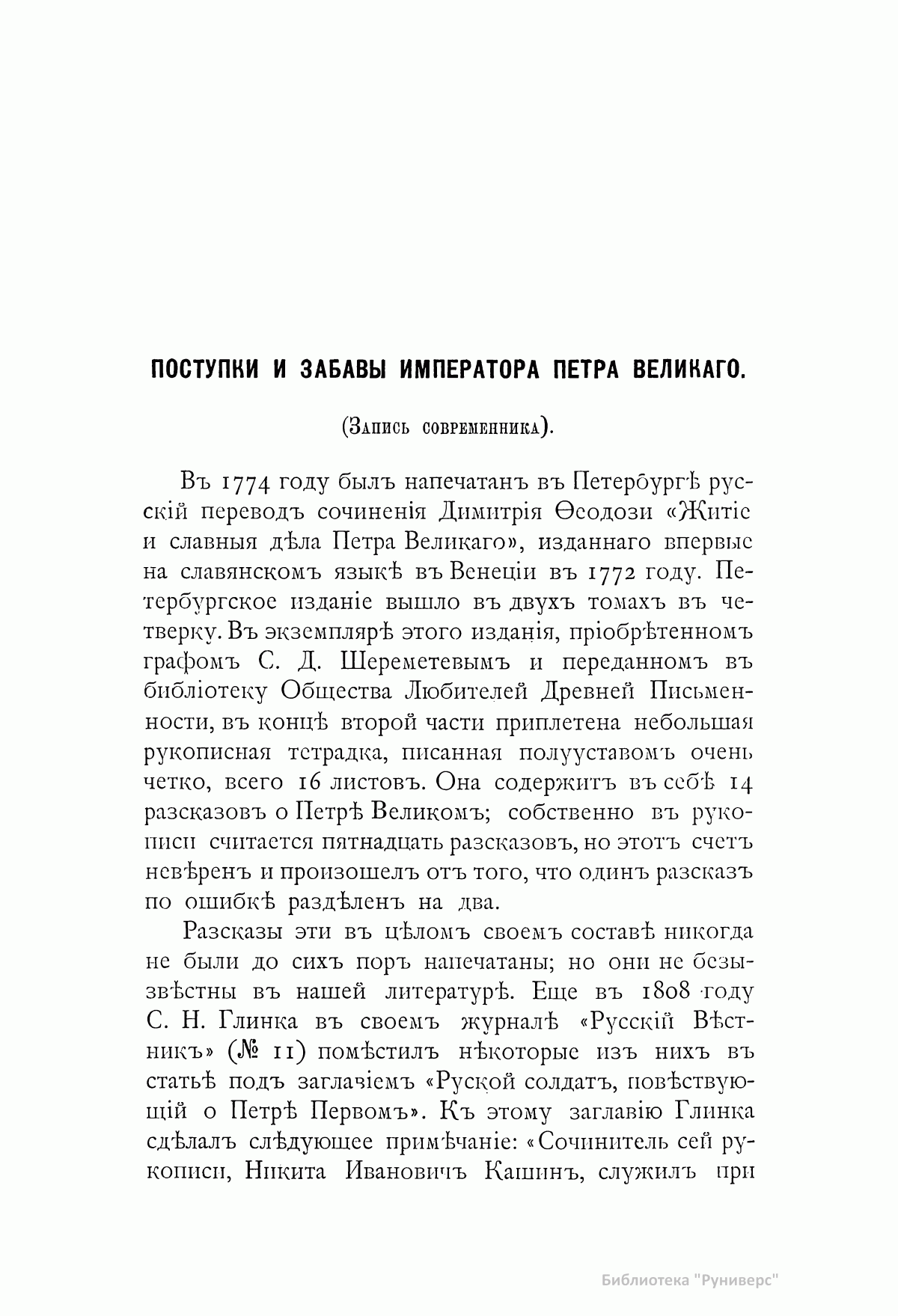 «Сочинитель сей рукописи Никита Иванович Кашин служил при Петре Великом солдатом и умер в сержантском чине. Любя чтение, он записывал все то, что видел и слышал о великом современнике своем. Рукопись свою присовокупил он к печатной книге, изданной в 1764 году в двух частях, о Петре Первом. Книги и рукописи достались по наследству его сыну, от которого переходили в разные руки». С.Н. Глинка В настоящем издании рукопись Кашина опубликована полностью. В нее входят следующие рассказы: 1. О церемонии приезда Петра Великого в праздничные дни в церковь св. Троицы на Петербургской стороне, с описанием наружности царя. 2. Об образе жизни Петра. 3. Об одежде Петра и неудовольствии его, если кто при встрече с ним на улице, кланяясь ему, останавливался. 4. О заступничестве генерал-адмирала Ф.М. Апраксина за малолетних детей дворянских, отправленных по распоряжению царя бить сваи на Мойке. 5. Об ассамблеях. 6. О славленье на святках. 7. О свадьбе князь-папы Петра Ивановича Бутурлина. 8. О раздаче судов разным лицам для обучения их навигации. 9. О некоторых привычках Петра Великого и об отвращении его от тараканов. 10.-11. Сравнение дел Петра Великого с делами его отца. 12. О фейерверке и иллюминации в Петербурге и Москве по случаю заключения Ништадского мира. 13. О походе в Персию. 14. О чудотворной иконе Казанской Божией Матери, о Феодосии Яновском и Стефане Яворском. 15. О болезни, смерти и погребении Петра Великого.