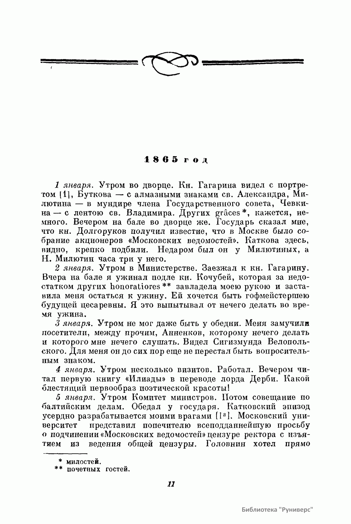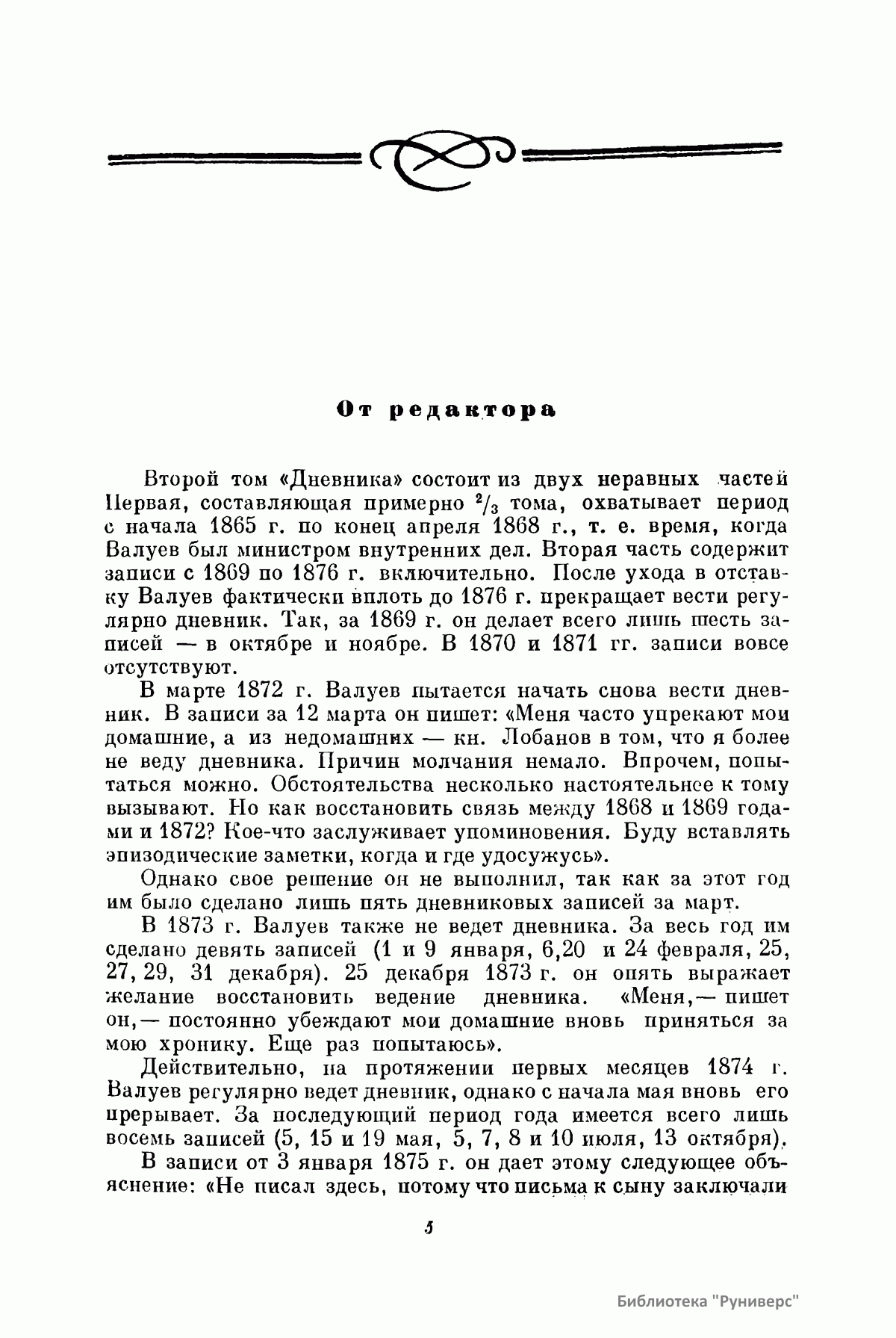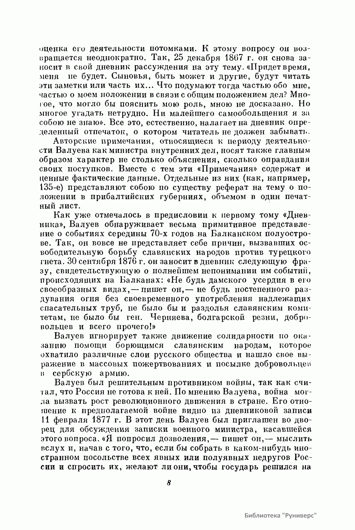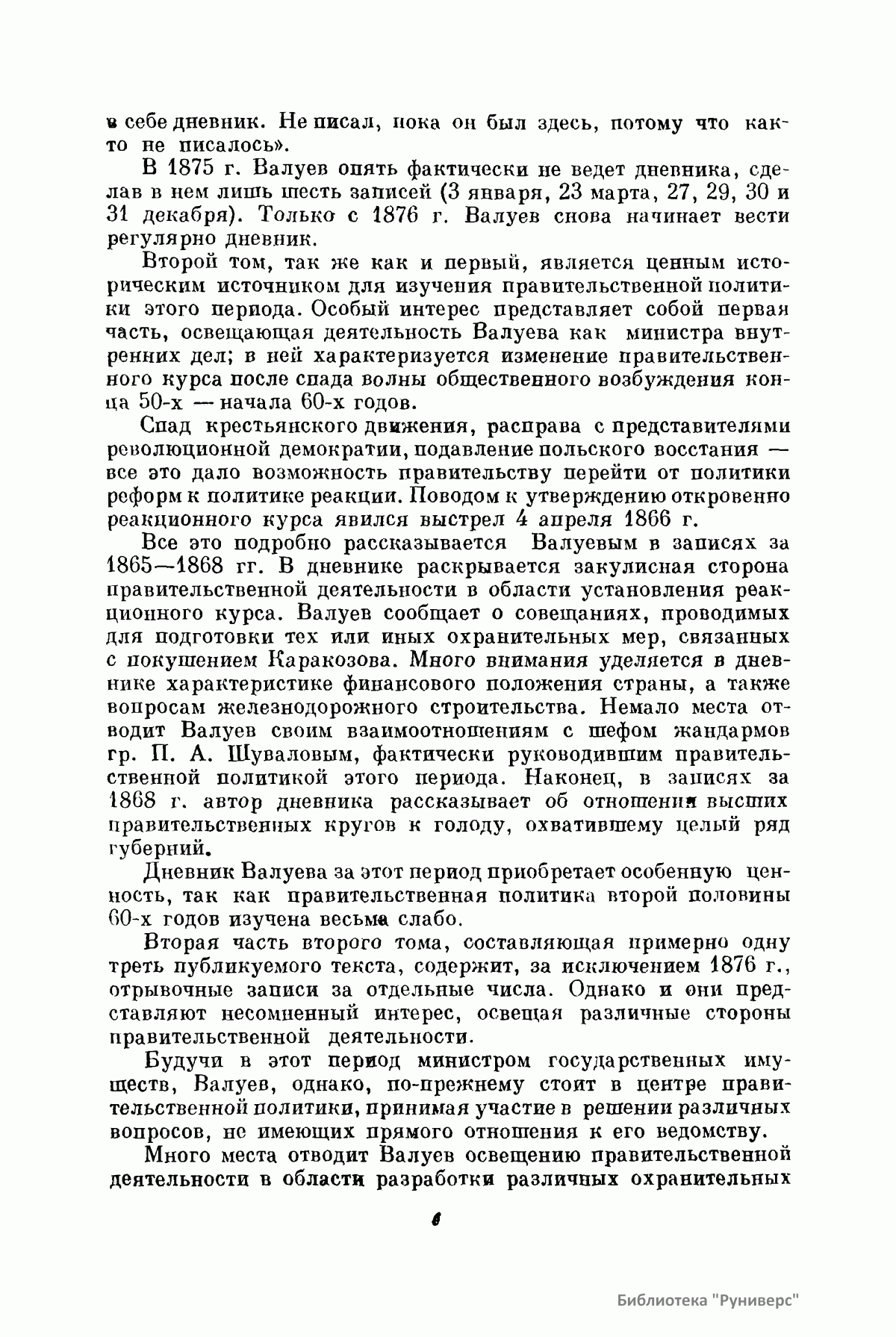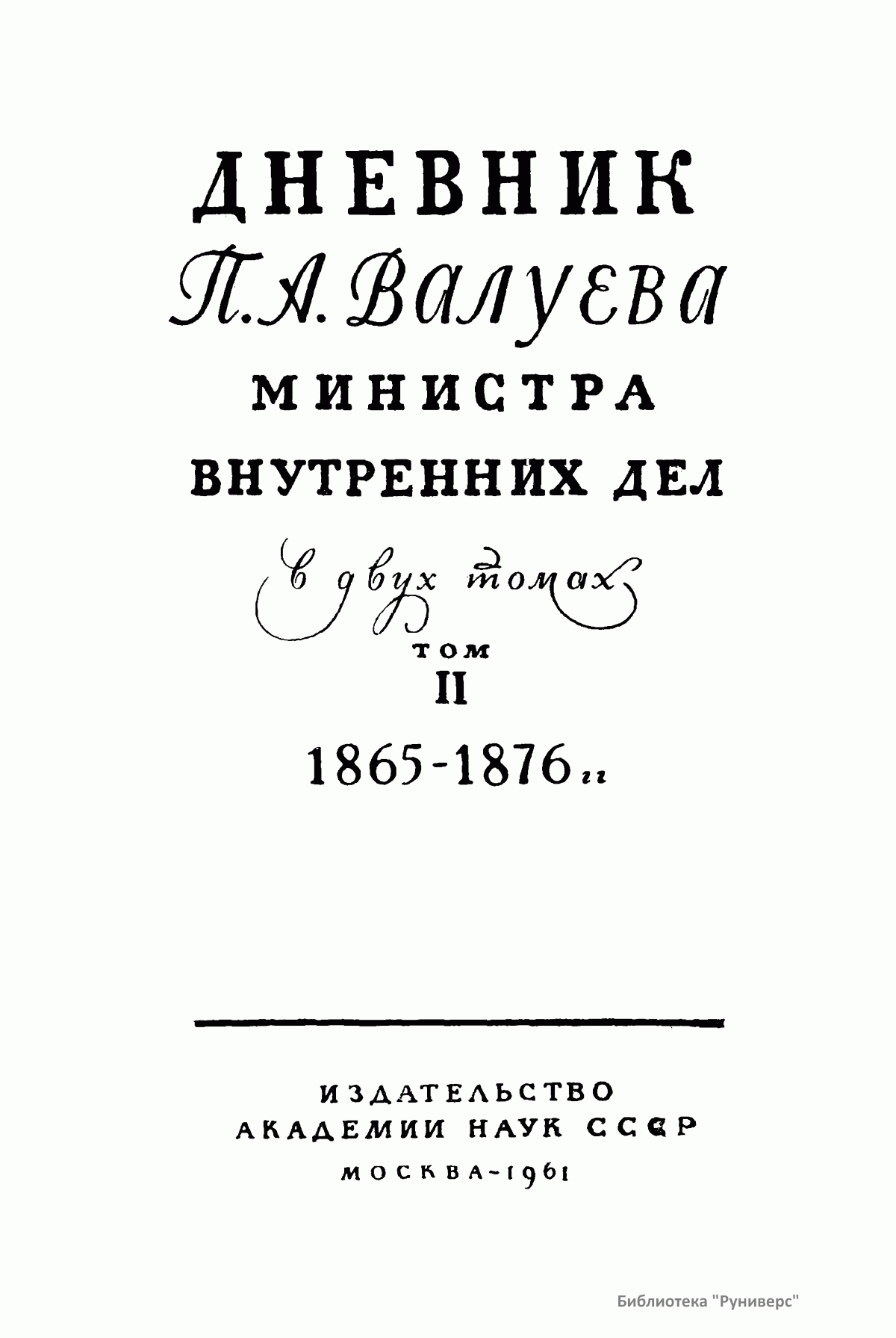 Среди дневников и воспоминаний государственных деятелей России XIX столетия дневники П. А. Валуева (1814 – 1890), министра внутренних дел Александра II, занимают одно из первых мест. Будучи крупным сановником империи, Валуев знал то, что было неизвестно многим, поэтому в его записях можно найти много ценных сведений по внутренней и внешнеполитической истории России. Наибольший интерес представляют записи первой половины 60-х, а также конца 70-х и начала 80-х годов, когда Валуев играл первостепенную роль в осуществлении политики правительства. Большим достоинством дневника является фактическая достоверность. В дневнике освещается достаточно полно последний период подготовки отмены крепостного права – обсуждение проекта Положений 19 февраля в Государственном совете; приводятся данные об опубликовании манифеста в Петербурге; освещается ход реализации реформы в 1861, 1862 и 1863 гг. и сообщается о смятении, царившем в правительственных кругах в то время. Здесь же содержатся сведения о подготовке других преобразований, главным образом земской реформе. Автор не ограничивается изложением официального обсуждения проектов, он сообщает интересные сведения о суждениях Александра II, императрицы и некоторых крупных сановников. Много места отводится в дневнике событиям в Польше: Валуев признает необходимость известных уступок в решении национального вопроса и критически относится к действиям властей. На страницах дневника приводятся сведения о деятельности революционных кружков в России в 60-х гг., распространении прокламаций; сообщается о Чернышевском, его аресте, организации над ним процесса, о роли провокатора Костомарова и т.д. Значительно меньше места в дневнике отводится вопросам внешней политики, и излагаются они преимущественно в связи с событиями в Польше и восточным кризисом середины 70-х гг. Дневник издан в двух томах: том I – 1861 – 1864 гг., том II – 1865 – 1876 гг. В первом томе публикуется биографический очерк П.А. Валуева, характеризующий его взгляды, служебную деятельность, а также литературное наследие.