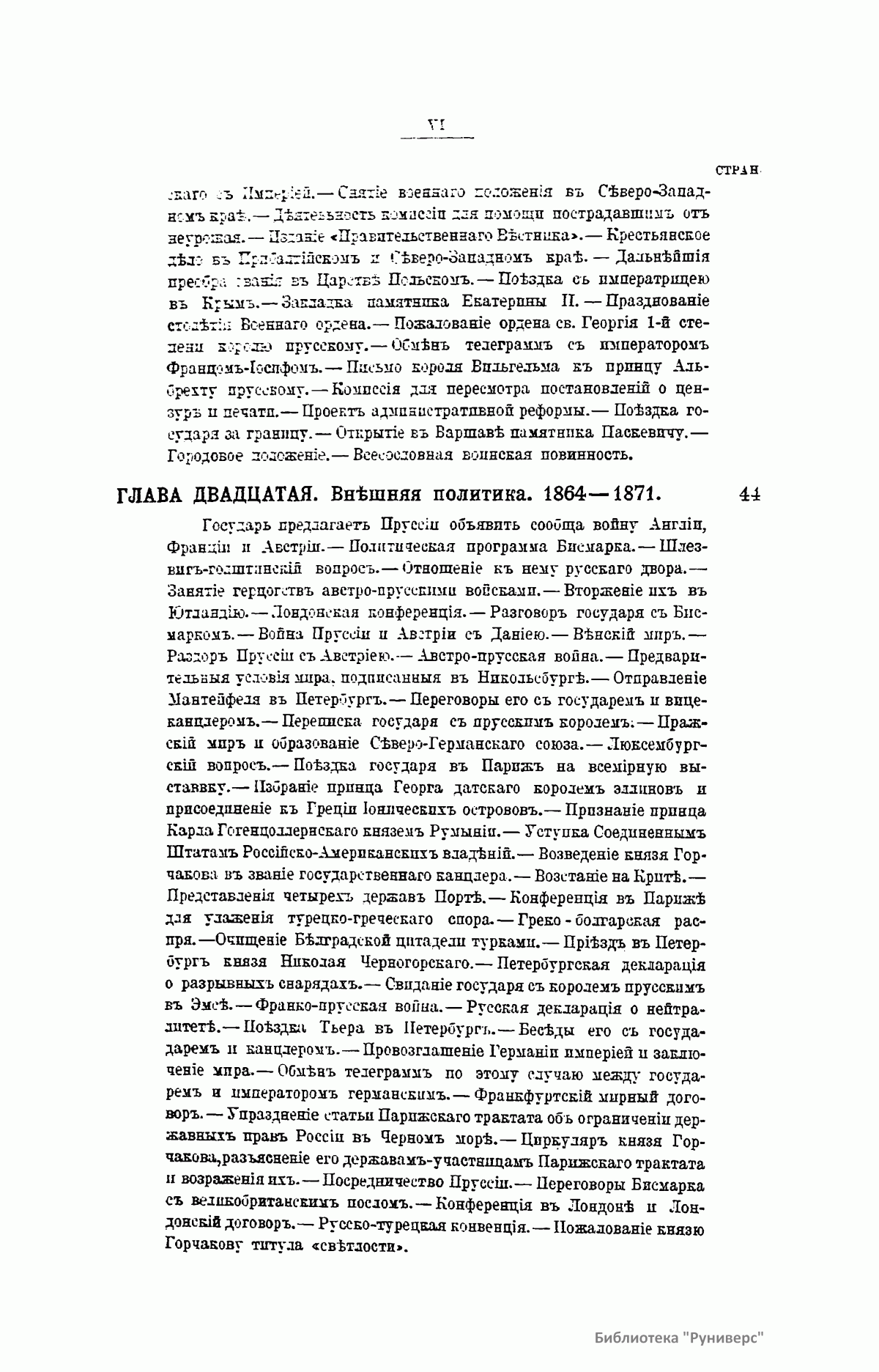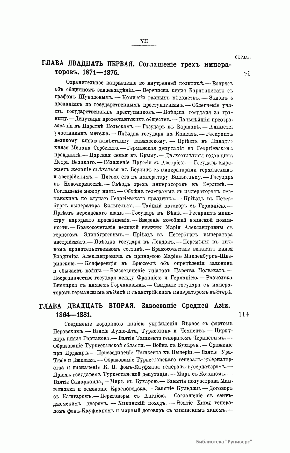 Александр II (1818 – 1881) – российский император с 1855 г. Старший сын Николая I. В 1861 г. в значительной степени благодаря его последовательности был устранен корень всех зол, терзавших Россию, – многовековое крепостное право, затем подготовлен и проведен целый комплекс реформ: судебная, земская и многие другие, открывавшие путь к созданию нового, более прогрессивного государственного устройства. В царствование Александра II завершилось присоединение к России Кавказа (1864), Казахстана (1865), большей части Средней Азии (1865 –1881). На жизнь Александра II был совершен ряд покушений (1866, 1867, 1879, 1880), убит народовольцами. Автор настоящего фундаментального труда Татищев Сергей Спиридонович видит свою задачу в том, «чтобы собрать воедино многочисленные свидетельства об отдельных моментах и эпизодах жизни и деятельности государя Александра Николаевича и, дополнив их собственными изысканиями, составить точный и по возможности полный прагматический свод событий его царствования и личного в них участия или воздействия на них императора в области политики как внутренней, так и внешней». В основание своей работы автор положил материалы, изученные им в Государственном и Главном Санкт-Петербургском архиве министерства иностранных дел, в архивах Государственного совета, бывшего III отделения Собственной Его Величества канцелярии, в Военно-ученом архиве Главного штаба. Кроме того, автор имел доступ в некоторые архивы иностранных государств и частные архивы.