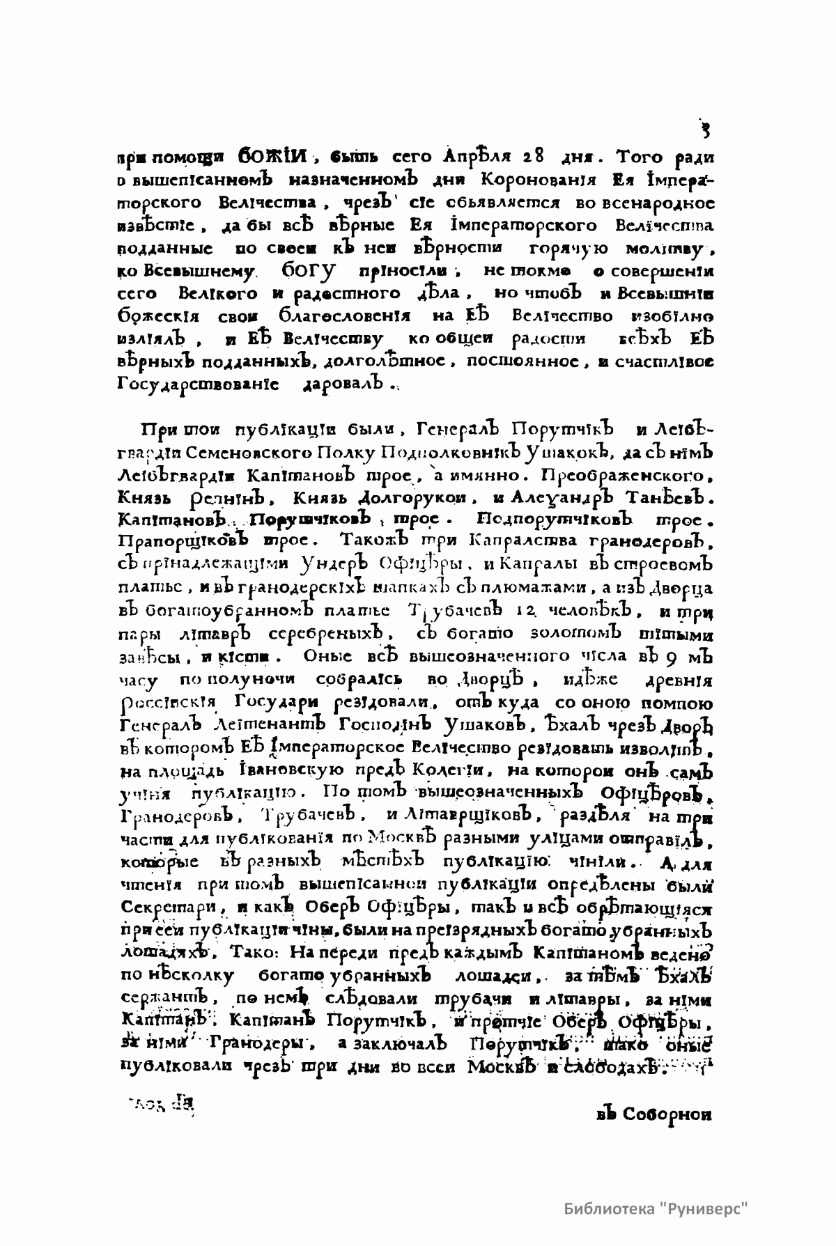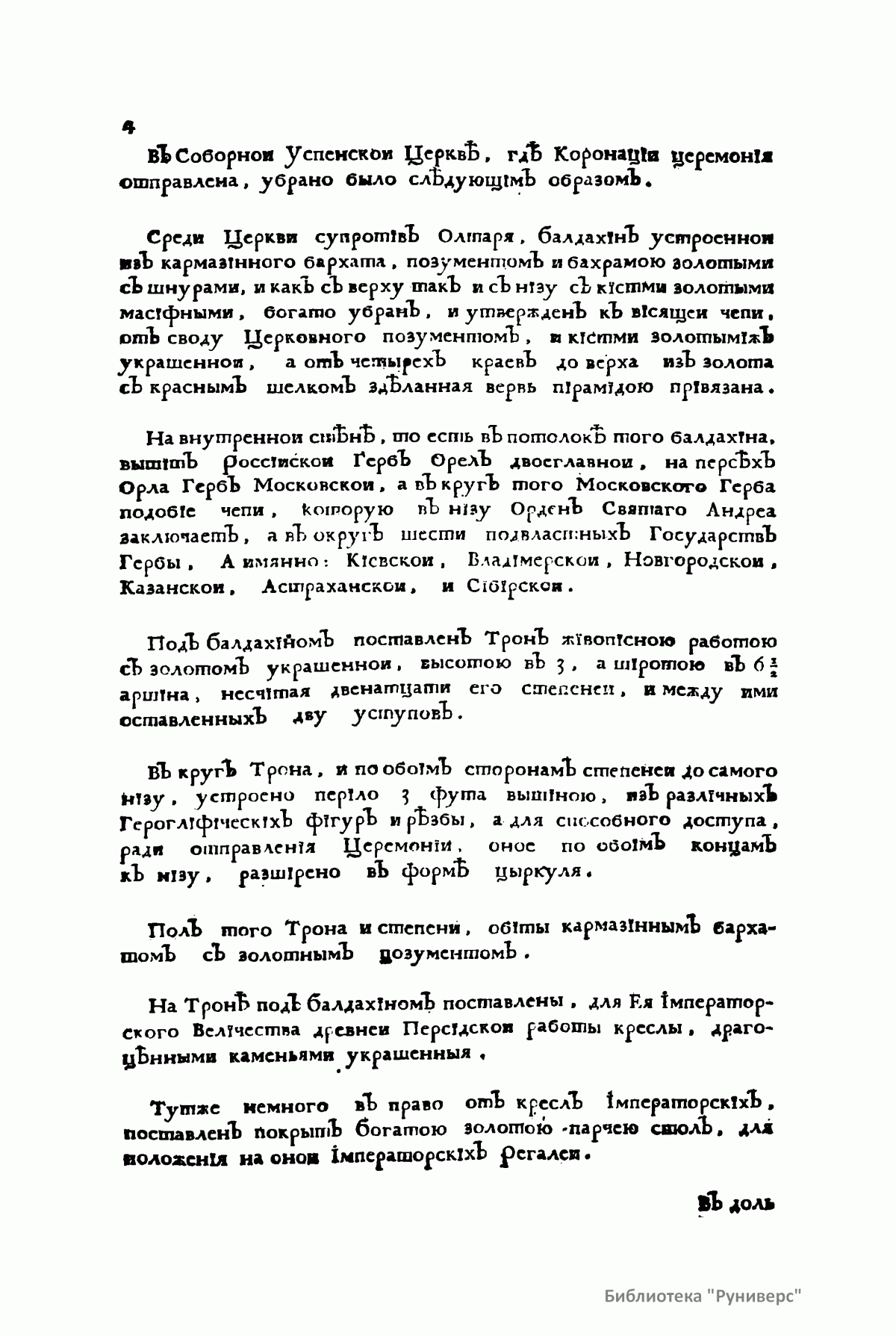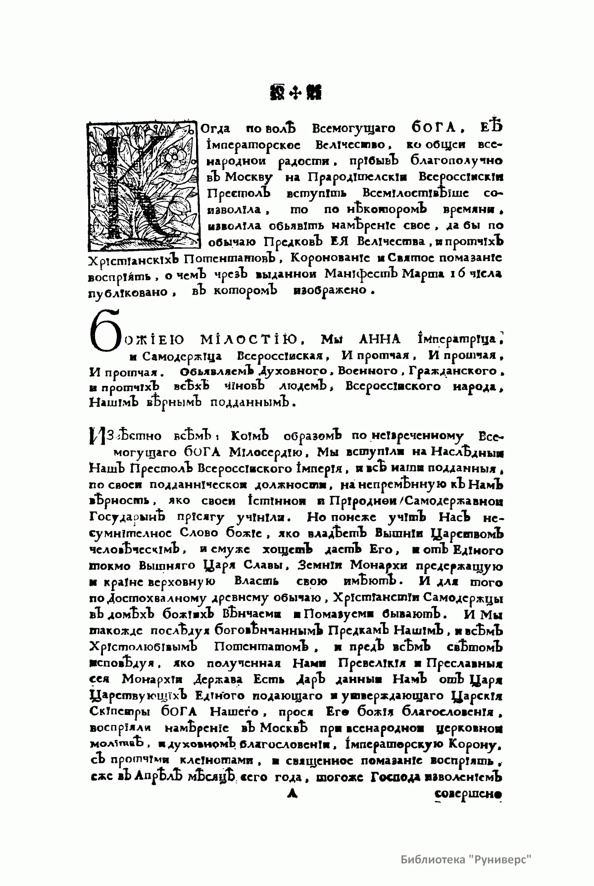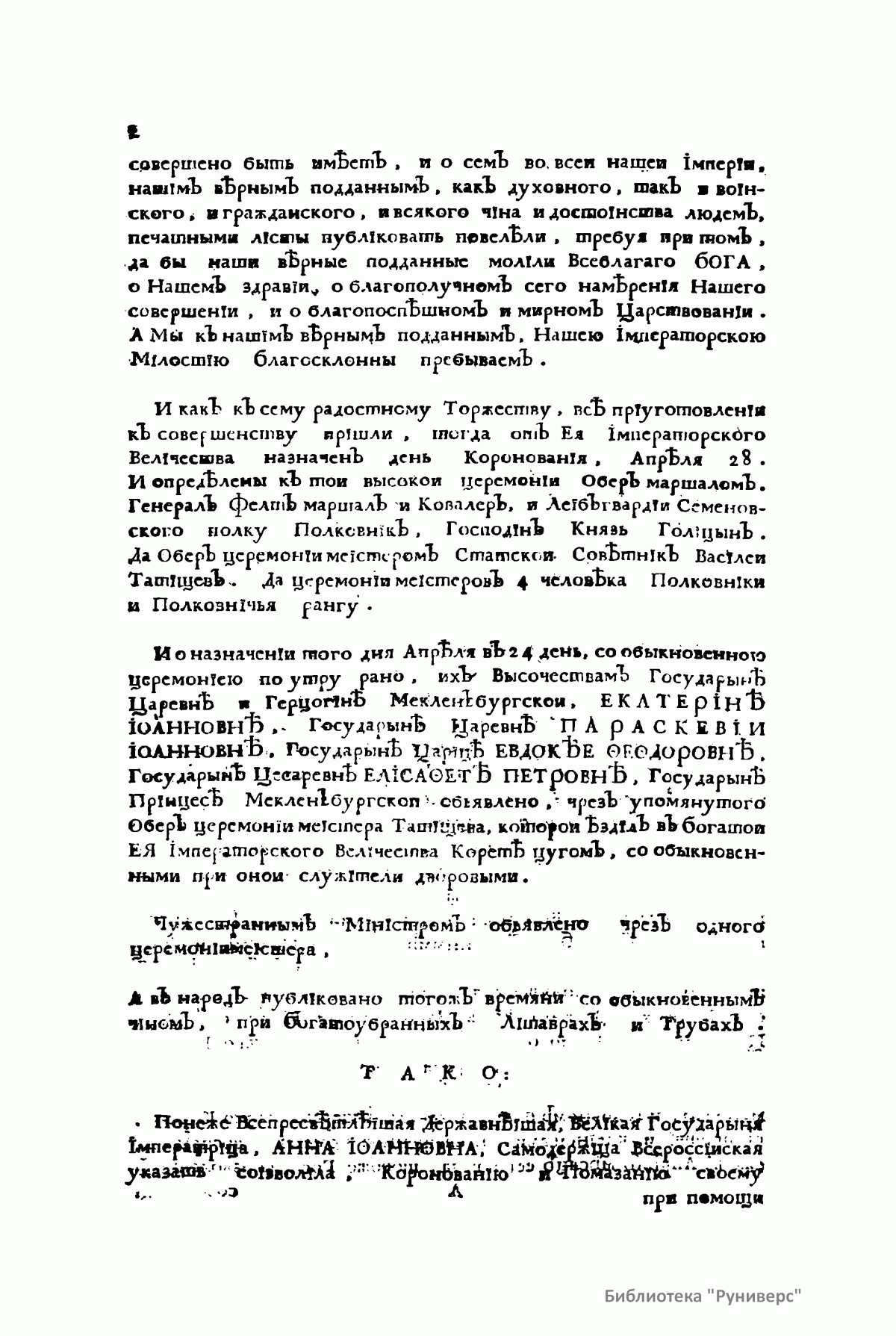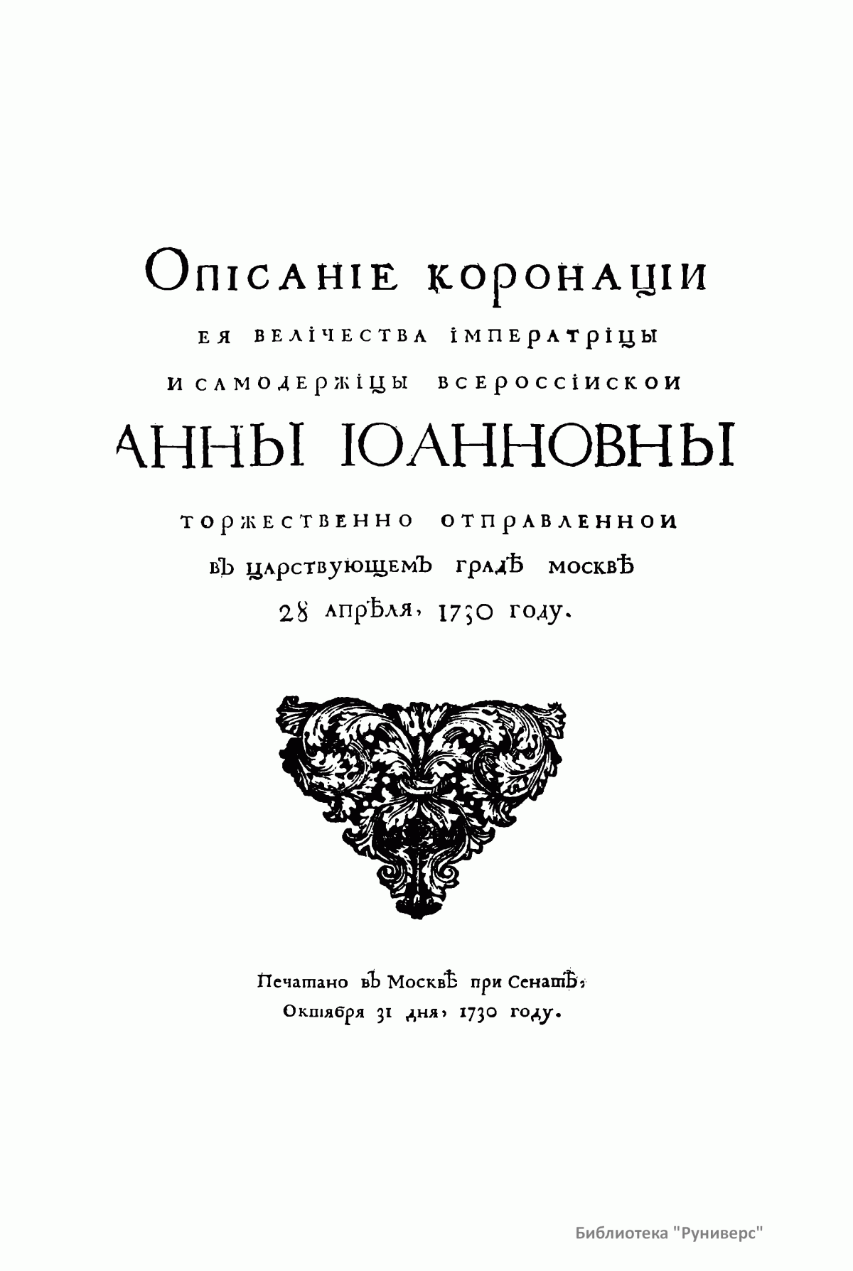 Описанiе коронацiи Ея Велiчества Iмператрiцы и Самодержiцы Всероссiйской Анны Iоанновны торжественно отправленной въ царствующемъ градѣ Москвѣ 28 апрѣля 1730 году
