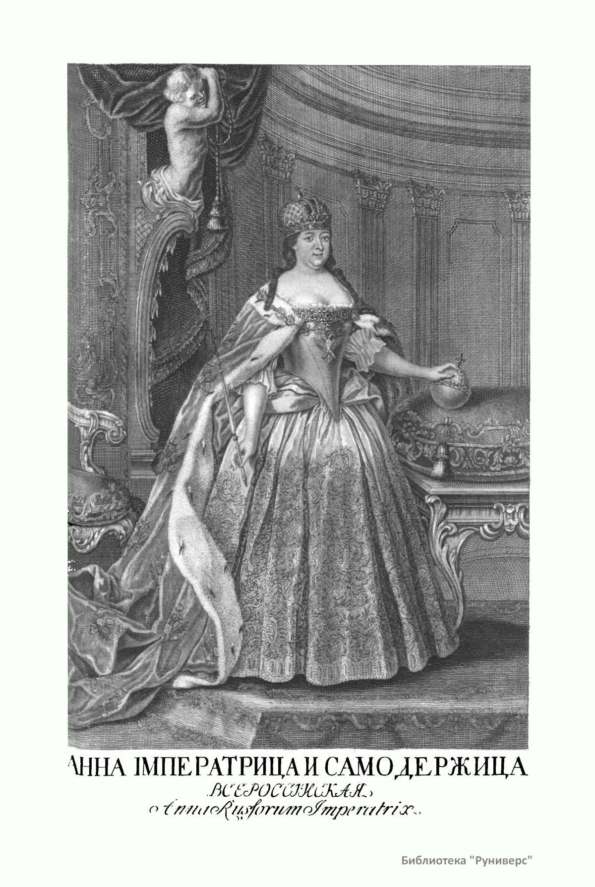 Анна Иоанновна (1693 – 1740), российская императрица с 1730 г., племянница Петра I, герцогиня курляндская с 1710 г. Возведена на престол Верховным тайным советом, стремившимся ограничить самодержавие в России. Согласившись сначала на условия «верховников», Анна уничтожила Верховный тайный совет и объявила себя самодержавною. Фактическим правителем при ней был Э.И. Бирон. В настоящем издании описана церемония коронации Анны Иоанновны. Книга снабжена иллюстрациями, представляющими обстановку и атрибуты коронации.