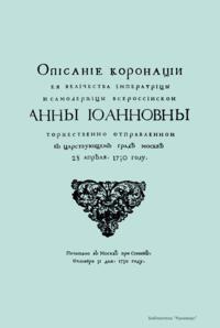 Описание коронации Ее Величества Императрицы и Самодержицы Всероссийской Анны Иоанновны торжественно отправленной в царствующем граде Москве 28 апреля 1730 году