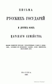 Настоящие письма изданы комиссией печатания государственных грамот и договоров, состоящей при Московском главном архиве министерства иностранных дел. Кроме материалов Главного архива комиссия пользовалась собраниями Государственного архива С.-Петербурга, Императорской публичной библиотеки и Румянцевского музея. Письма русских государей и других особ царского семейства представляют собой любопытный исторический памятник.
