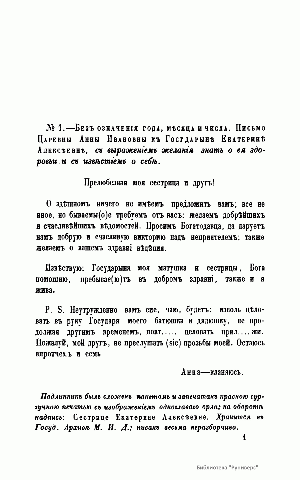 II. Переписка царицы Прасковьи Федоровны и дочерей ее Екатерины и Прасковьи