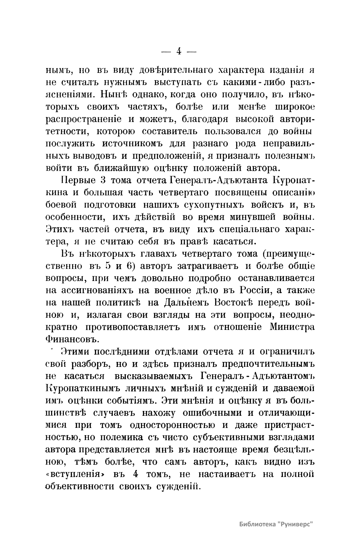 В книге русский государственный деятель Витте С.Ю. полемизирует с генерал-адъютантом Куропаткиным по поводу отчета последнего о русско-японской войне 1904 – 1905 гг. Военный министр и главнокомандующий всеми вооруженными силами, действовавшими против Японии, генерал-адъютант Куропаткин в 1906 г. издал отчет о войне в четырех томах. Первые три тома посвящены сражениям: под Ляояном, на р. Шахе, под Мукденом. В четвертом томе подведены итоги войны. Именно четвертый том Витте выбрал объектом своего исследования, так как, по его мнению, именно в нем содержатся неправильные выводы и предположения. Витте считает их односторонними и даже пристрастными. Автор не стремится исправить все допущенные ошибки, а выясняет наиболее существенные погрешности и дает ряд примеров того, насколько сильно расходится изложения автора с фактами. Русско-японская война 1904 – 1905 гг. – война за контроль в Северо-Восточном Китае и Корее. Начата Японией. Основные события 1904 г.: нападение японского флота на Порт-Артур, оборона Порт-Артура, неудачные для России сражения на р. Ялу, Ляоянское, на р. Шахе. Основные события 1905 г.: поражение русской армии при Мукдене, флота – при Цусиме. Война завершилась Портсмутским мирным договором, зафиксировавшим уступку Россией Японии южной части Сахалина и своих арендных прав на Ляодунский полуостров и Южно-Маньчжурскую железную дорогу.