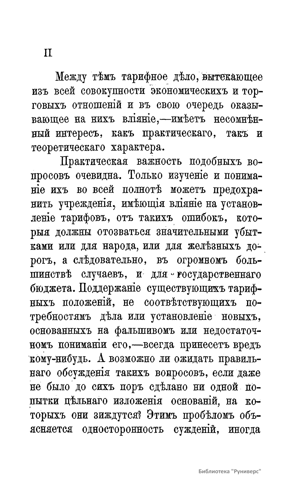 Настоящая книга состоит из статей, помещенных в журнале «Инженер» за 1883 г. Эти статьи представляют первую попытку систематического изложения на русском языке главнейших начал, лежащих в основе железнодорожного тарифного дела. Тарифное дело, вытекающее из всей совокупности экономических и торговых отношений и, в свою очередь, на них влияющее, имеет несомненный интерес как практического, так и теоретического характера. Только изучение и понимание тарифных вопросов во всей их полноте может предохранить учреждения, имеющие влияние на установление тарифов, от таких ошибок, которые должны отозваться значительными убытками или для народа, или для железных дорог, а следовательно, в огромном большинстве случаев и для государственного бюджета. Теоретическая сторона тарифного дела имеет важное значение потому, что практика в подобных государственных вопросах не может не сообразовываться с выводами, основанными на научных данных. Тарифное дело как теория, вытекая прямо из экономического закона спроса и предложения, представляет в своем дальнейшем развитии результаты, зависящие от взаимодействия элементов экономической, политической и даже умственной жизни народа. Эта игра влияний представляет собой в высшей степени интересный предмет для изучений мыслителя и экономиста.