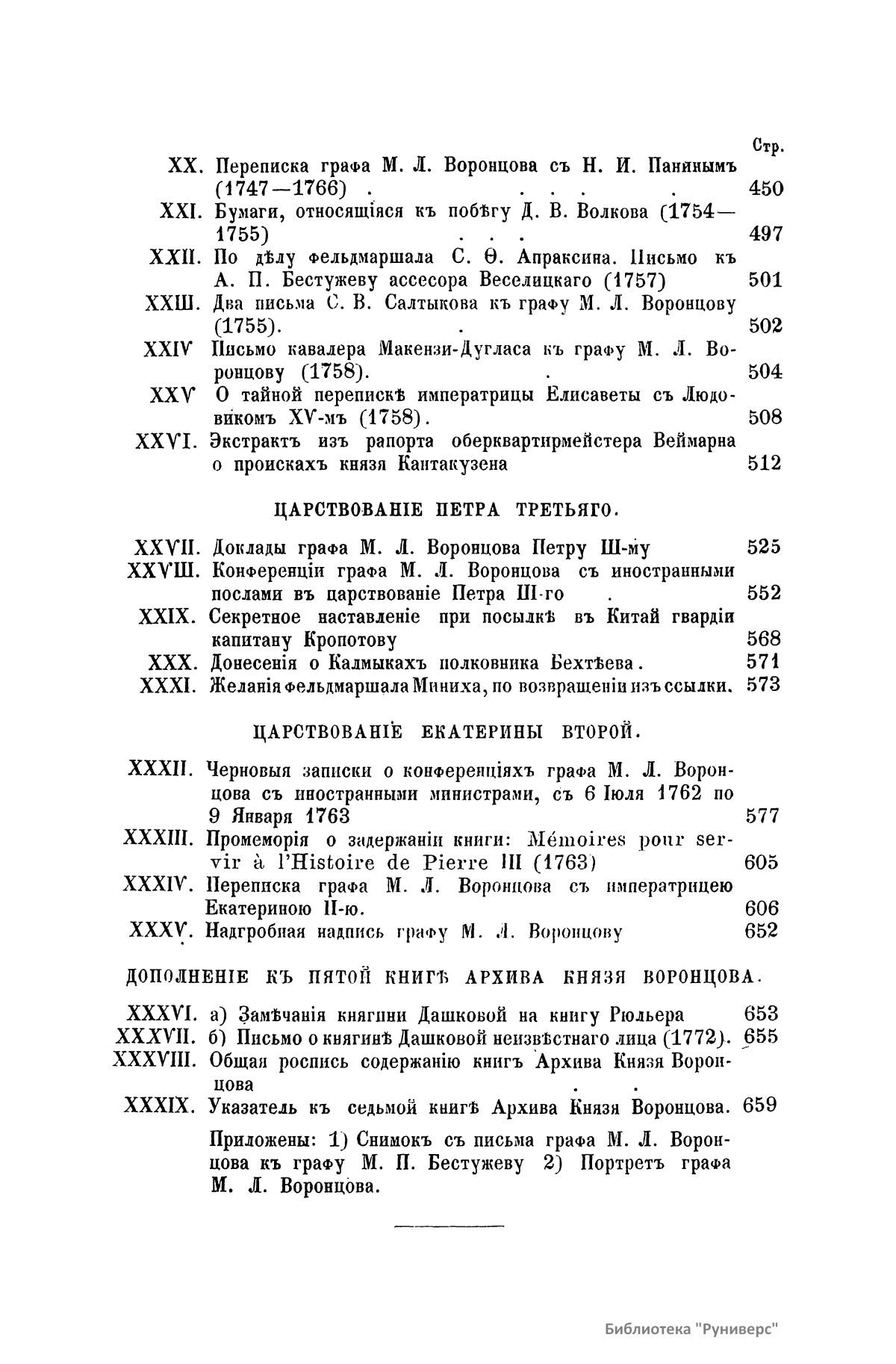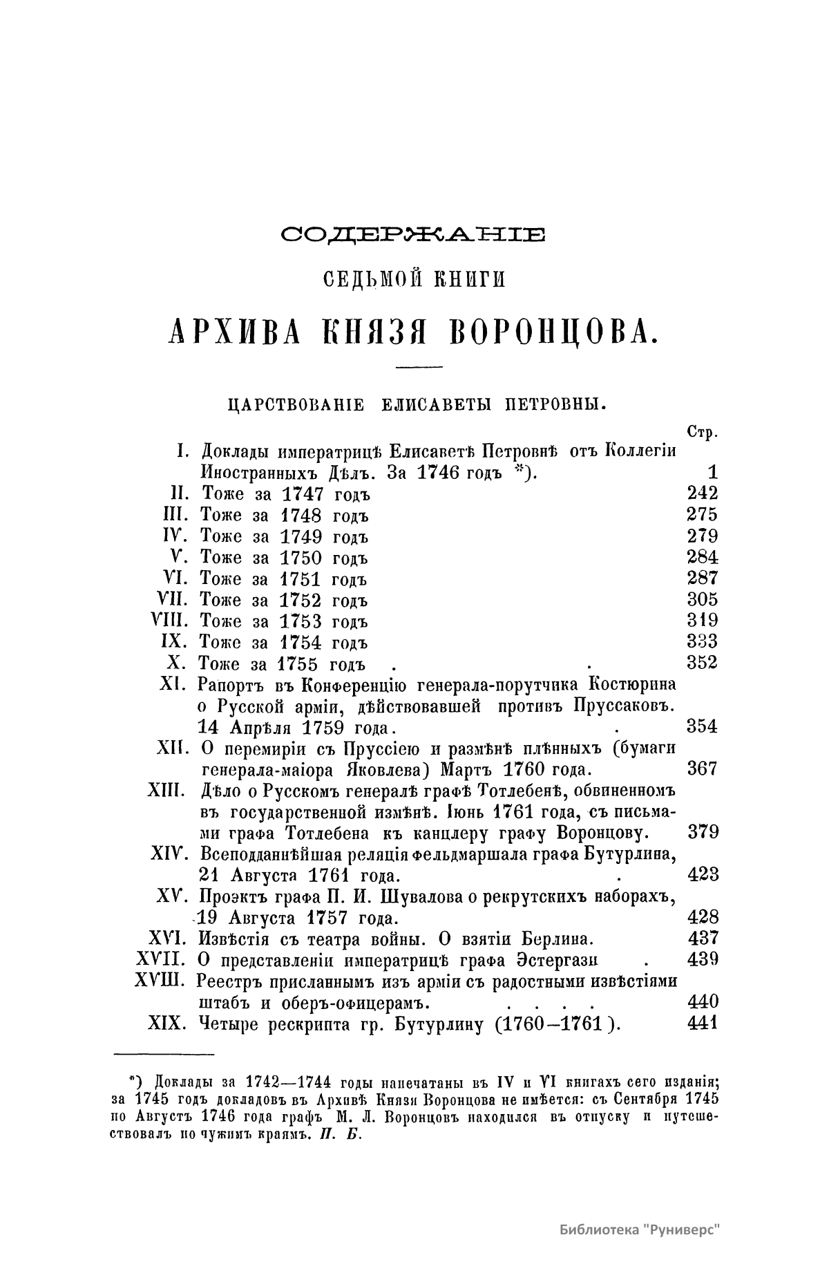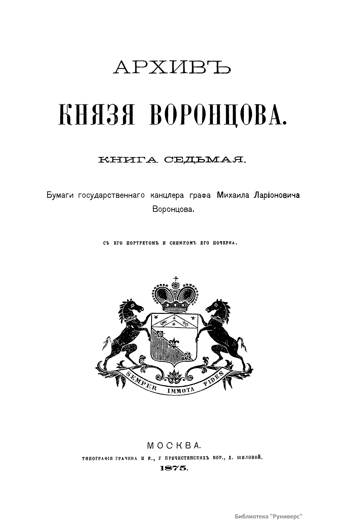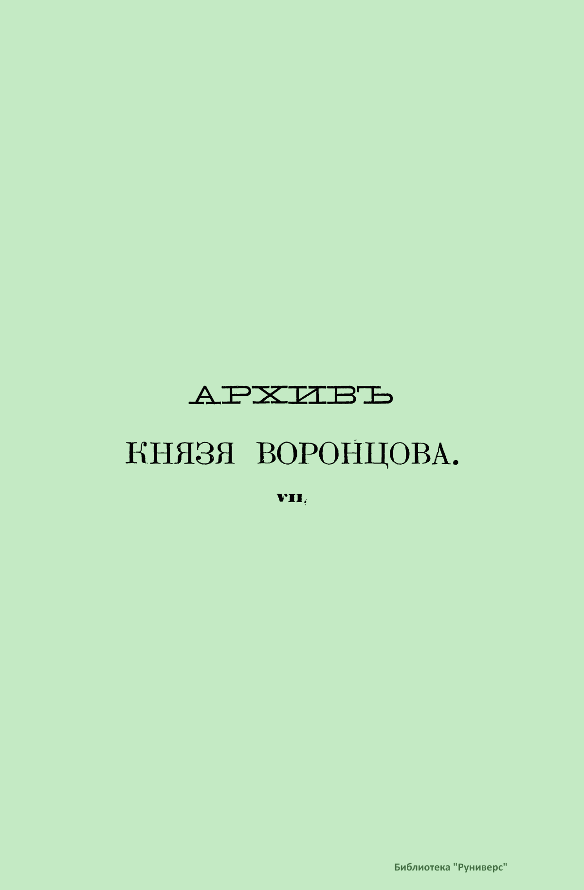Издание представляет документы из архива графов (с 1845 г. князей) Воронцовых, крупных политических деятелей России XVIII и XIX вв.: Михаила Илларионовича (1714 – 1767) – канцлера при Елизавете Петровне; Романа Илларионовича (1707 – 1783); Александра Романовича (1741 – 1805) – канцлера в 1802 – 1804 гг.; Семена Романовича (1744 – 1832) – посла в Англии в 1785 – 1806 гг.; Михаила Семеновича (1782 – 1856) – фельдмаршала, наместника Кавказа в 1845 – 1853 гг. Архив издан в 40 тт. (1870 – 1895) под редакцией П. И. Бартенева. Содержит огромный материал по внешней политике, по управлению хозяйством Елизаветы Петровны (кн. 1), по делу Миниха и Бирона (кн. 2), о «чумном бунте» 1771 г. в Москве, о движении Е. И. Пугачева (кн. 16), о А. Н. Радищеве (кн. 5, 12, 24). Книга 21-я занята «Записками» Е. Р. Воронцовой (Дашковой). В книге 24-й – свыше 100 писем А. В. Суворова. Среди обширной переписки Воронцовых встречаются письма Вольтера, Д'Аламбера, Жозефа де Местра, Костюшки, Талейрана, Питта и др.
