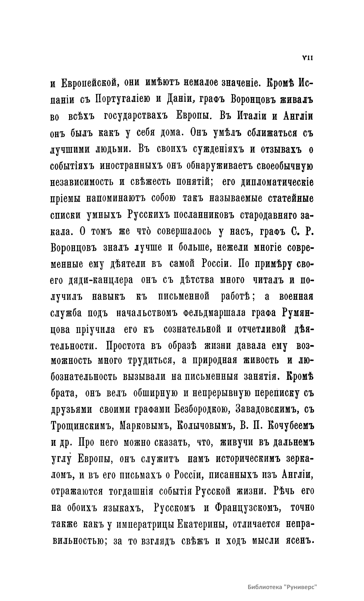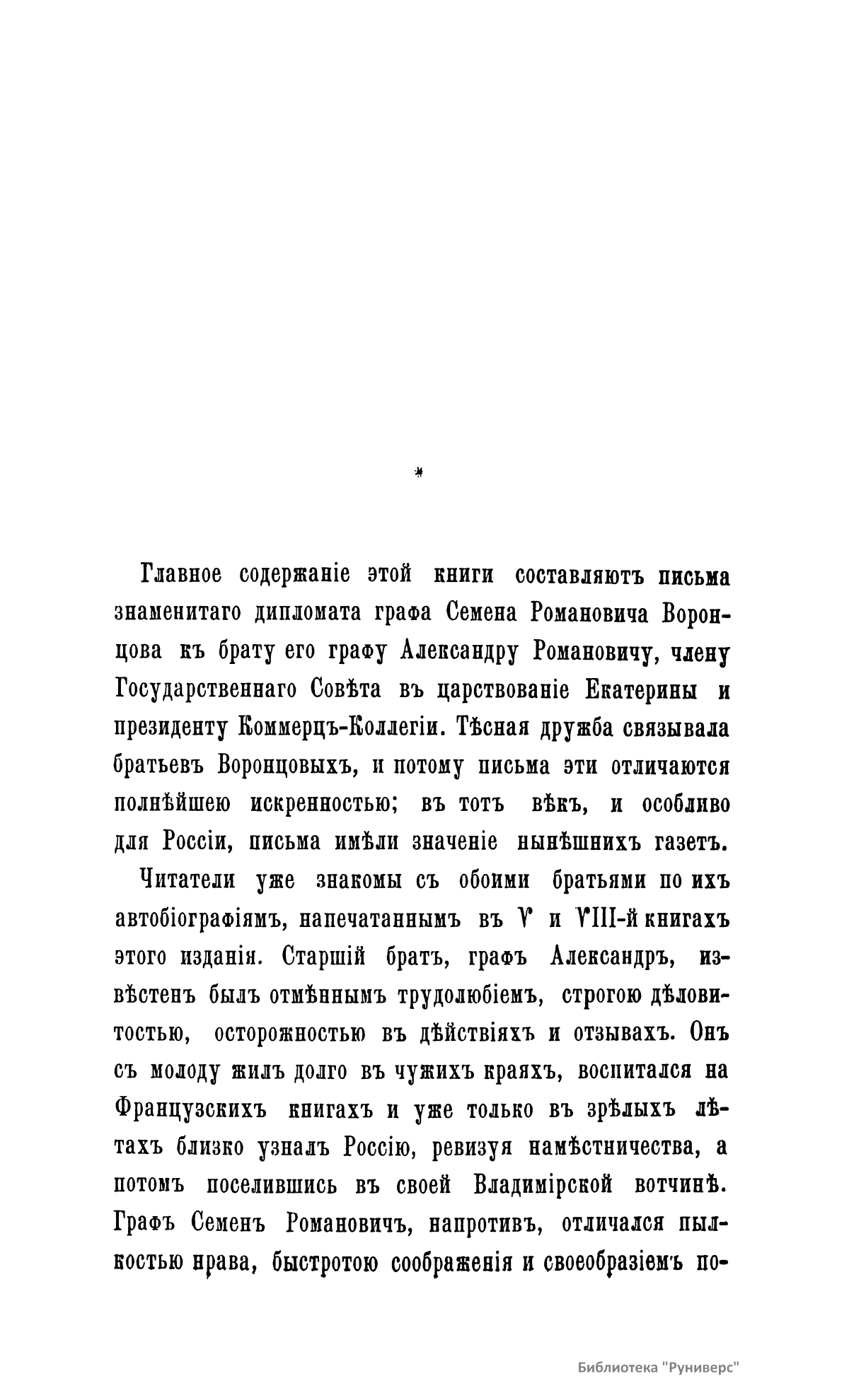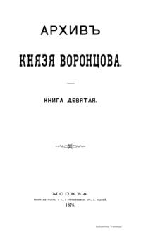 Издание представляет документы из архива графов (с 1845 г. князей) Воронцовых, крупных политических деятелей России XVIII и XIX вв.: Михаила Илларионовича (1714 – 1767) – канцлера при Елизавете Петровне; Романа Илларионовича (1707 – 1783); Александра Романовича (1741 – 1805) – канцлера в 1802 – 1804 гг.; Семена Романовича (1744 – 1832) – посла в Англии в 1785 – 1806 гг.; Михаила Семеновича (1782 – 1856) – фельдмаршала, наместника Кавказа в 1845 – 1853 гг. Архив издан в 40 тт. (1870 – 1895) под редакцией П. И. Бартенева. Содержит огромный материал по внешней политике, по управлению хозяйством Елизаветы Петровны (кн. 1), по делу Миниха и Бирона (кн. 2), о «чумном бунте» 1771 г. в Москве, о движении Е. И. Пугачева (кн. 16), о А. Н. Радищеве (кн. 5, 12, 24). Книга 21-я занята «Записками» Е. Р. Воронцовой (Дашковой). В книге 24-й – свыше 100 писем А. В. Суворова. Среди обширной переписки Воронцовых встречаются письма Вольтера, Д'Аламбера, Жозефа де Местра, Костюшки, Талейрана, Питта и др.