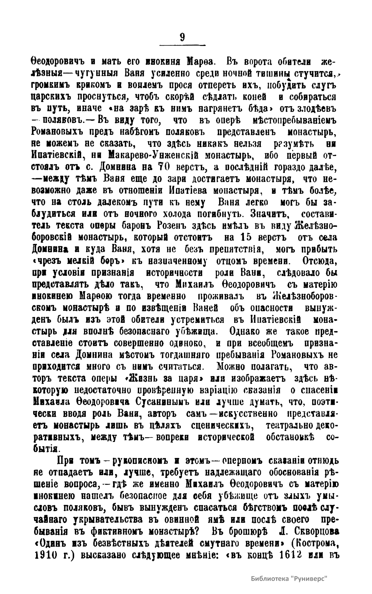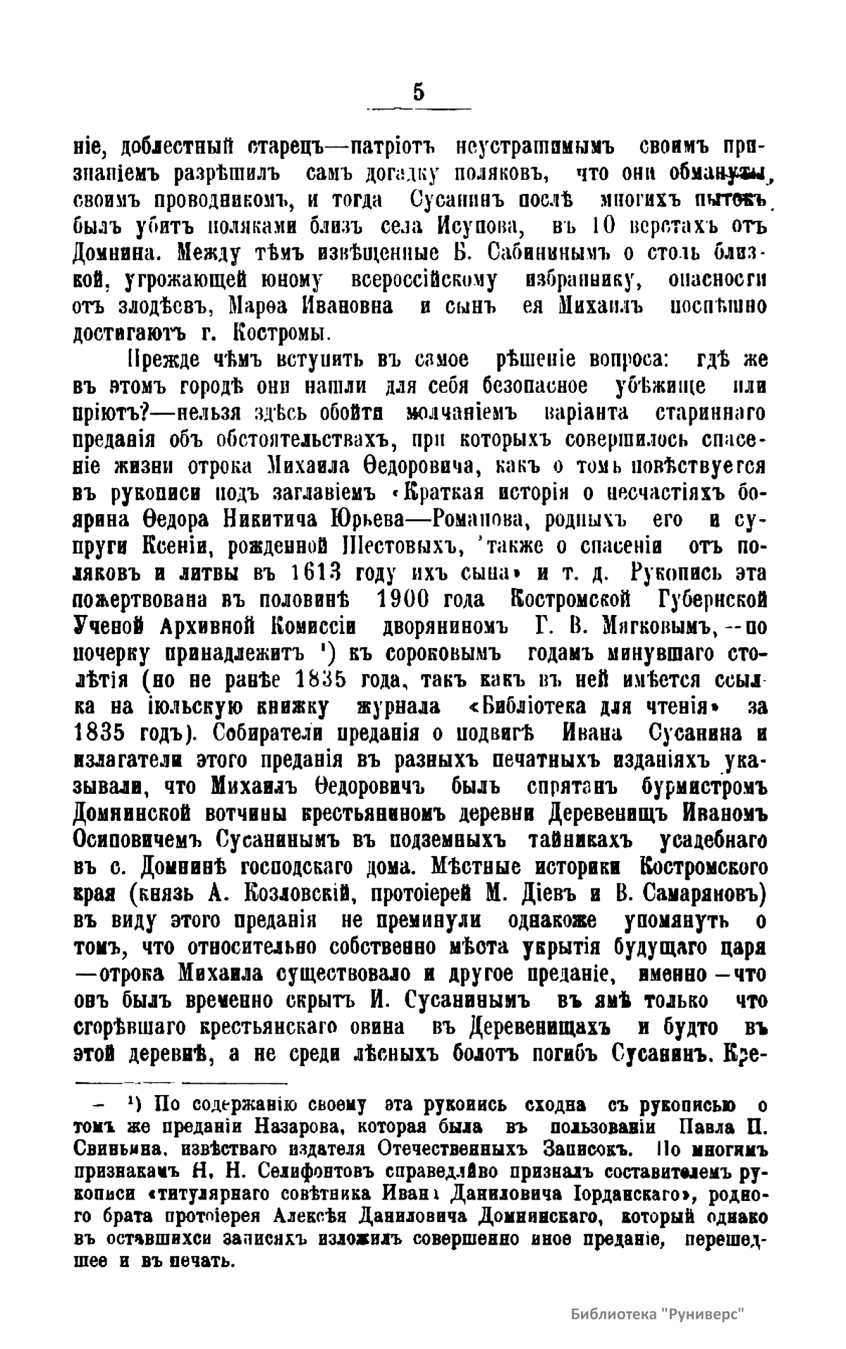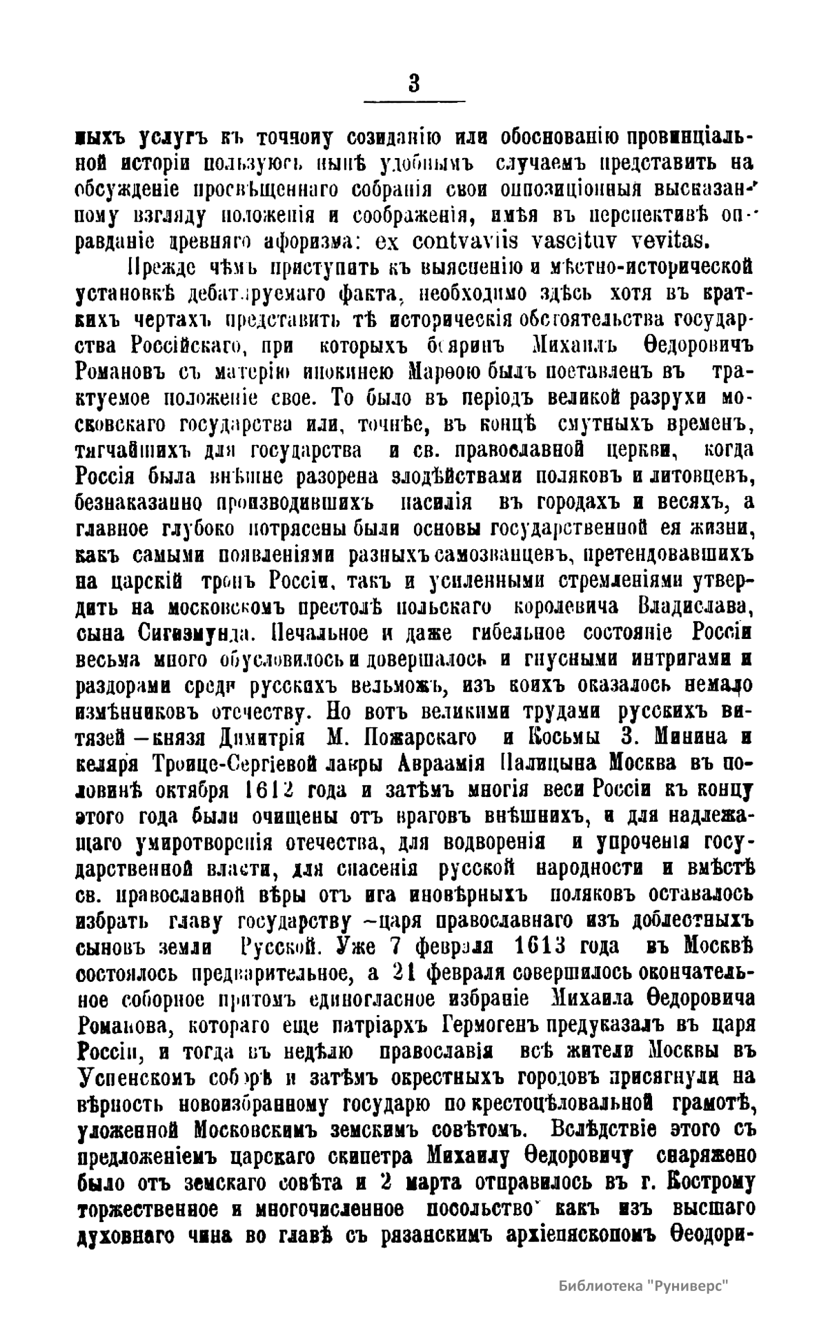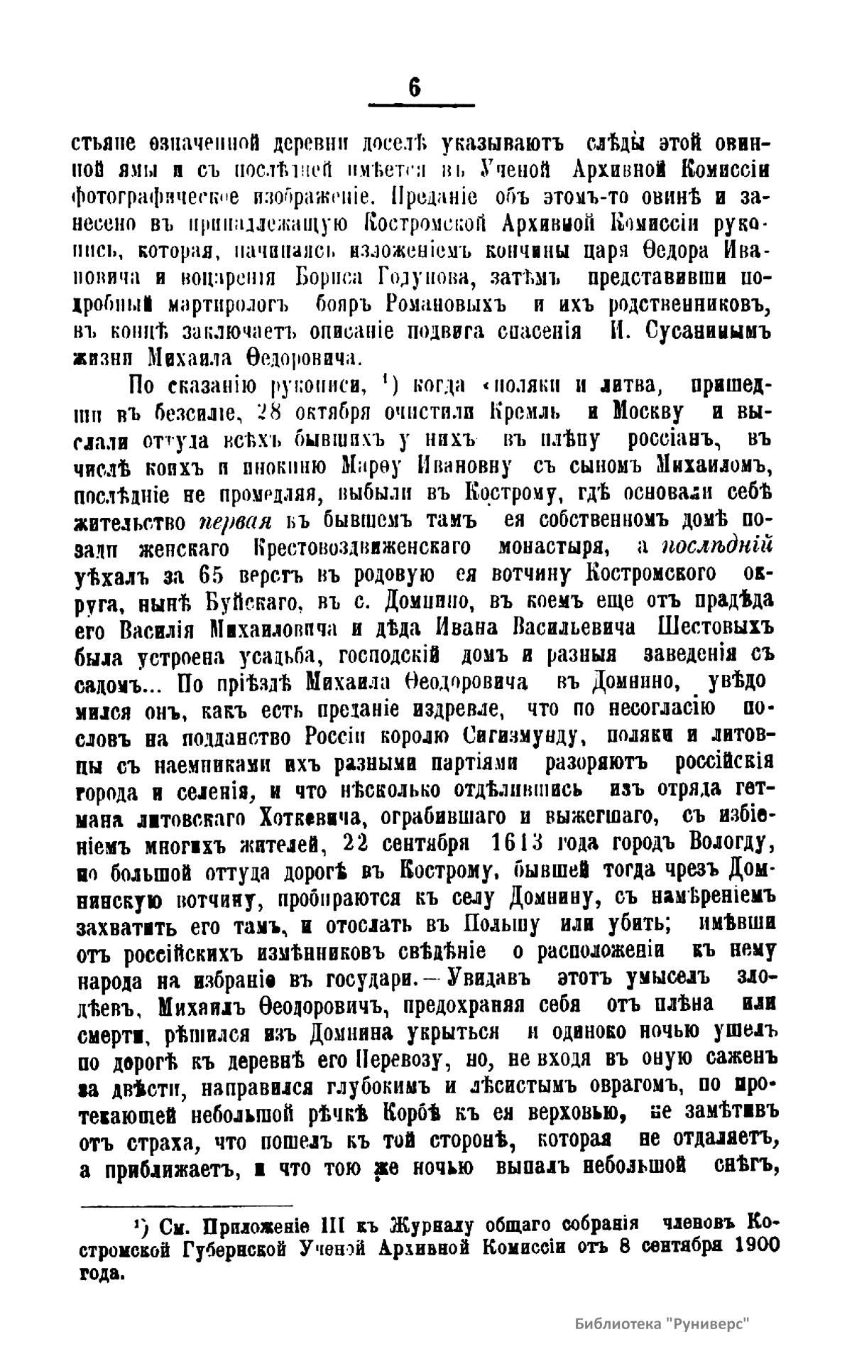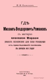 Романовы – боярский род в России XIV – XVI вв., потомки выходца из Литвы Андрея Кобылы. До начала XVI в. именовались Кошкиными, до конца XVI в. – Захарьиными. С 1613 г. царская, с 1721 г. – императорская династия. Михаил Федорович – первый царь из рода Романовых. Настоящее издание подготовлено к трехсотлетней годовщине царствования Дома Романовых. Издатель считает необходимым к предстоящему юбилею установить с исторической точностью разные эпизоды, относящиеся к обстоятельствам избрания и воцарения Михаила Федоровича, и, в частности, проясняет вопрос, где Михаил Федорович Романов с матерью инокинею Марфою нашел безопасное для себя убежище от преследований поляков в начале 1613 года.